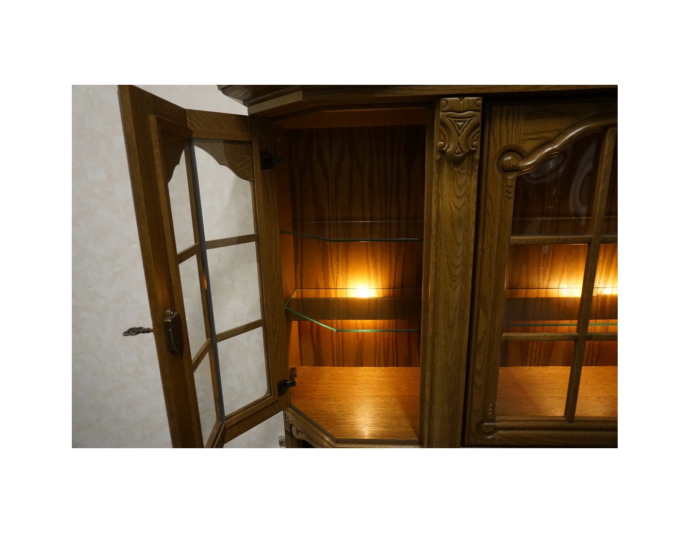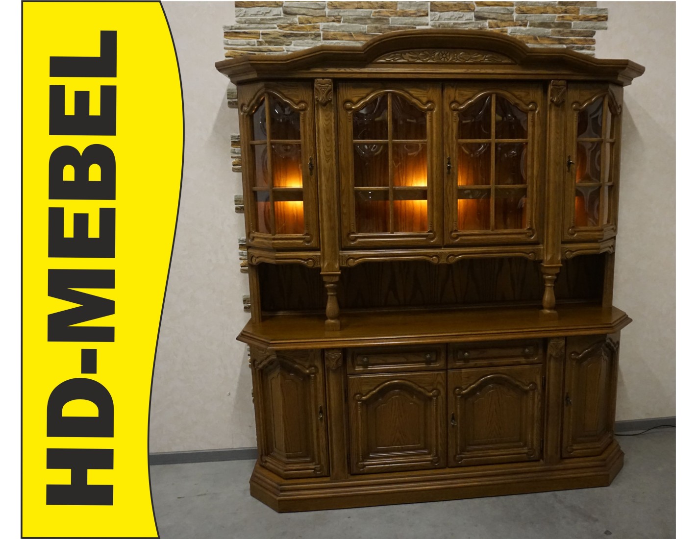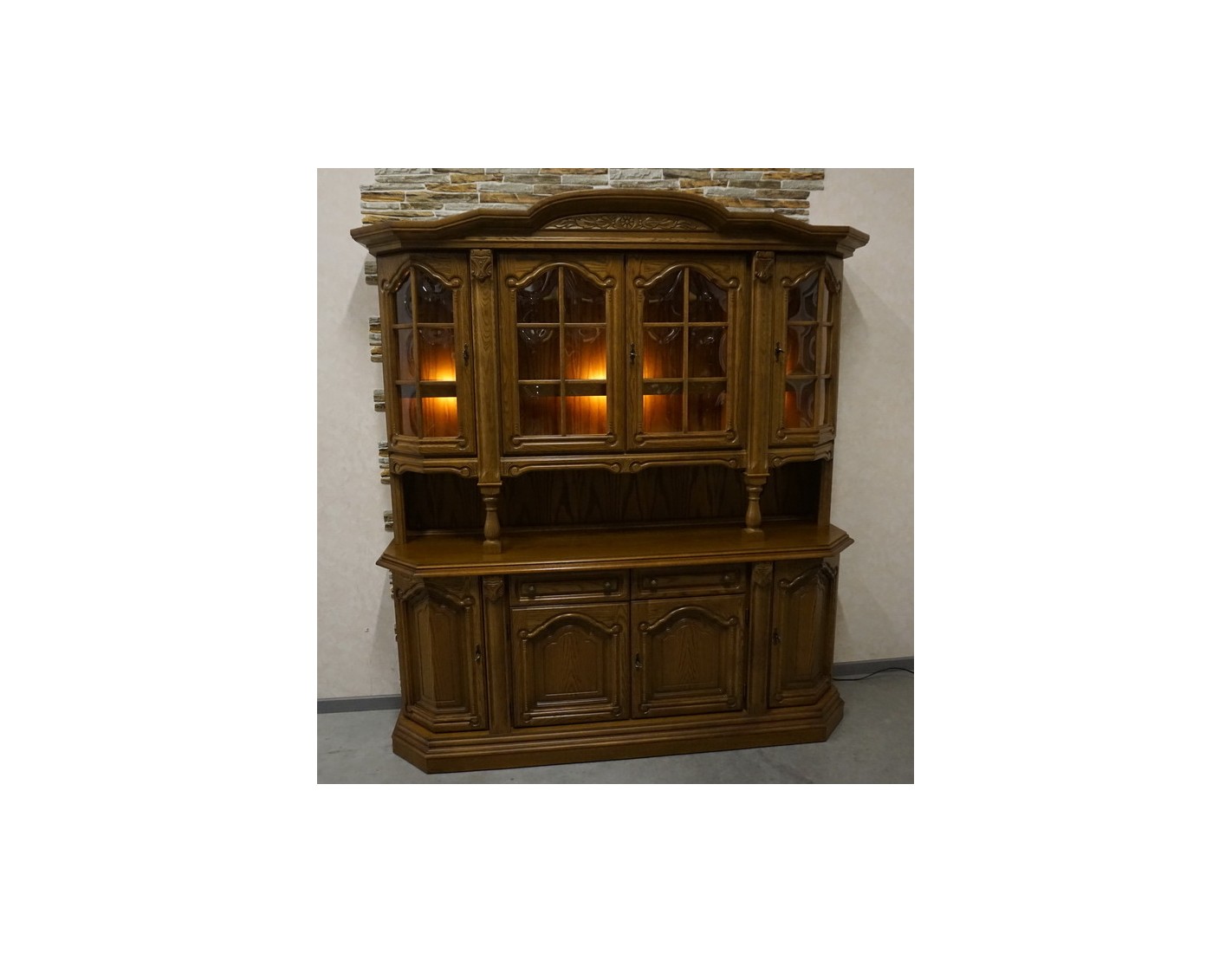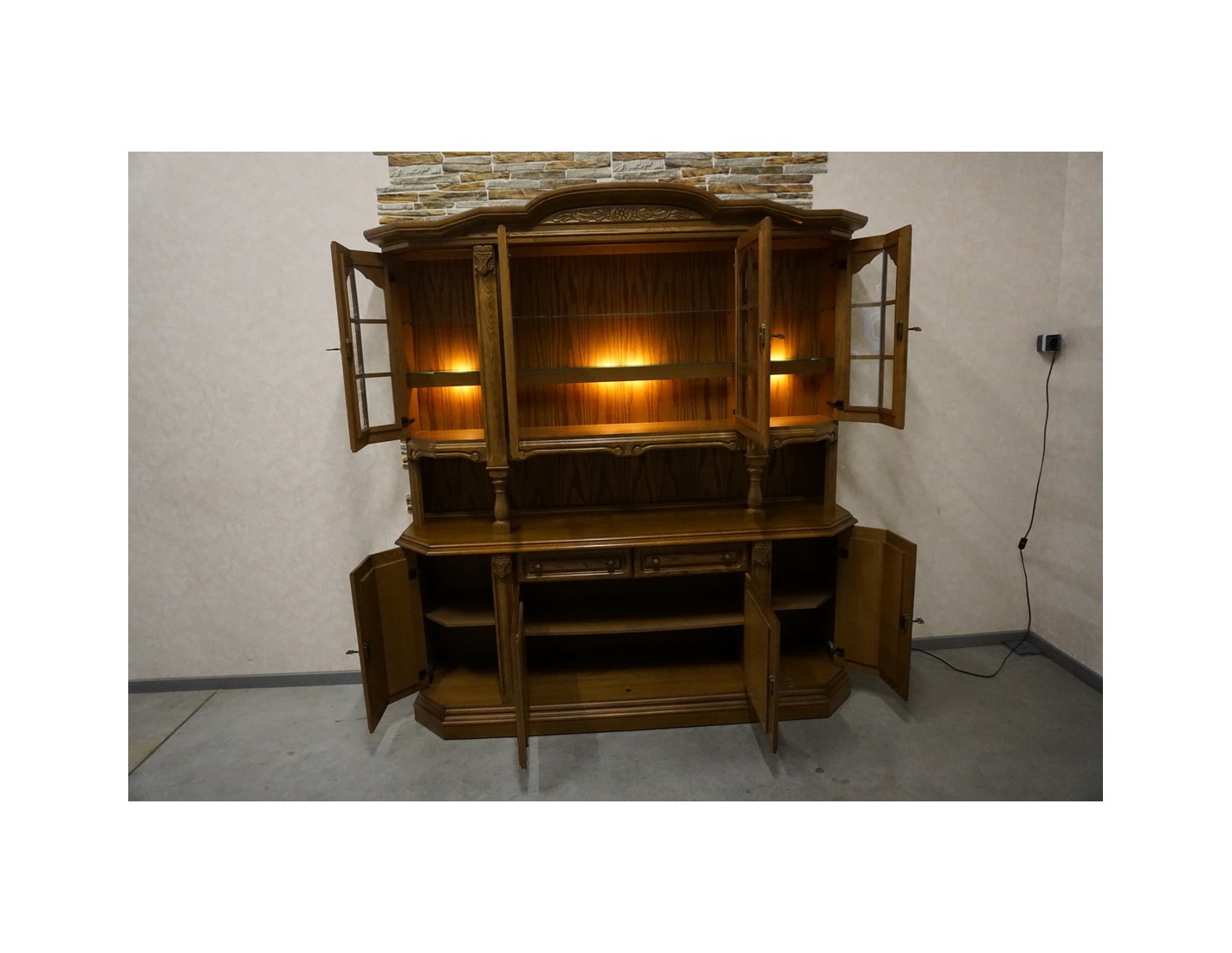 Elegancka i funkcjonalna witryna z komodą, wyposażona w podświetlane półki, które nadają wnętrzu nowoczesnego i przytulnego charakteru. Idealna do ekspozycji dekoracji i przechowywania niezbędnych przedmiotów.