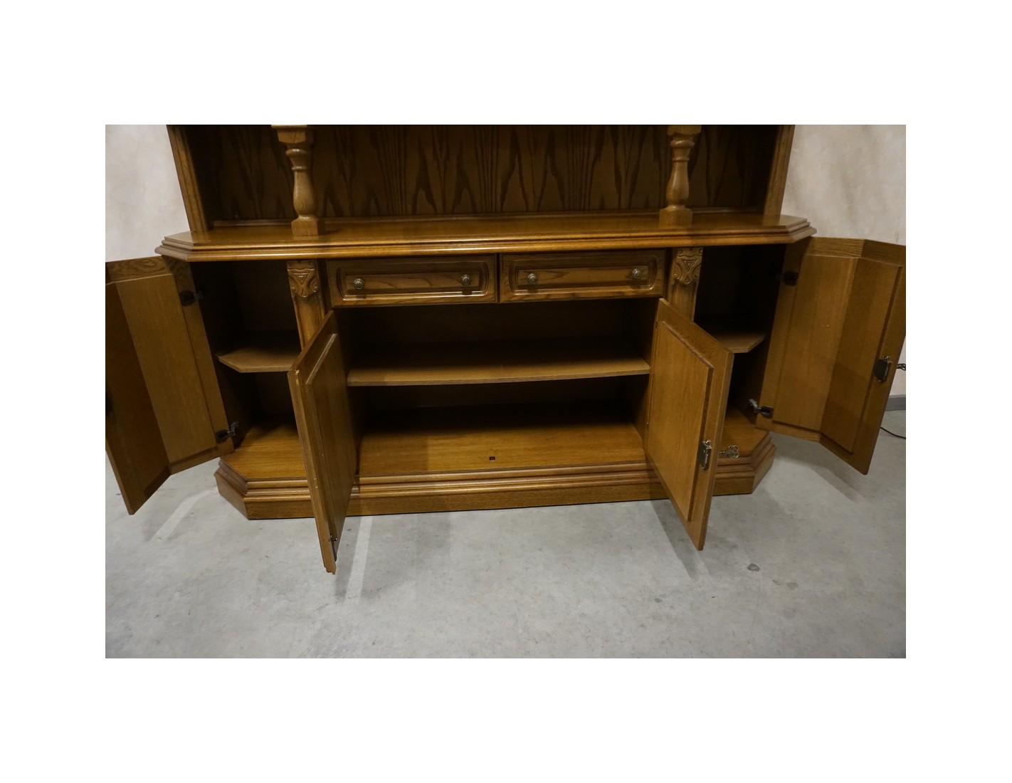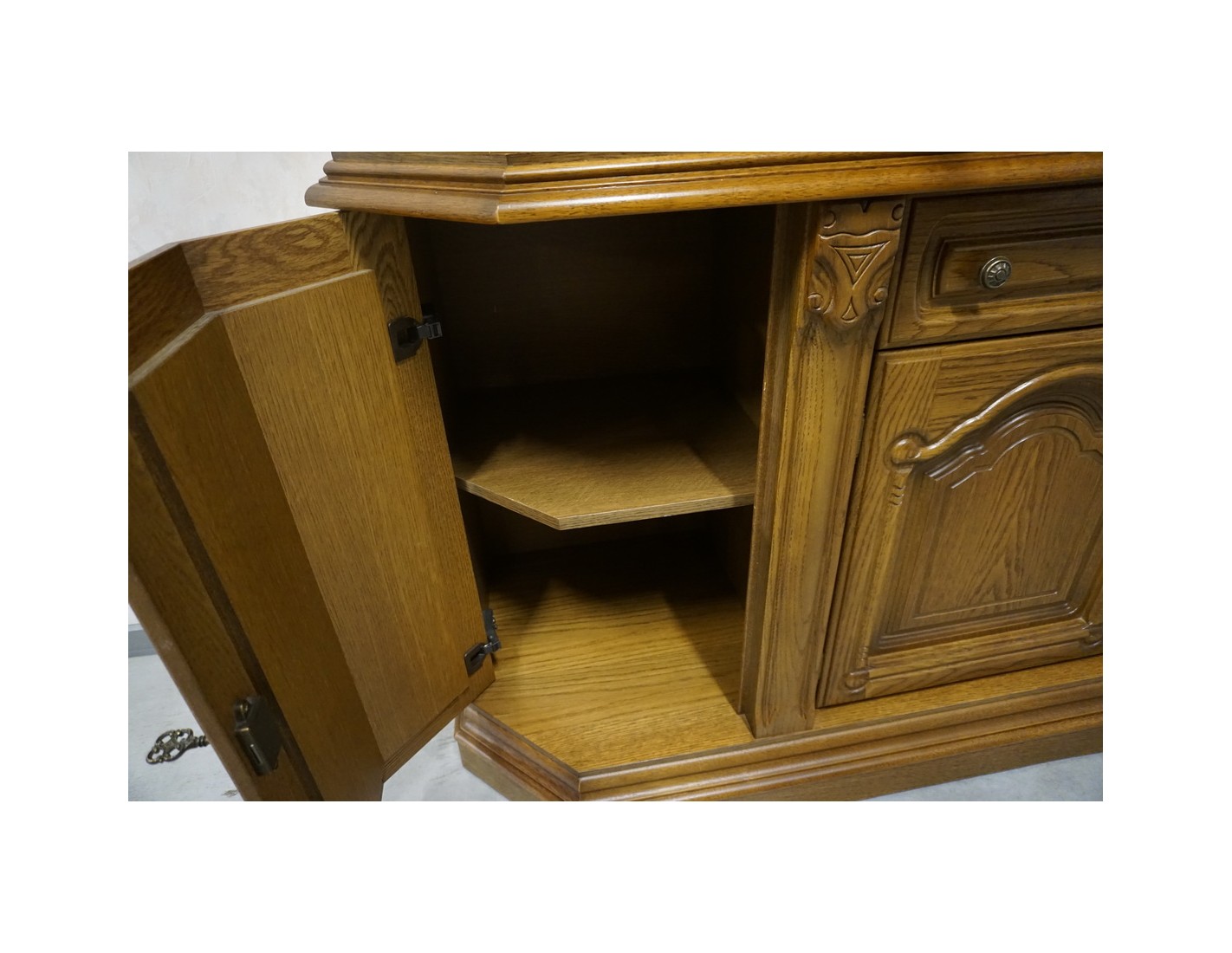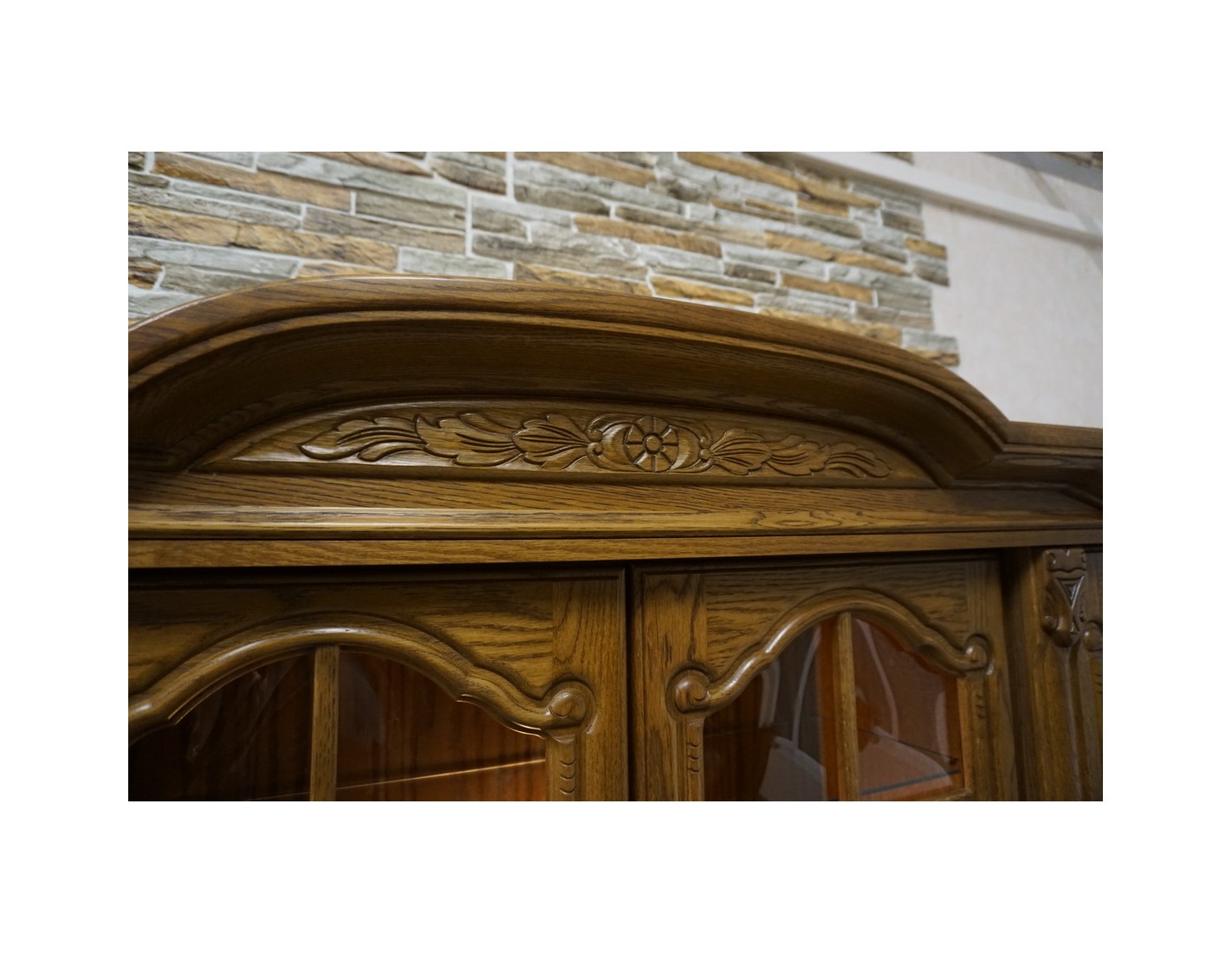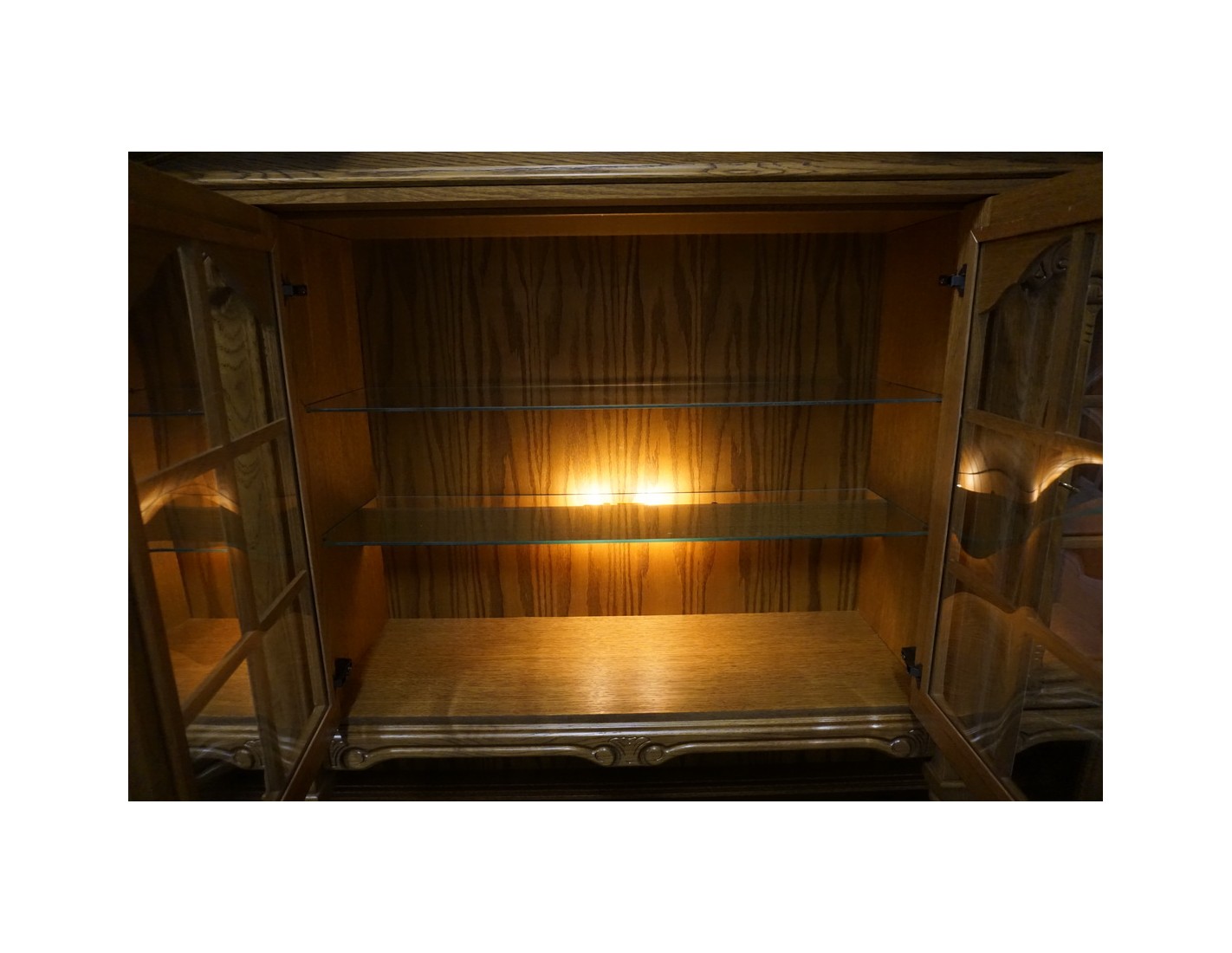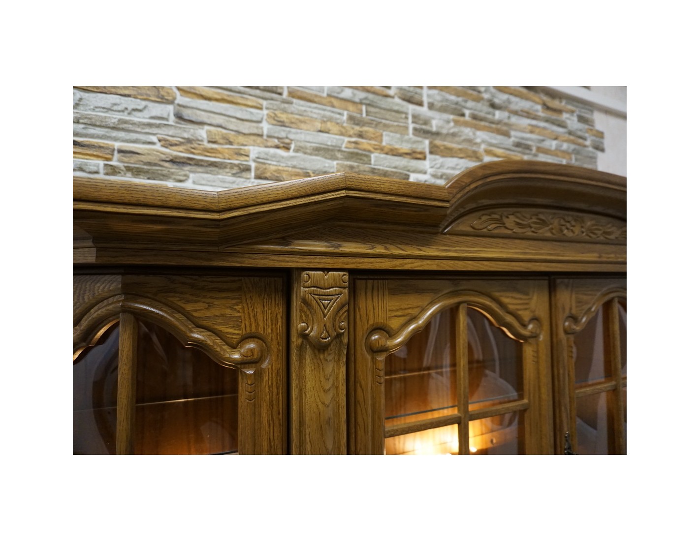 Elegancka i funkcjonalna witryna z komodą, wyposażona w podświetlane półki, które nadają wnętrzu nowoczesnego i przytulnego charakteru. Idealna do ekspozycji dekoracji i przechowywania niezbędnych przedmiotów.