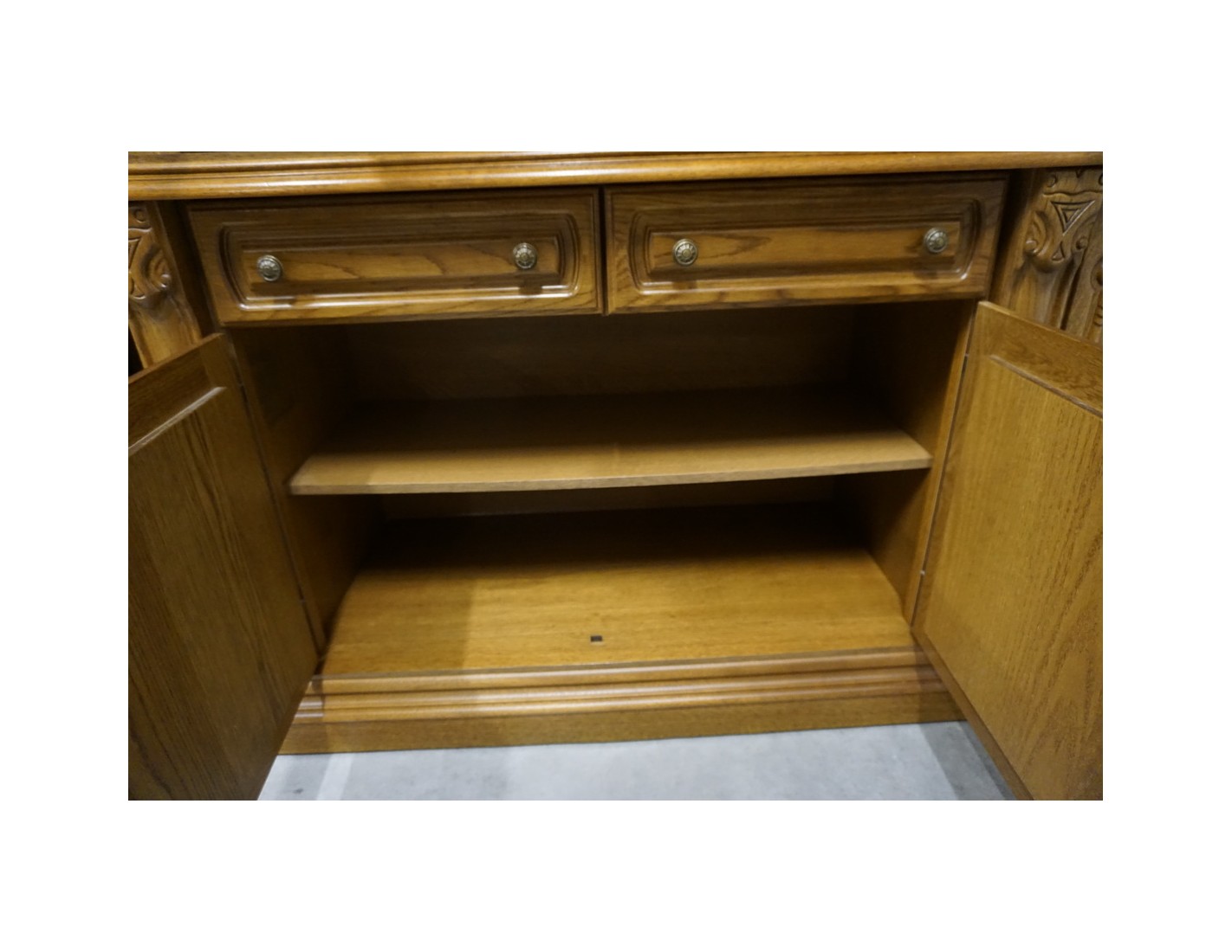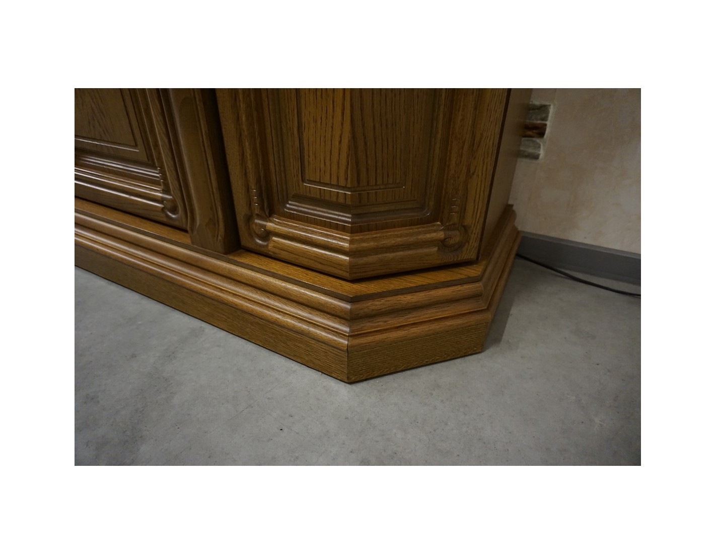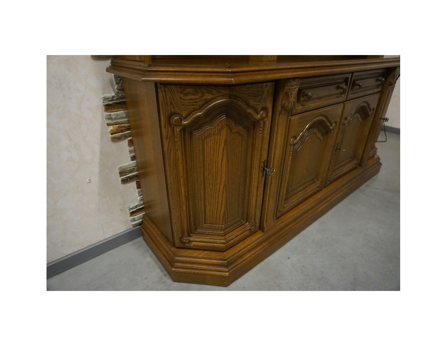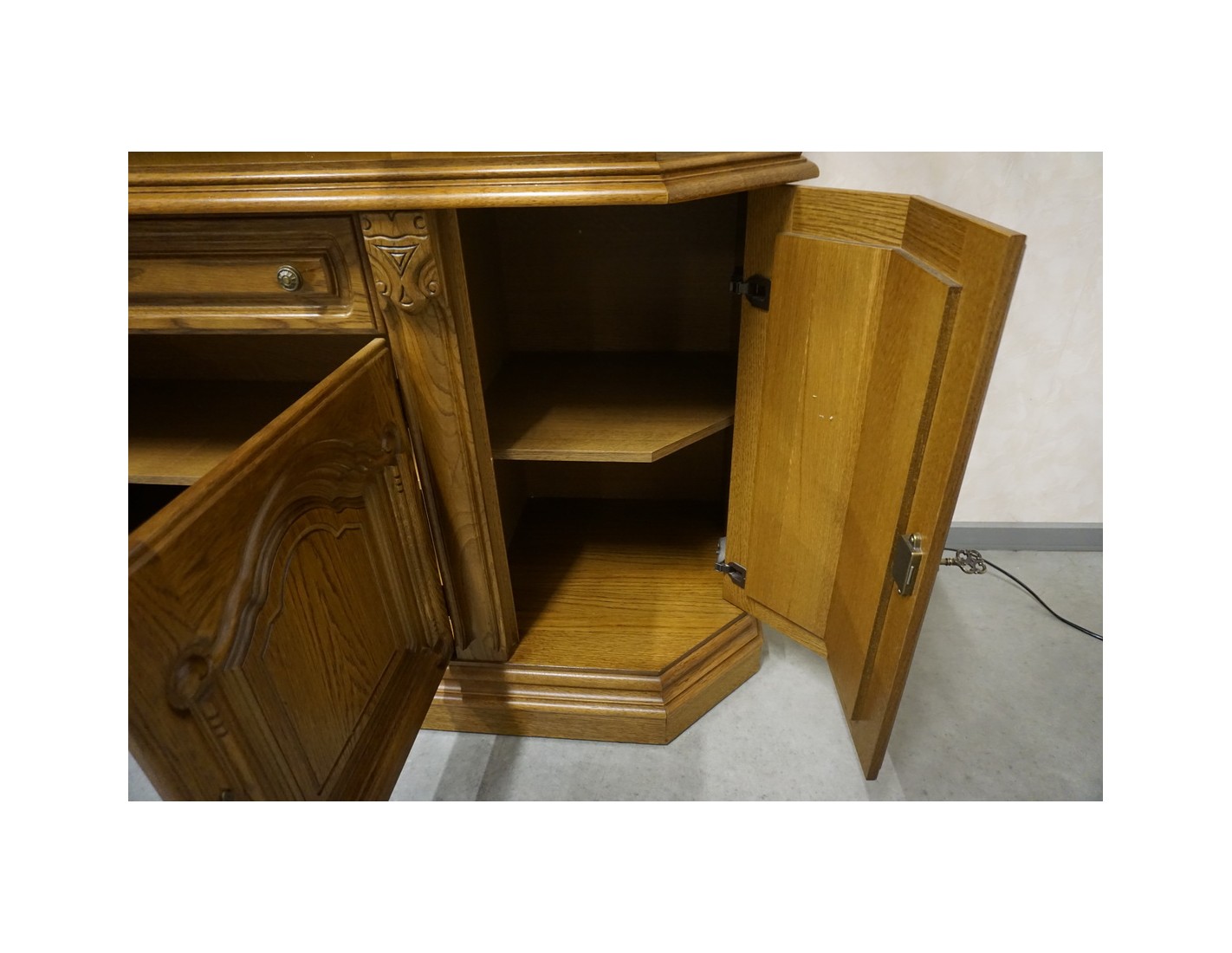 Elegancka i funkcjonalna witryna z komodą, wyposażona w podświetlane półki, które nadają wnętrzu nowoczesnego i przytulnego charakteru. Idealna do ekspozycji dekoracji i przechowywania niezbędnych przedmiotów.