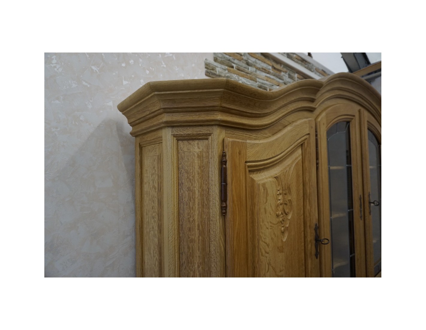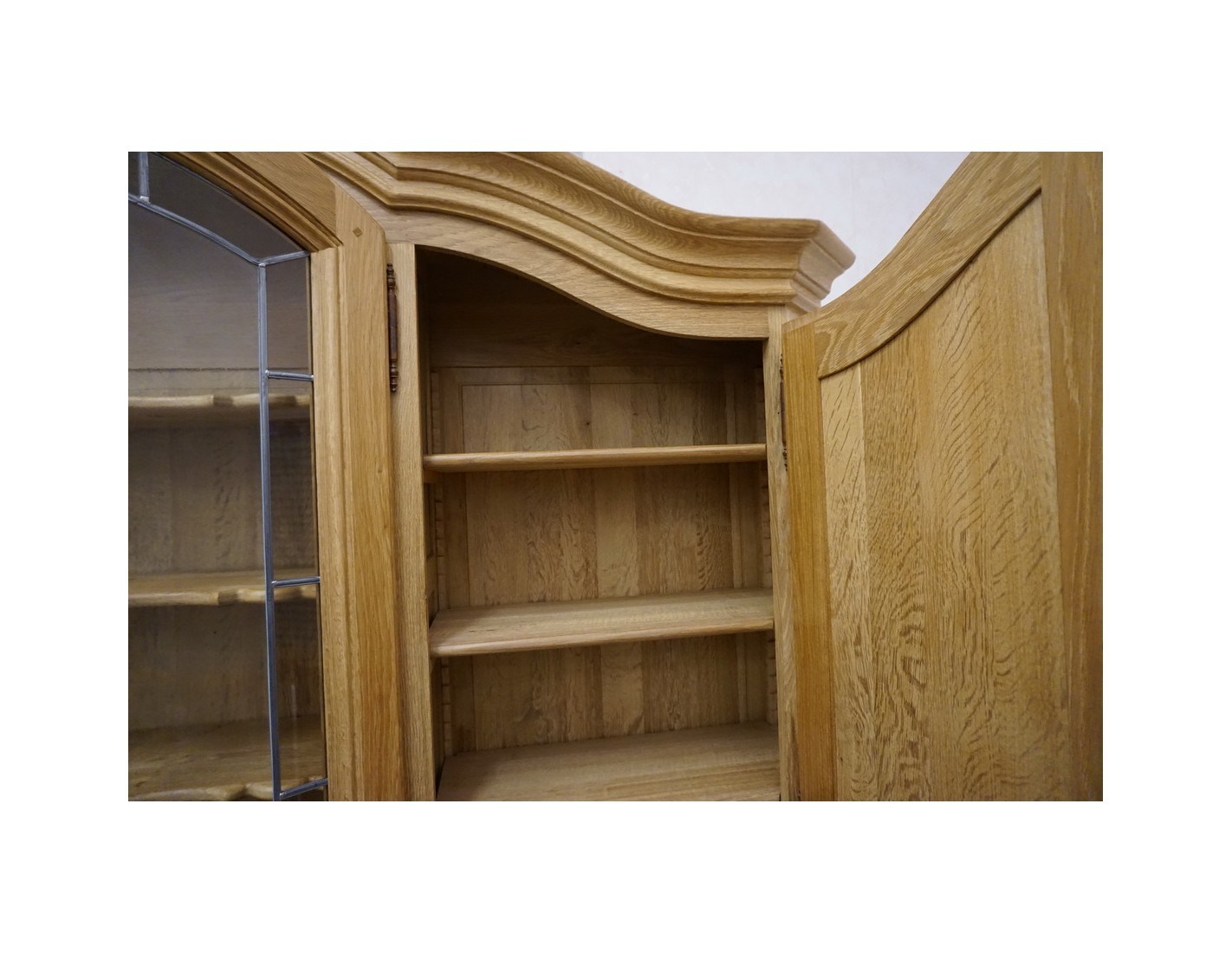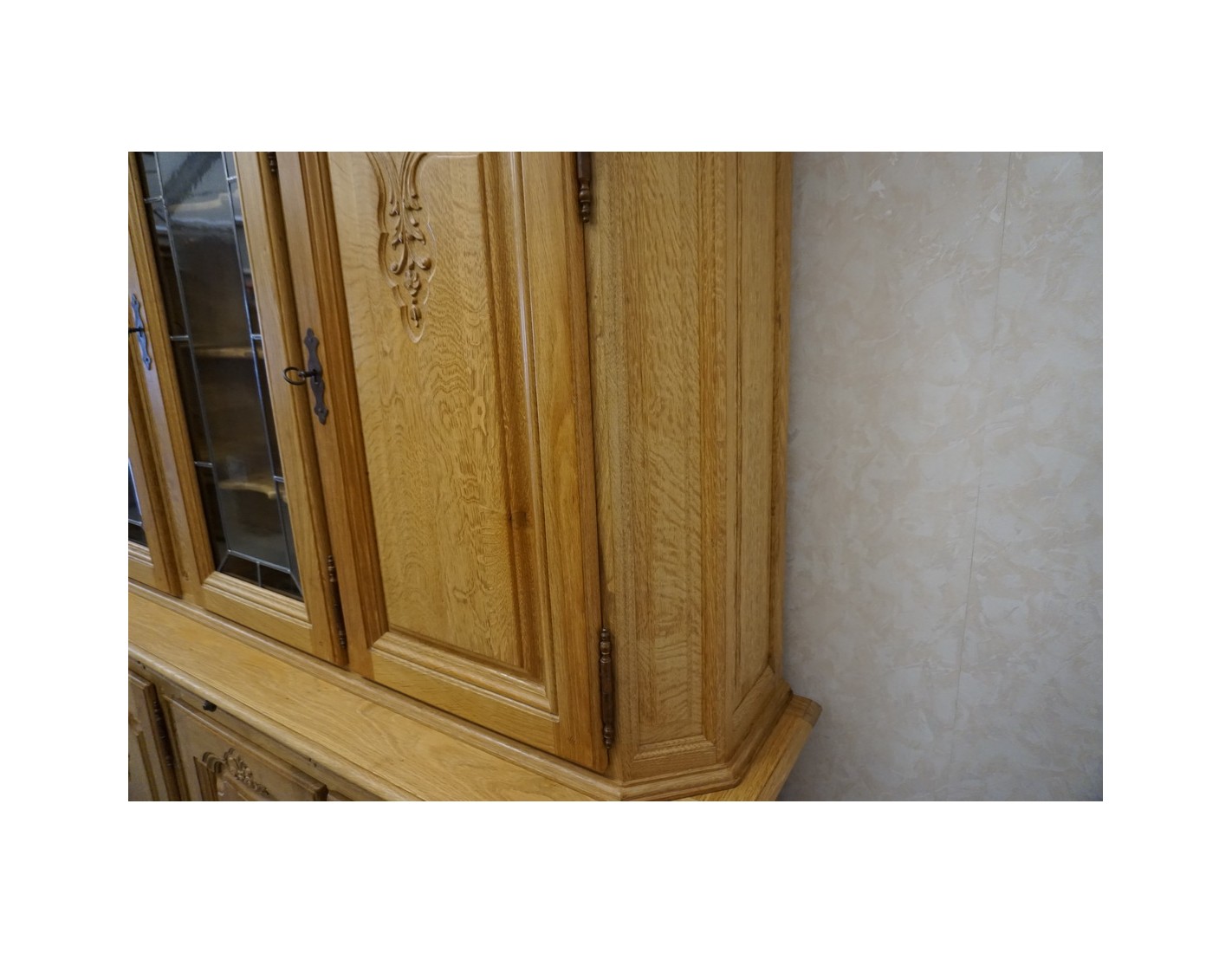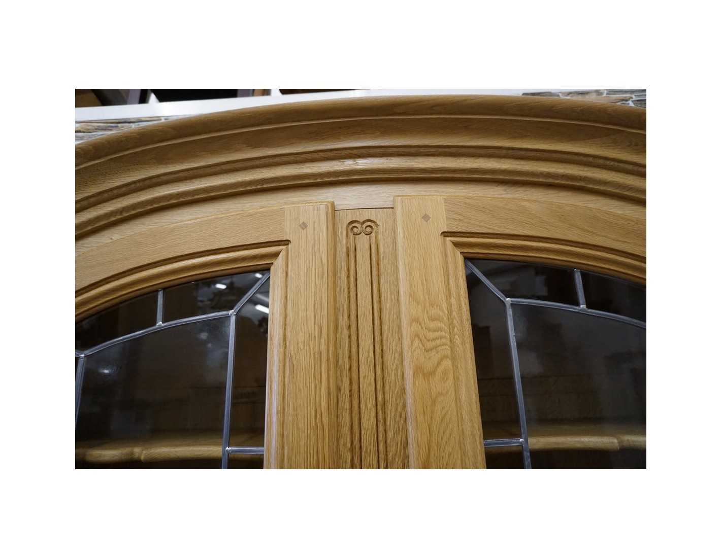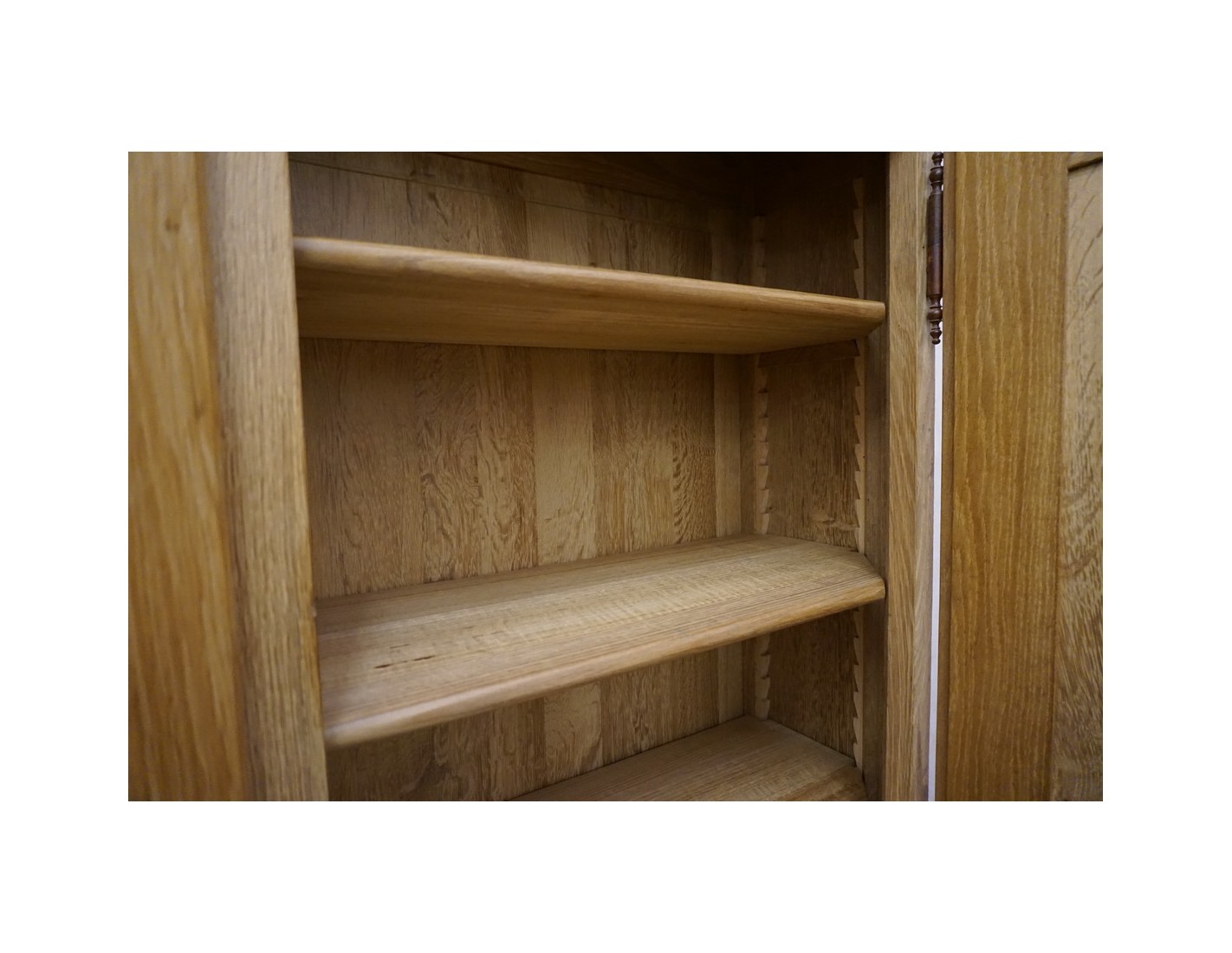 Okazała witryna z komodą z litego dębu to doskonały wybór do przestronnych wnętrz, takich jak salon, jadalnia czy biblioteka. Została wyposażona w osiem drzwiczek oraz cztery pojemne szuflady, co zapewnia ogromną ilość miejsca do przechowywania oraz eksponowania przedmiotów. Klasyczna forma i solidne wykonanie podkreślają prestiżowy charakter mebla.