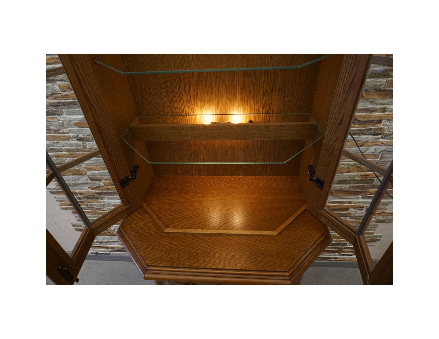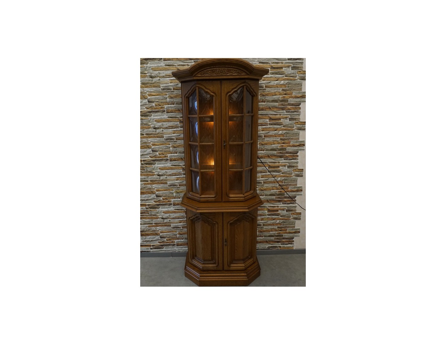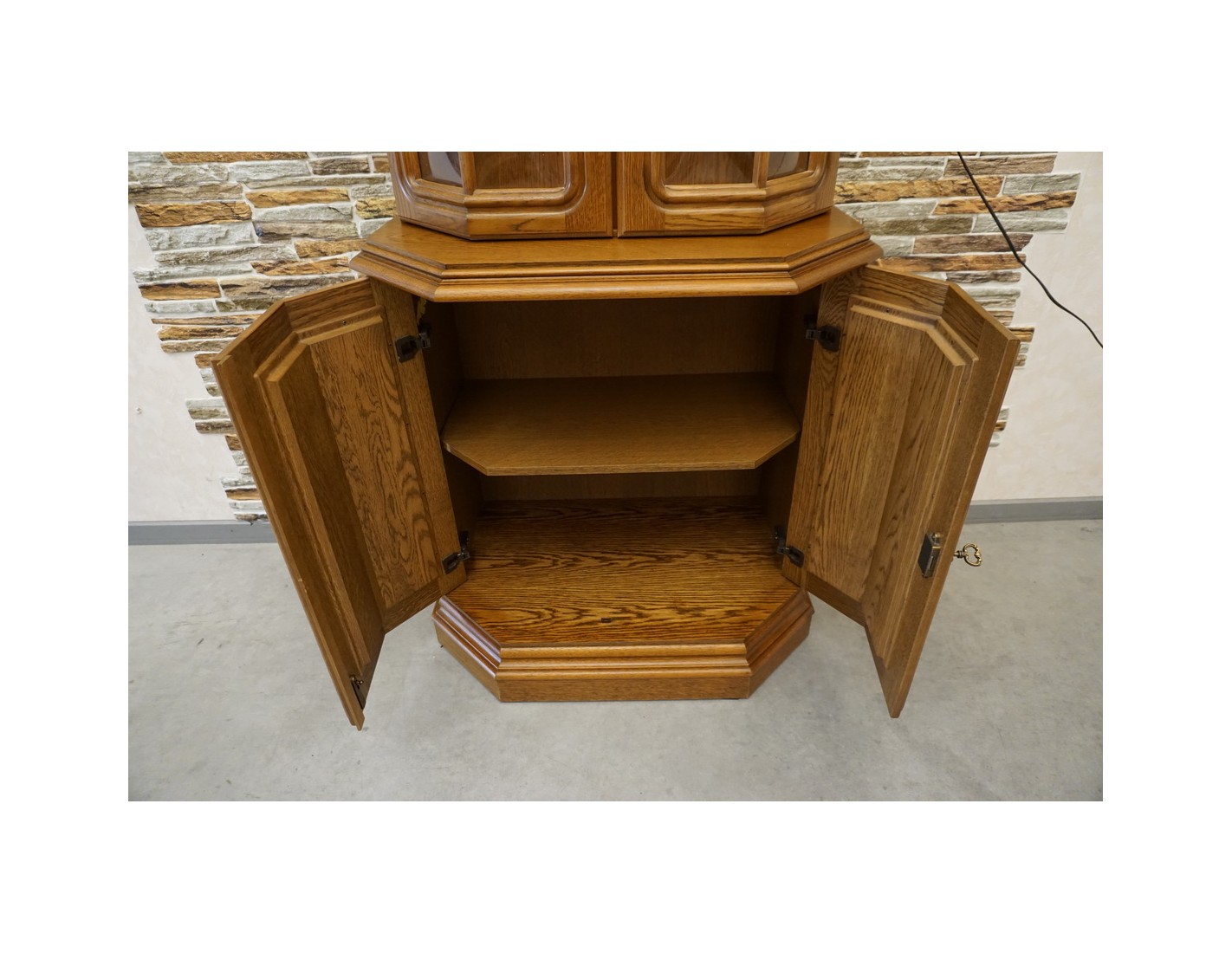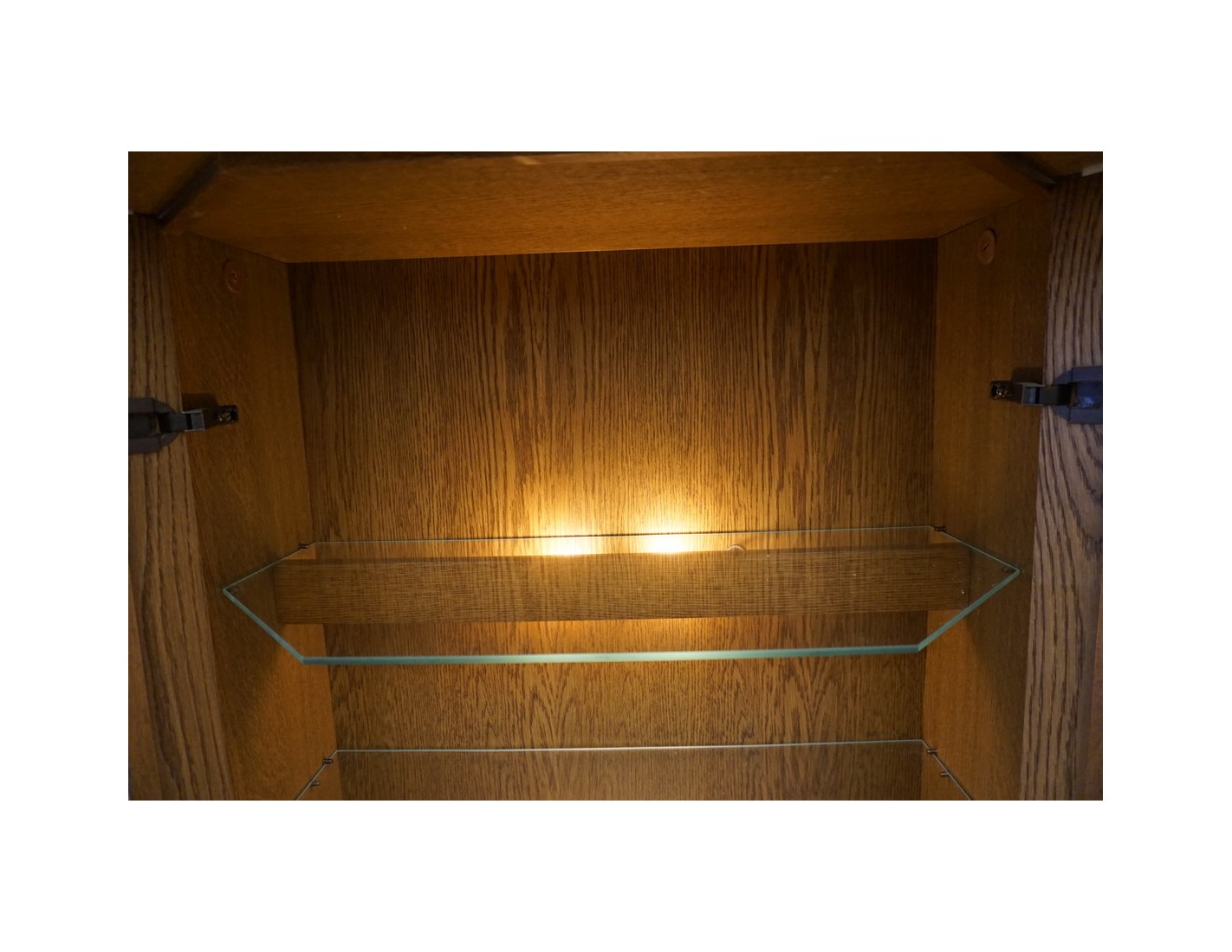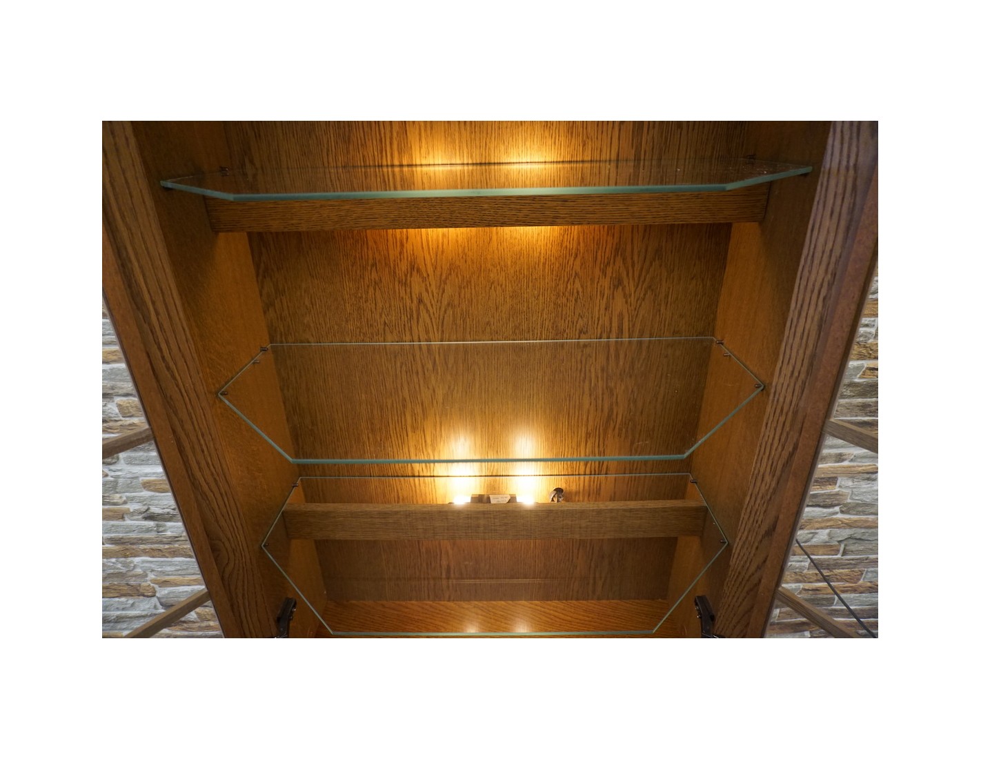 Elegancka podświetlana witryna dębowa o smukłej konstrukcji. Wyposażona w przeszkloną górną część z solidnymi, szklanymi półkami, które efektownie eksponują przechowywane przedmioty. Idealna do salonu, jadalni lub gabinetu.