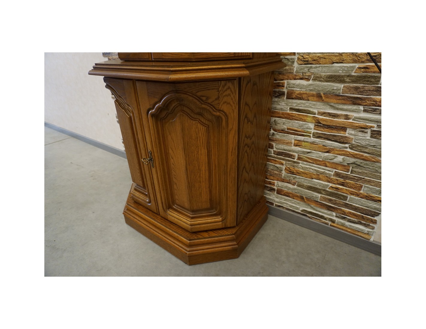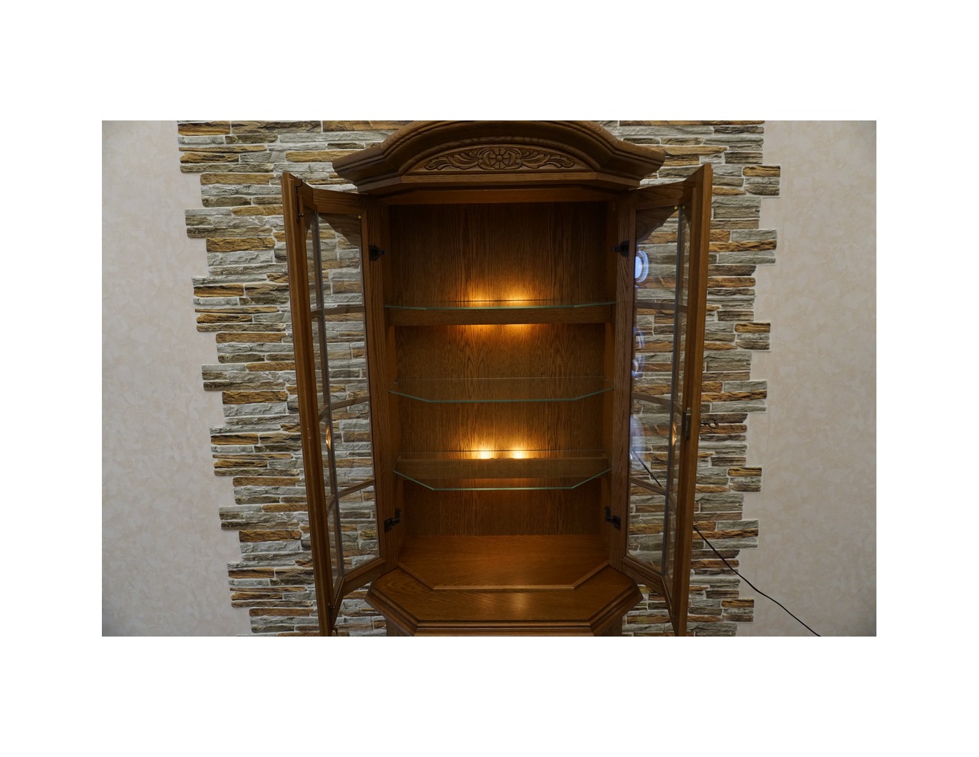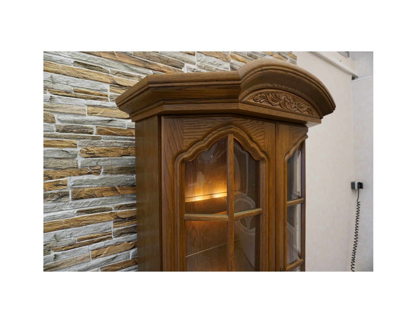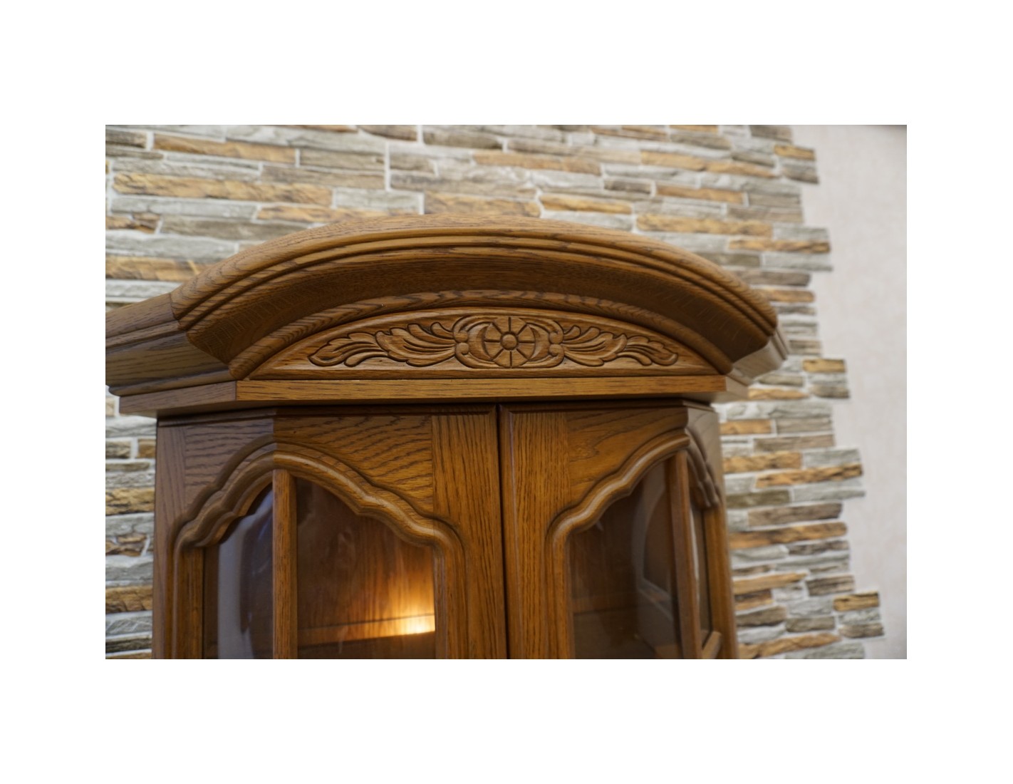 Elegancka podświetlana witryna dębowa o smukłej konstrukcji. Wyposażona w przeszkloną górną część z solidnymi, szklanymi półkami, które efektownie eksponują przechowywane przedmioty. Idealna do salonu, jadalni lub gabinetu.