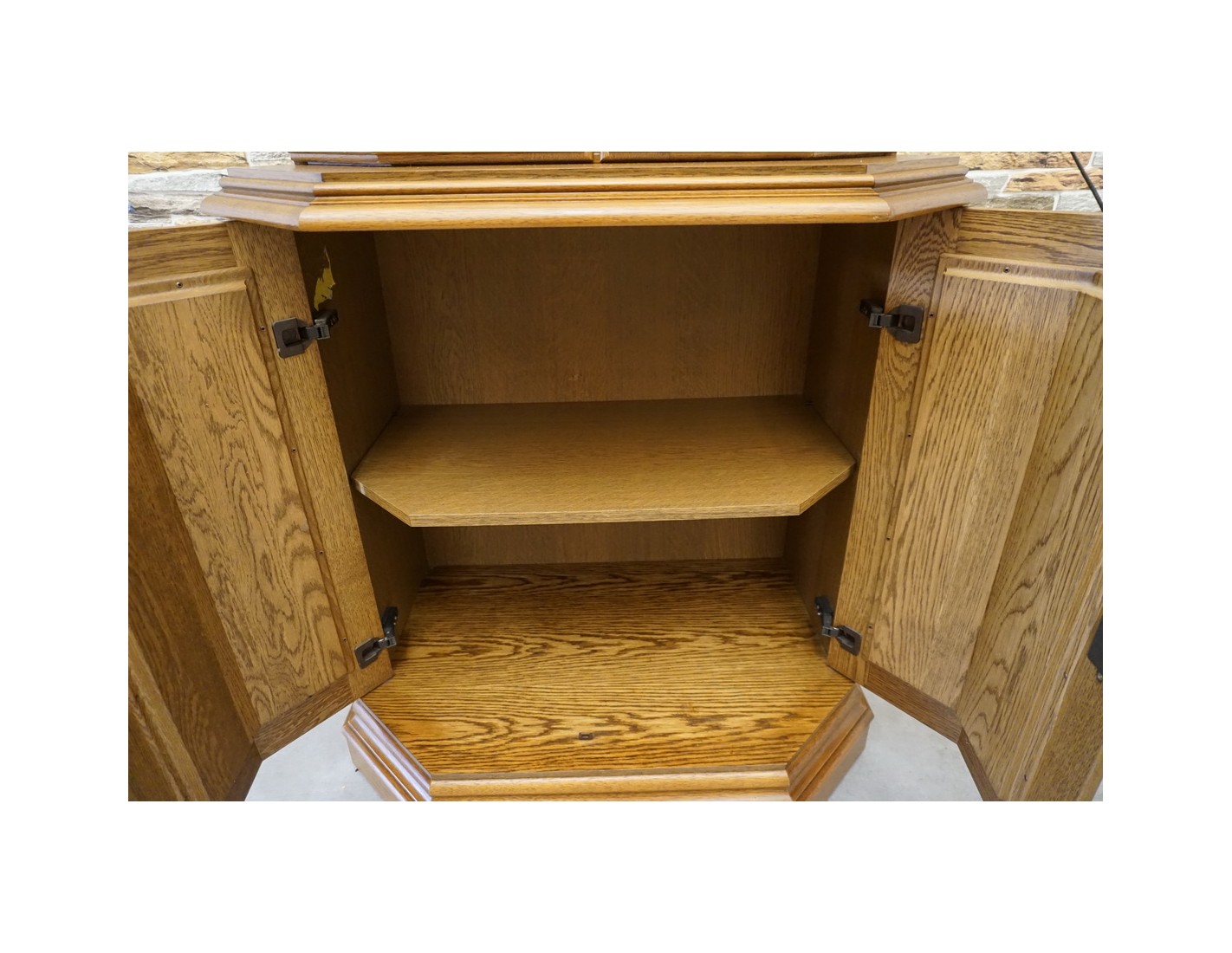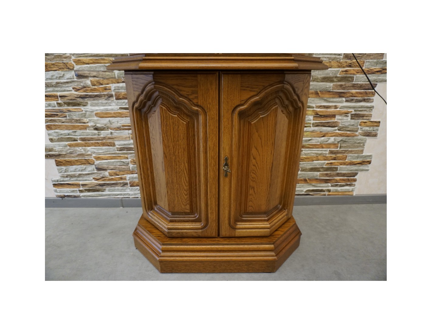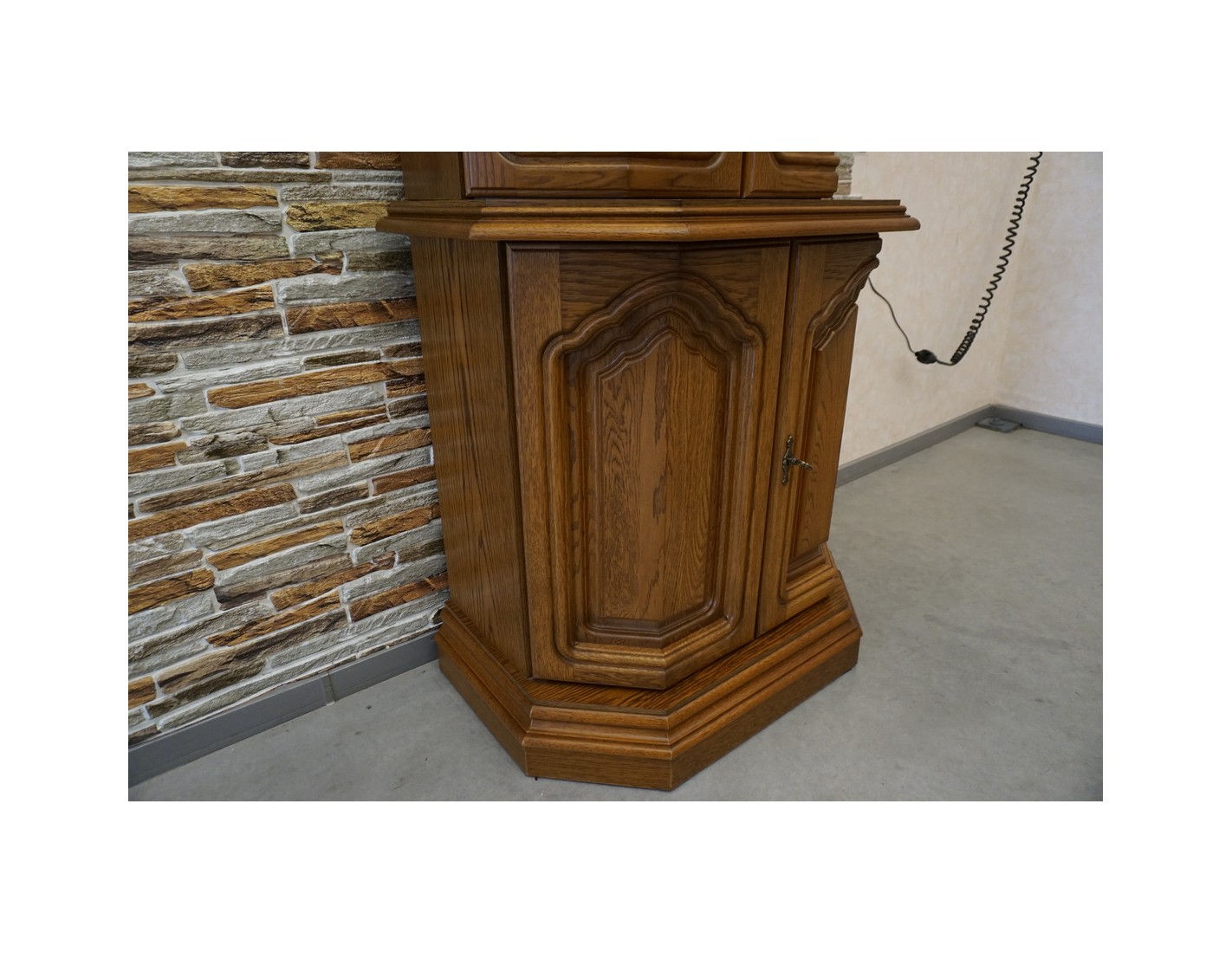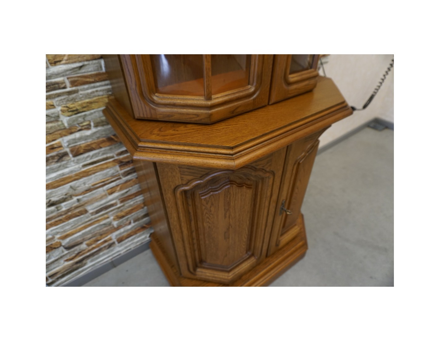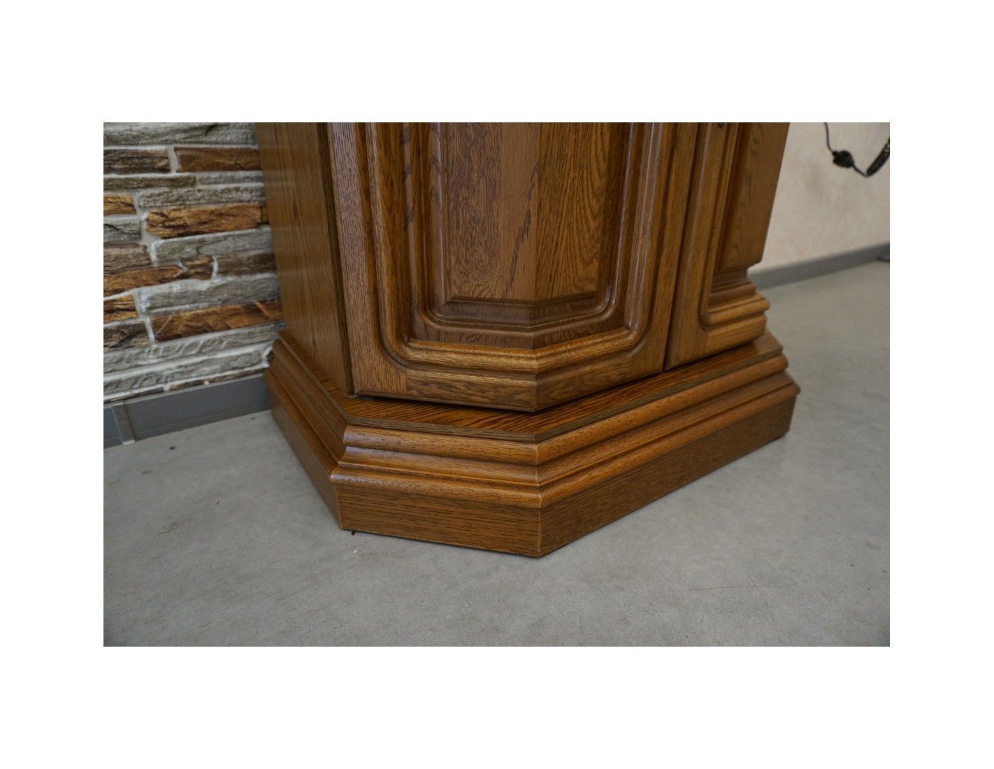 Elegancka podświetlana witryna dębowa o smukłej konstrukcji. Wyposażona w przeszkloną górną część z solidnymi, szklanymi półkami, które efektownie eksponują przechowywane przedmioty. Idealna do salonu, jadalni lub gabinetu.