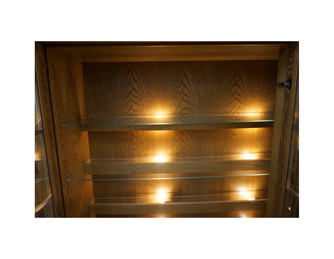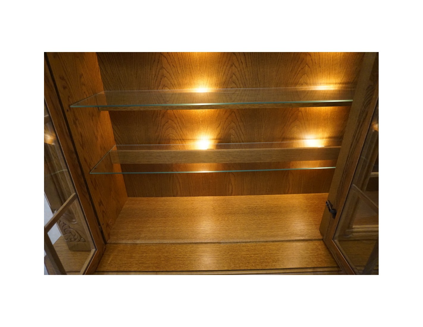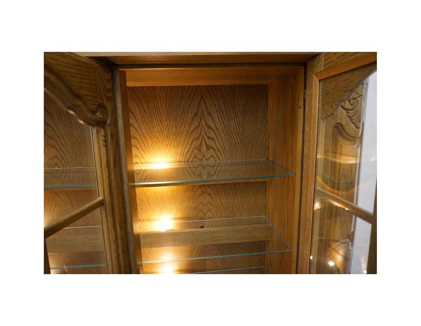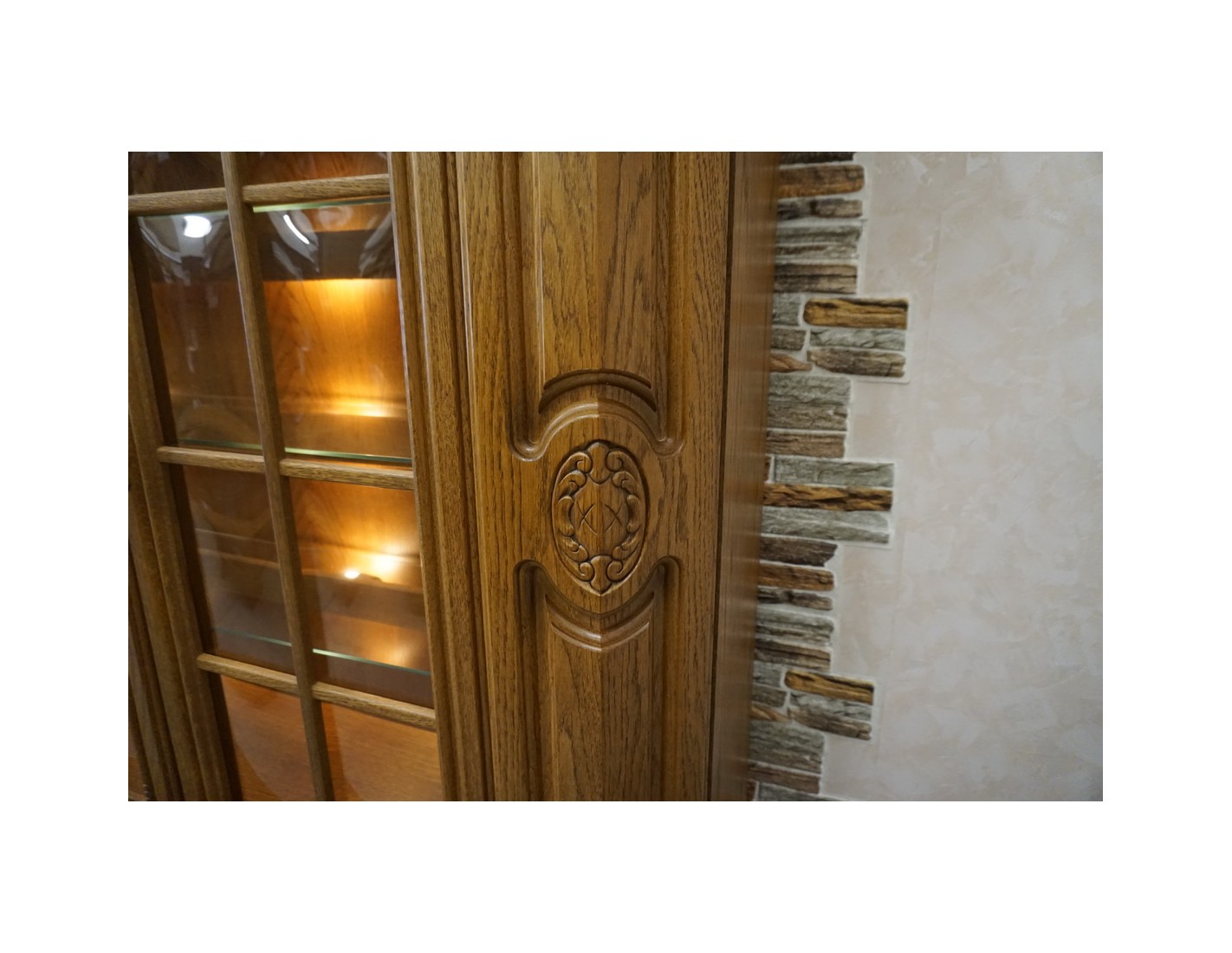 Elegancka witryna z komodą wykonana z dębu, łącząca funkcjonalność i ponadczasowy styl. Podświetlane wnętrze podkreśla ekspozycję przedmiotów w górnej części, a pojemna komoda zapewnia miejsce na przechowywanie akcesoriów i dokumentów.