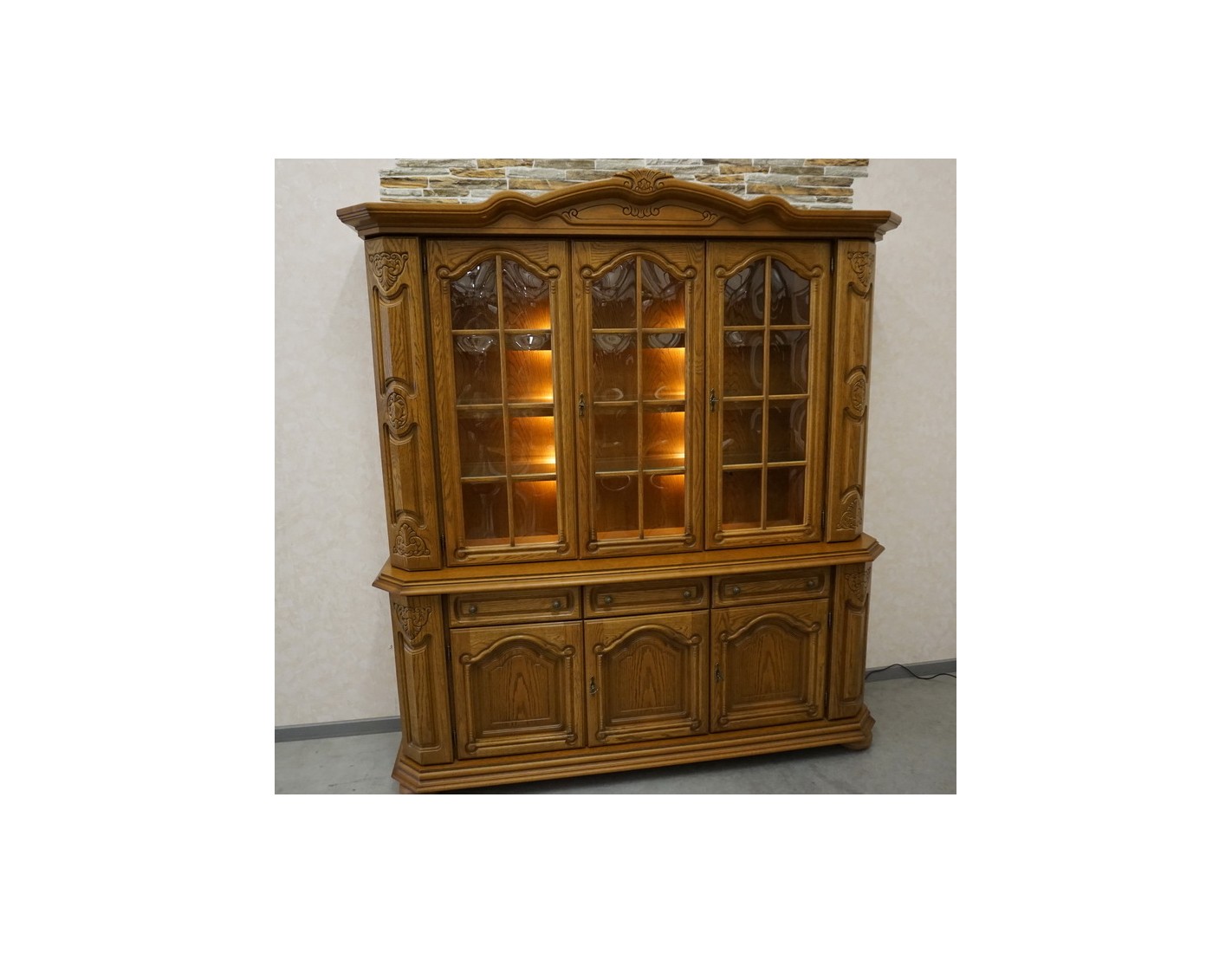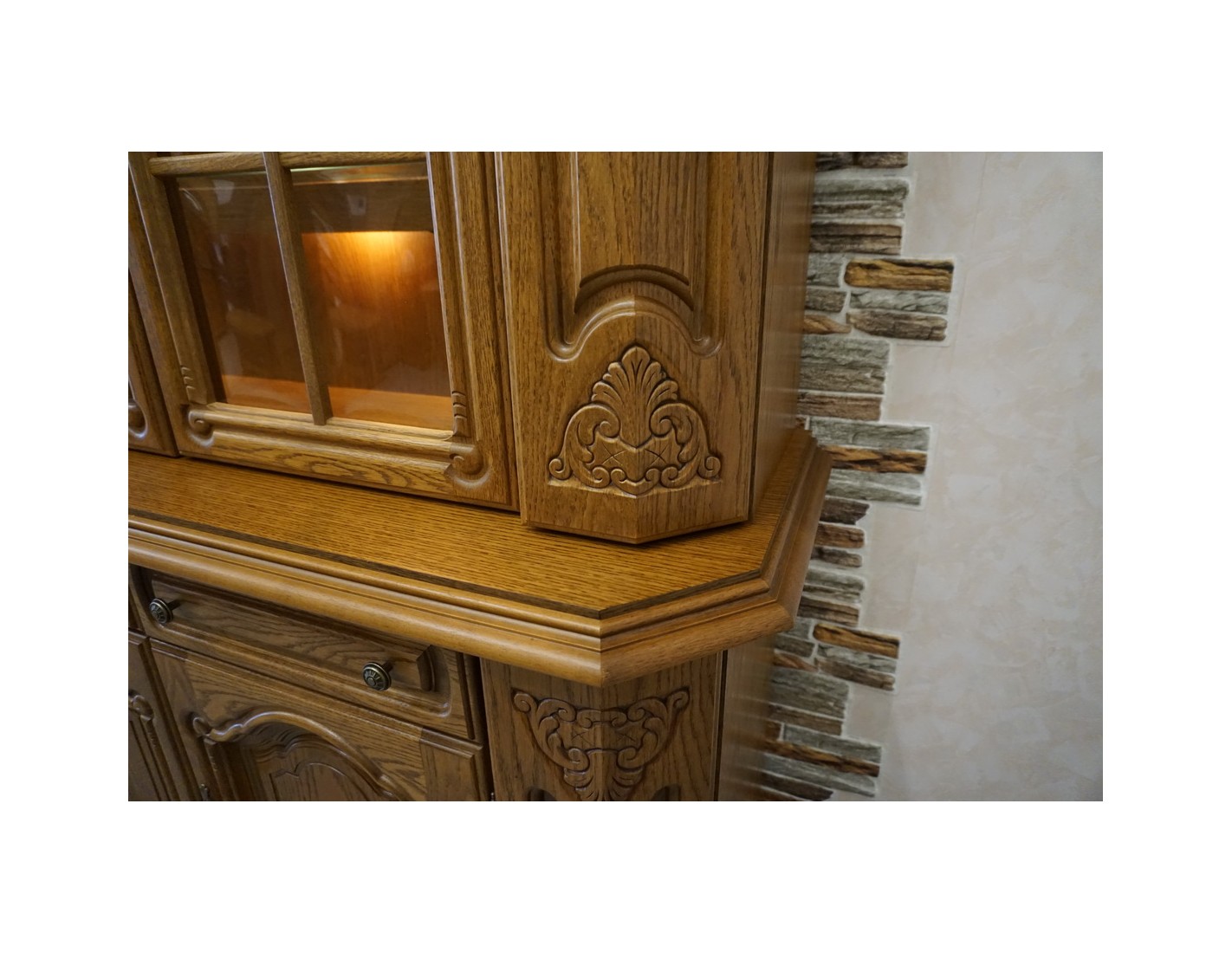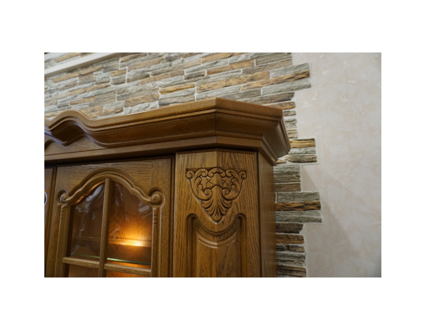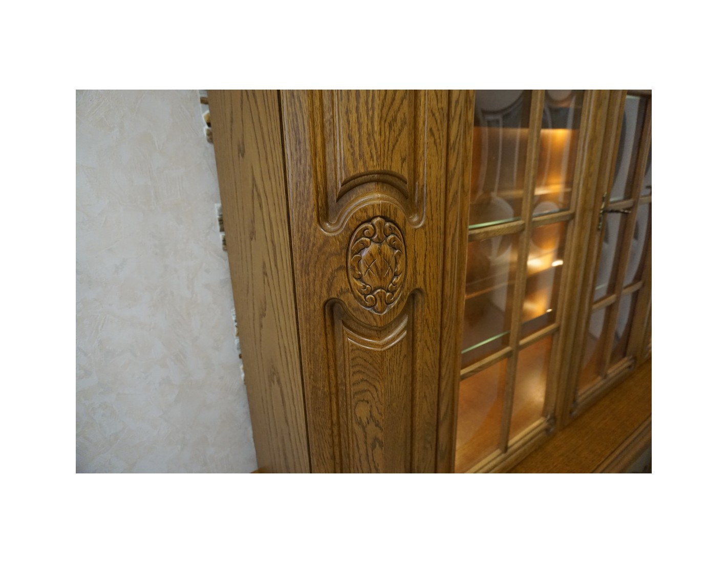 Elegancka witryna z komodą wykonana z dębu, łącząca funkcjonalność i ponadczasowy styl. Podświetlane wnętrze podkreśla ekspozycję przedmiotów w górnej części, a pojemna komoda zapewnia miejsce na przechowywanie akcesoriów i dokumentów.