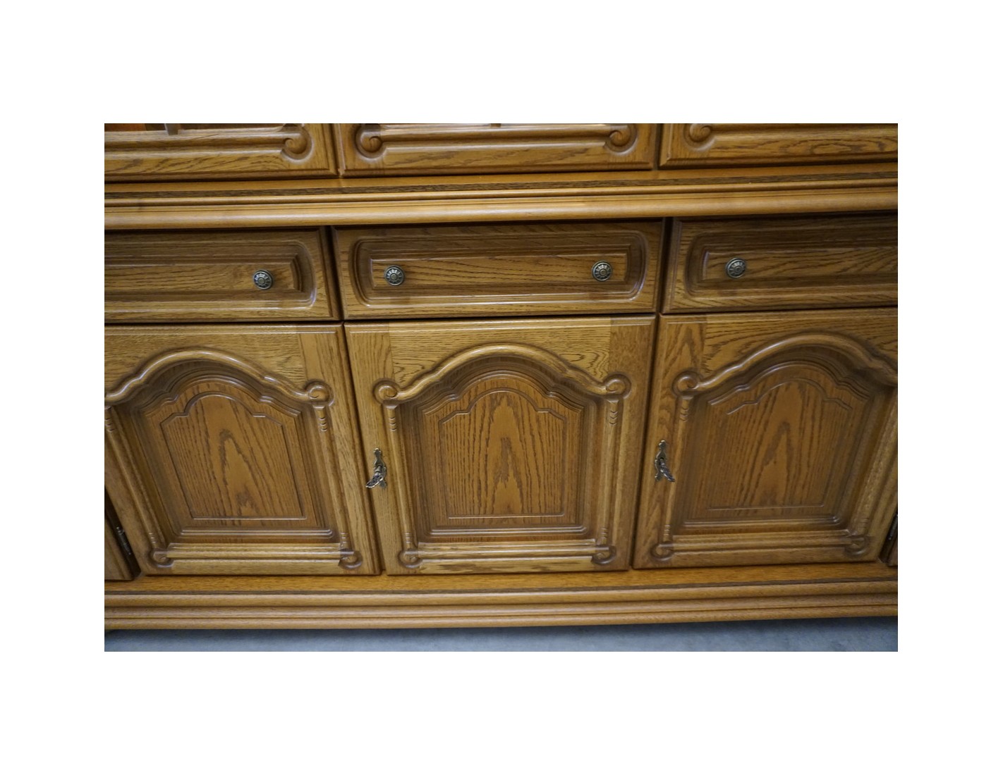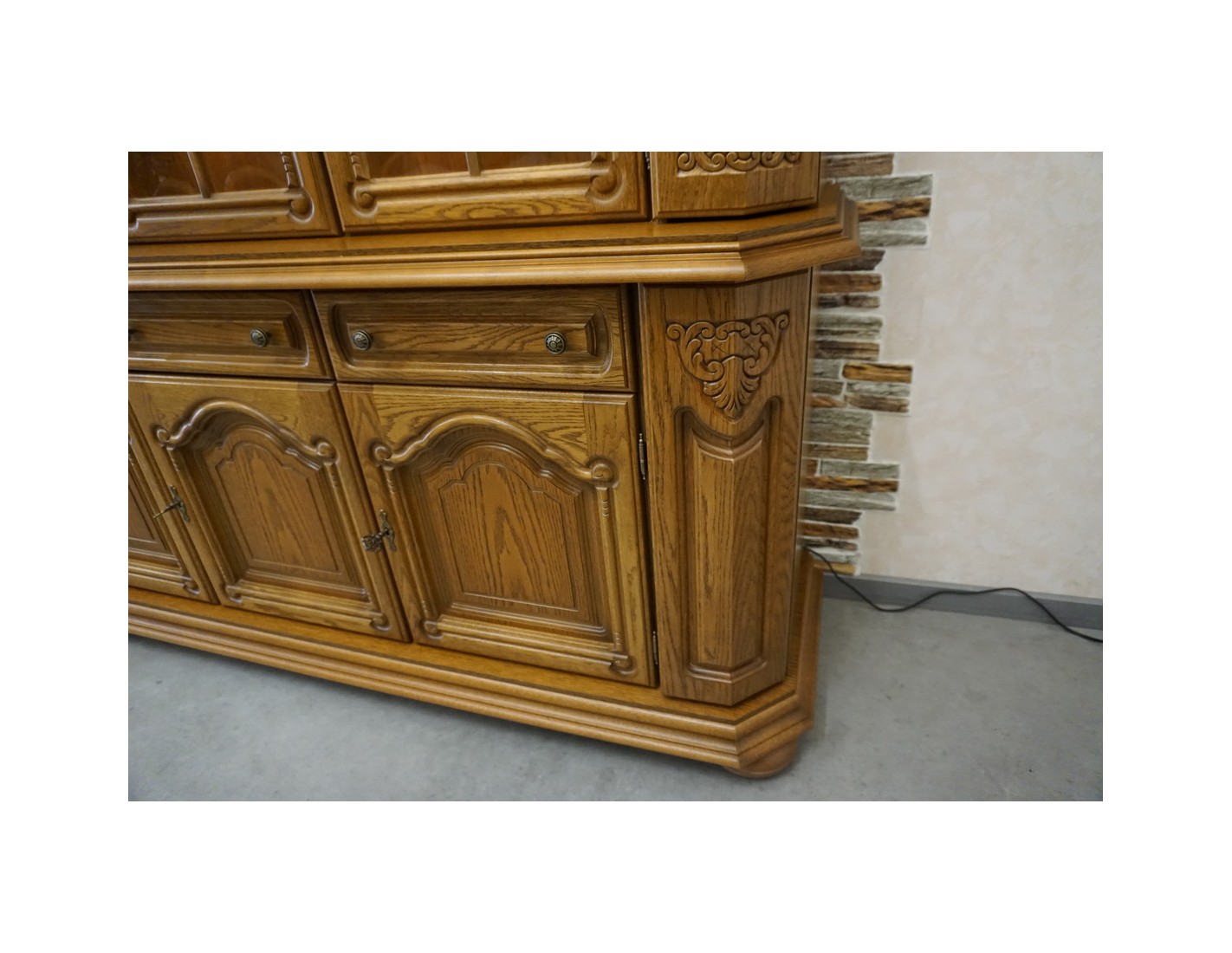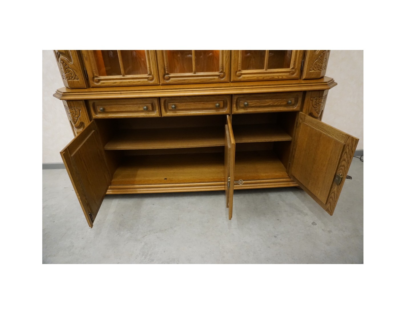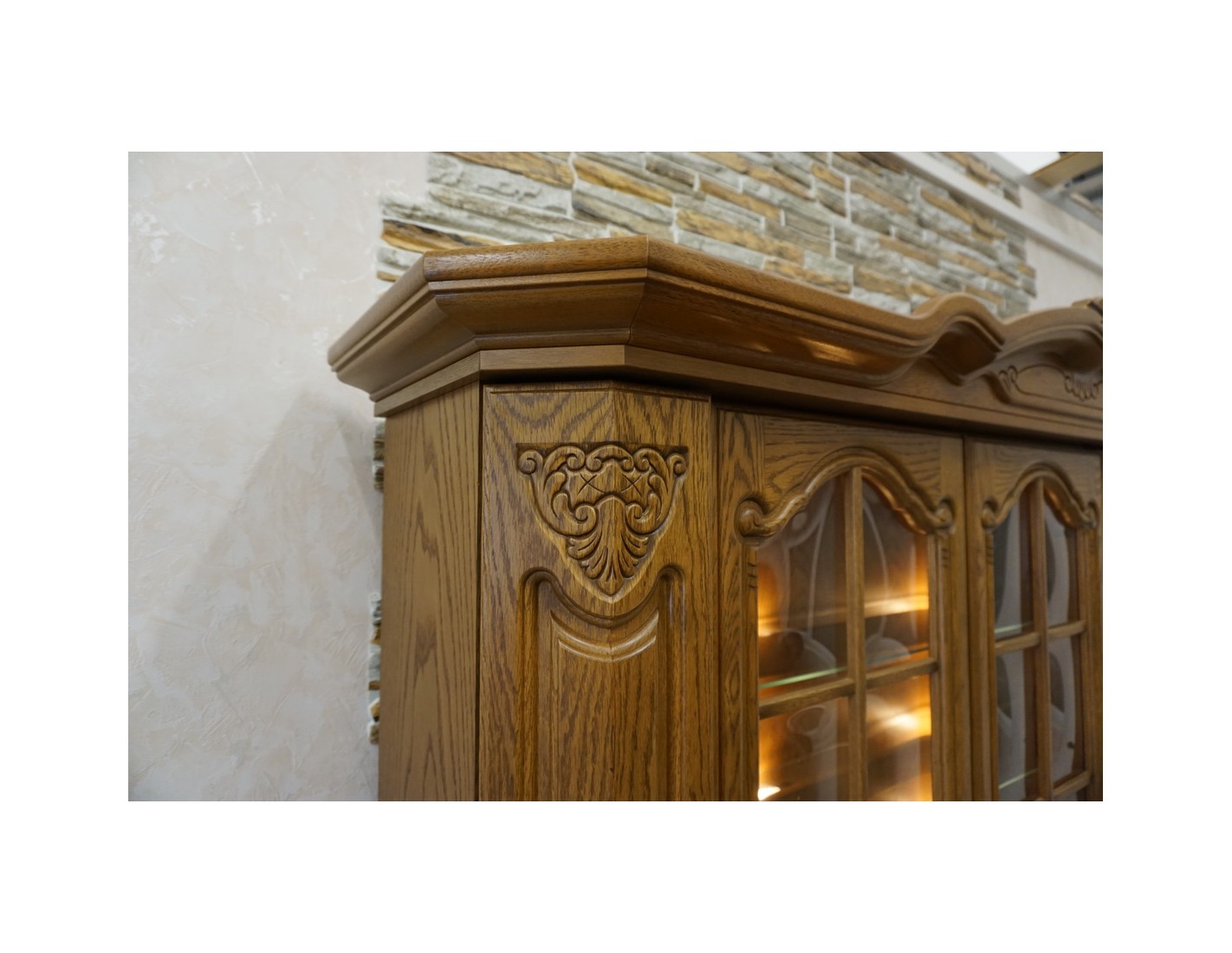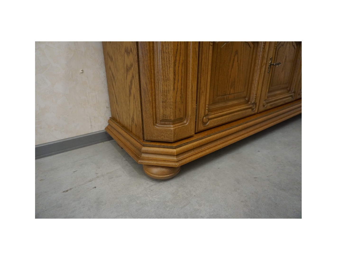 Elegancka witryna z komodą wykonana z dębu, łącząca funkcjonalność i ponadczasowy styl. Podświetlane wnętrze podkreśla ekspozycję przedmiotów w górnej części, a pojemna komoda zapewnia miejsce na przechowywanie akcesoriów i dokumentów.