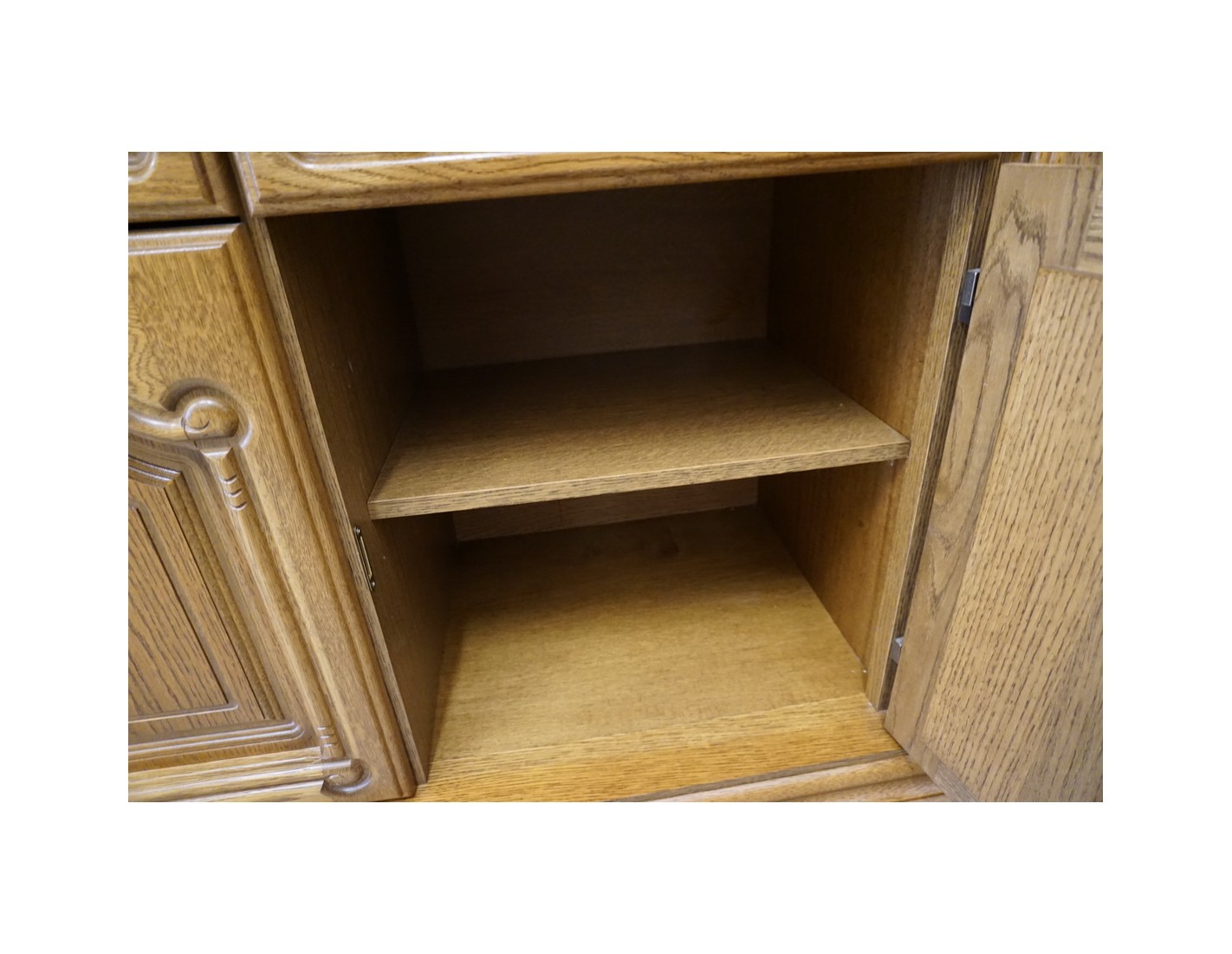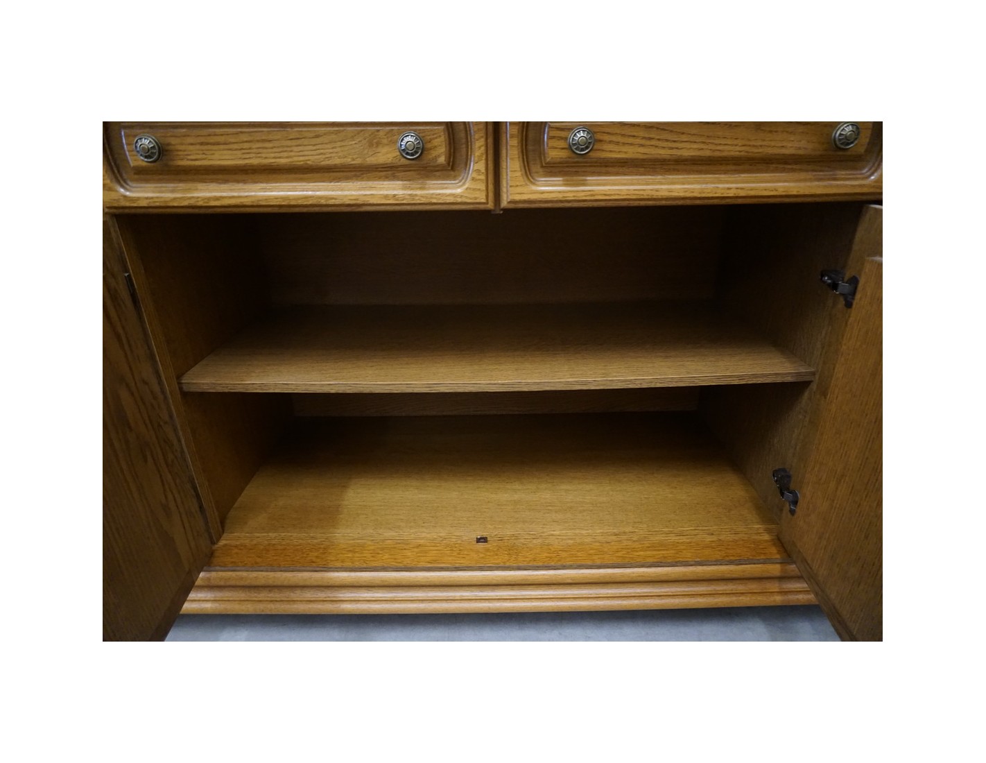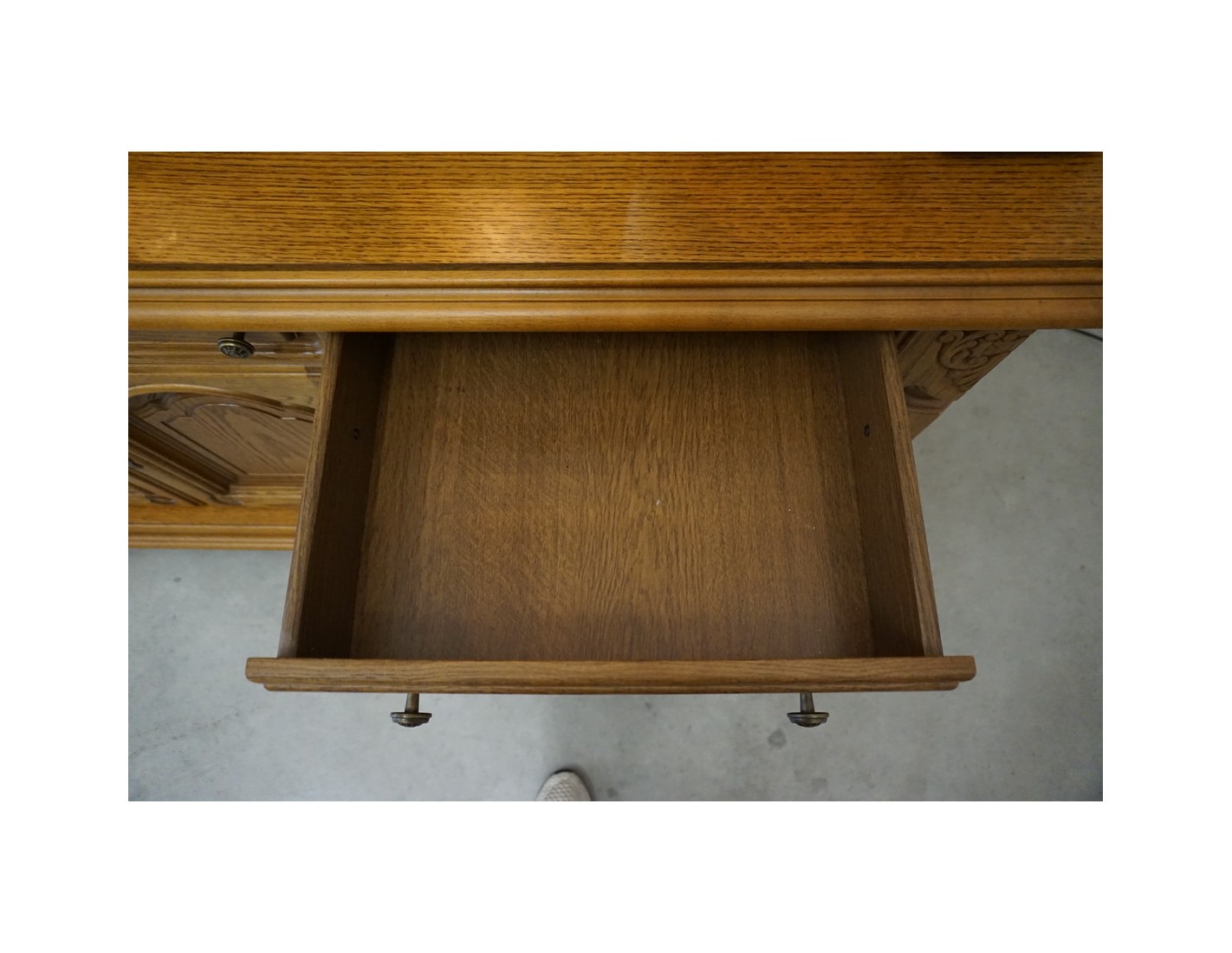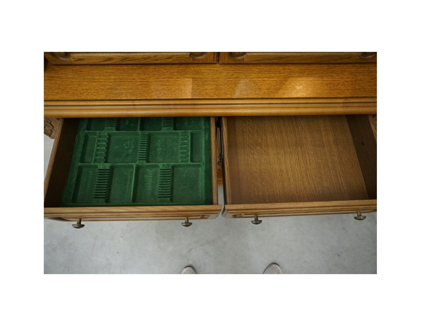 Elegancka witryna z komodą wykonana z dębu, łącząca funkcjonalność i ponadczasowy styl. Podświetlane wnętrze podkreśla ekspozycję przedmiotów w górnej części, a pojemna komoda zapewnia miejsce na przechowywanie akcesoriów i dokumentów.