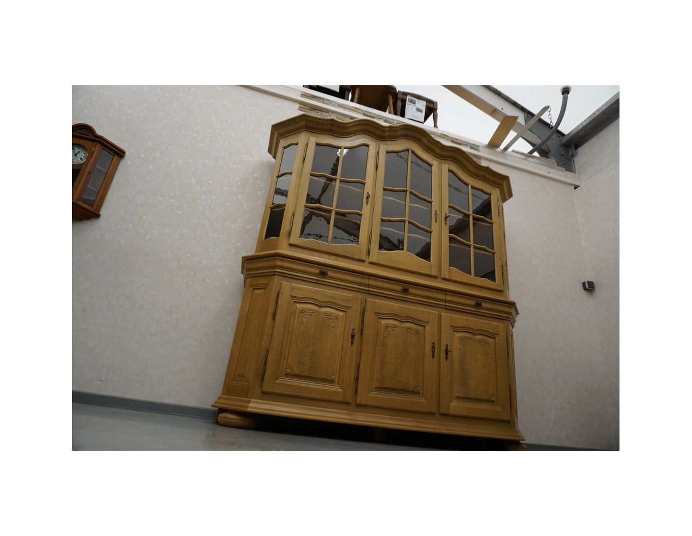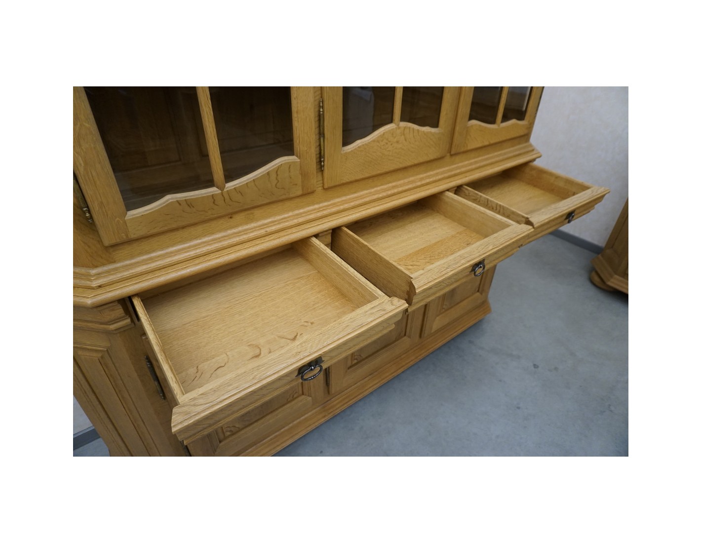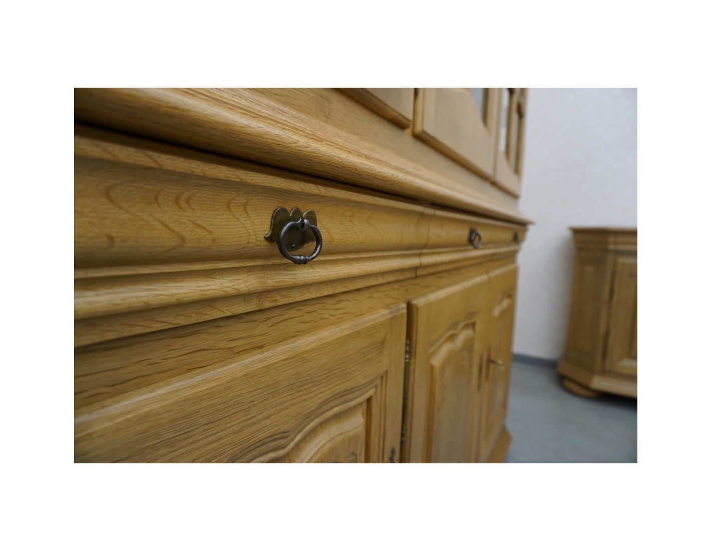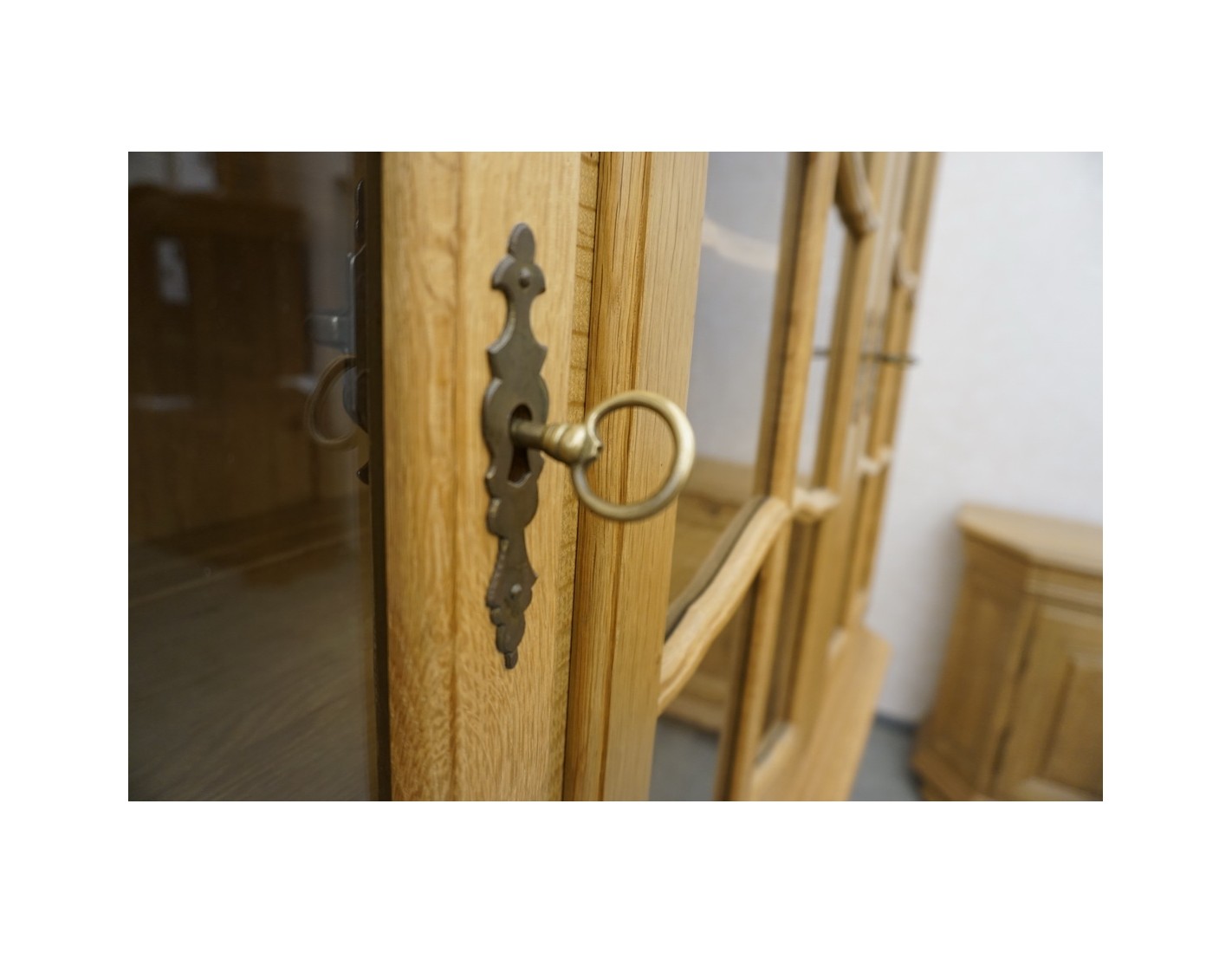 Elegancka i solidna witryna z komodą wykonana z litego dębu, łącząca funkcjonalność z ponadczasowym stylem. Mebel oferuje obszerną przestrzeń do przechowywania oraz ekspozycji, idealny do salonu, jadalni lub gabinetu.