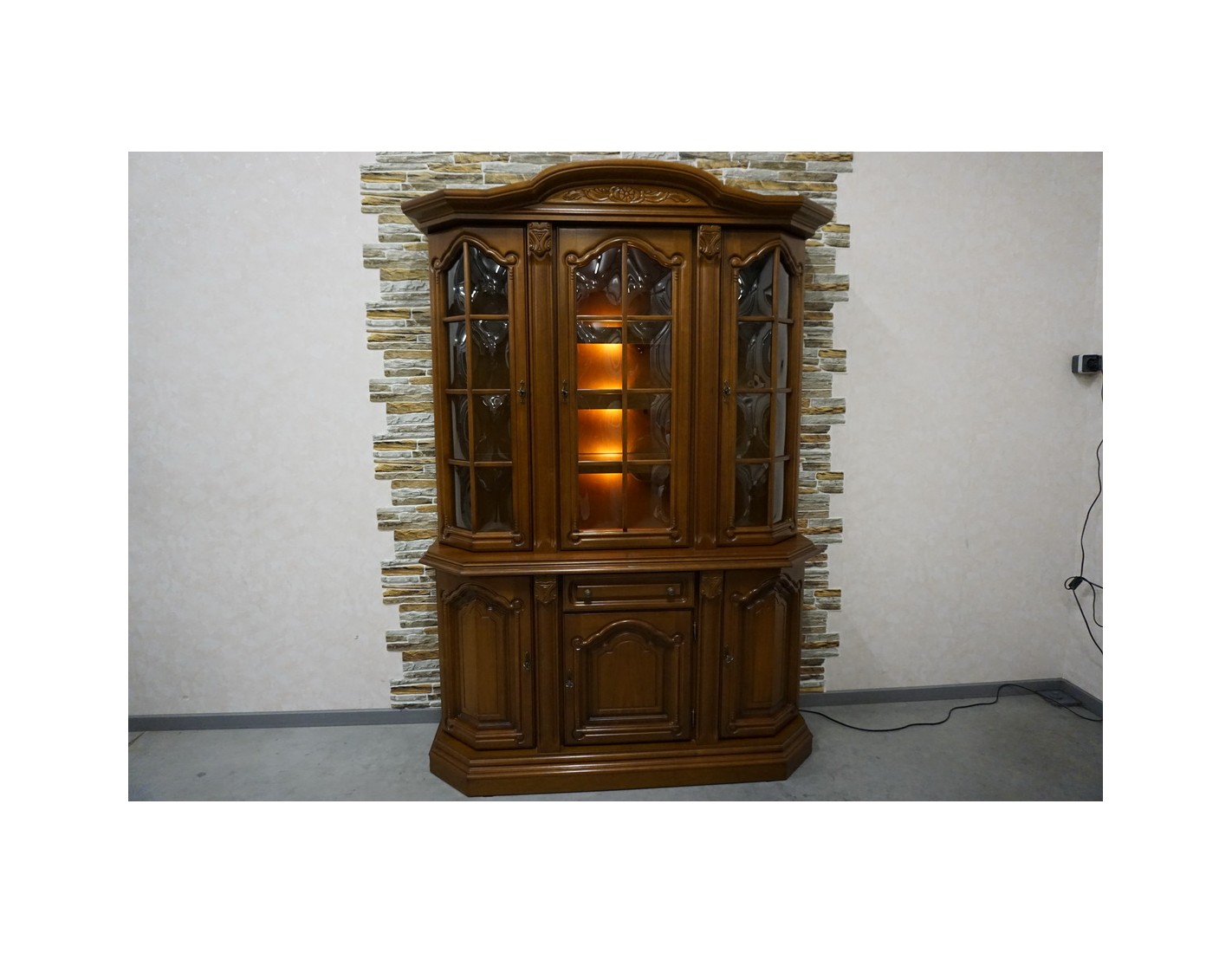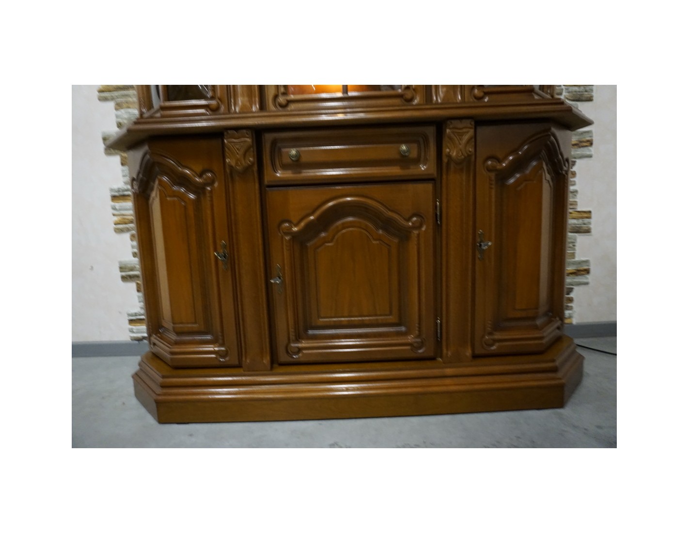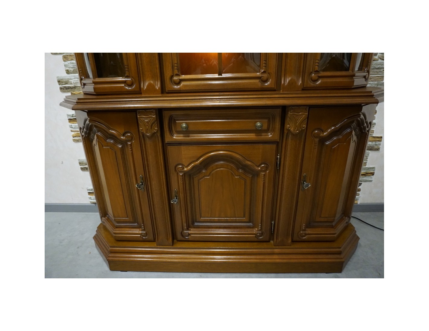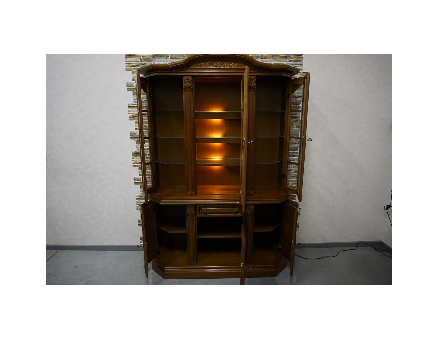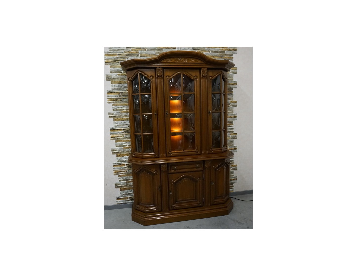 Elegancka witryna z komodą w kolorze orzechowym, która łączy funkcjonalność z klasycznym wyglądem. Podświetlenie subtelnie eksponuje zawartość witryny, tworząc przyjemny klimat we wnętrzu. Mebel idealnie sprawdzi się w salonie, jadalni lub gabinecie.