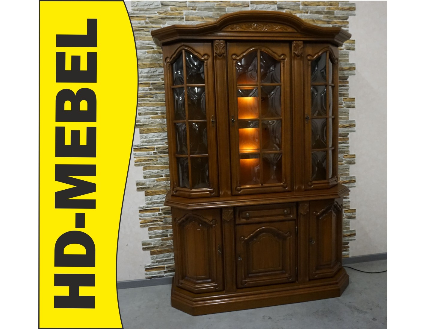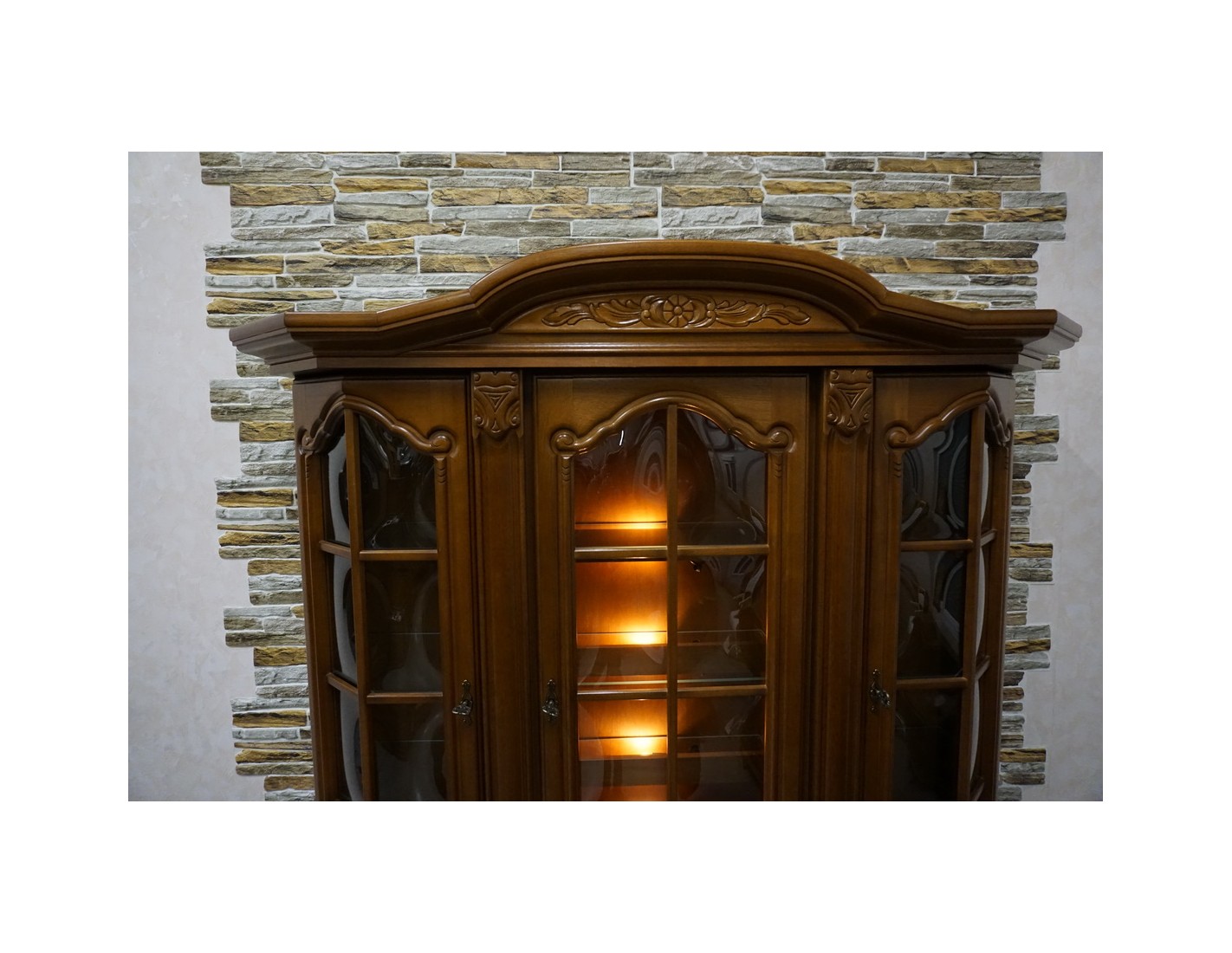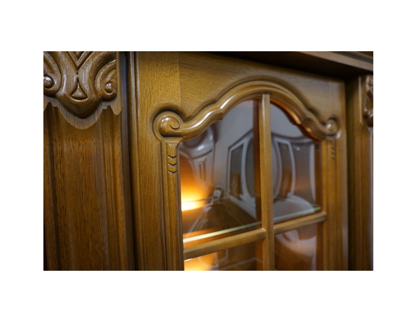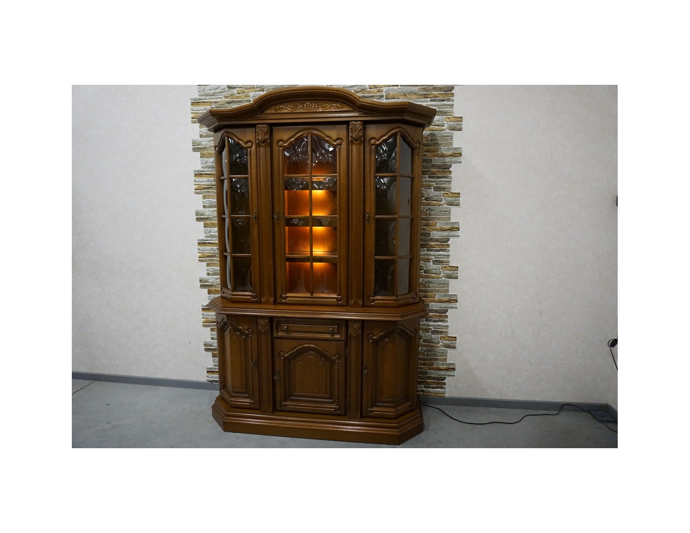 Elegancka witryna z komodą w kolorze orzechowym, która łączy funkcjonalność z klasycznym wyglądem. Podświetlenie subtelnie eksponuje zawartość witryny, tworząc przyjemny klimat we wnętrzu. Mebel idealnie sprawdzi się w salonie, jadalni lub gabinecie.