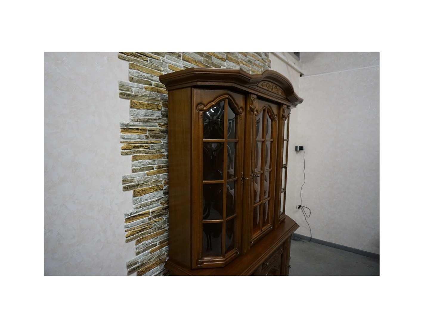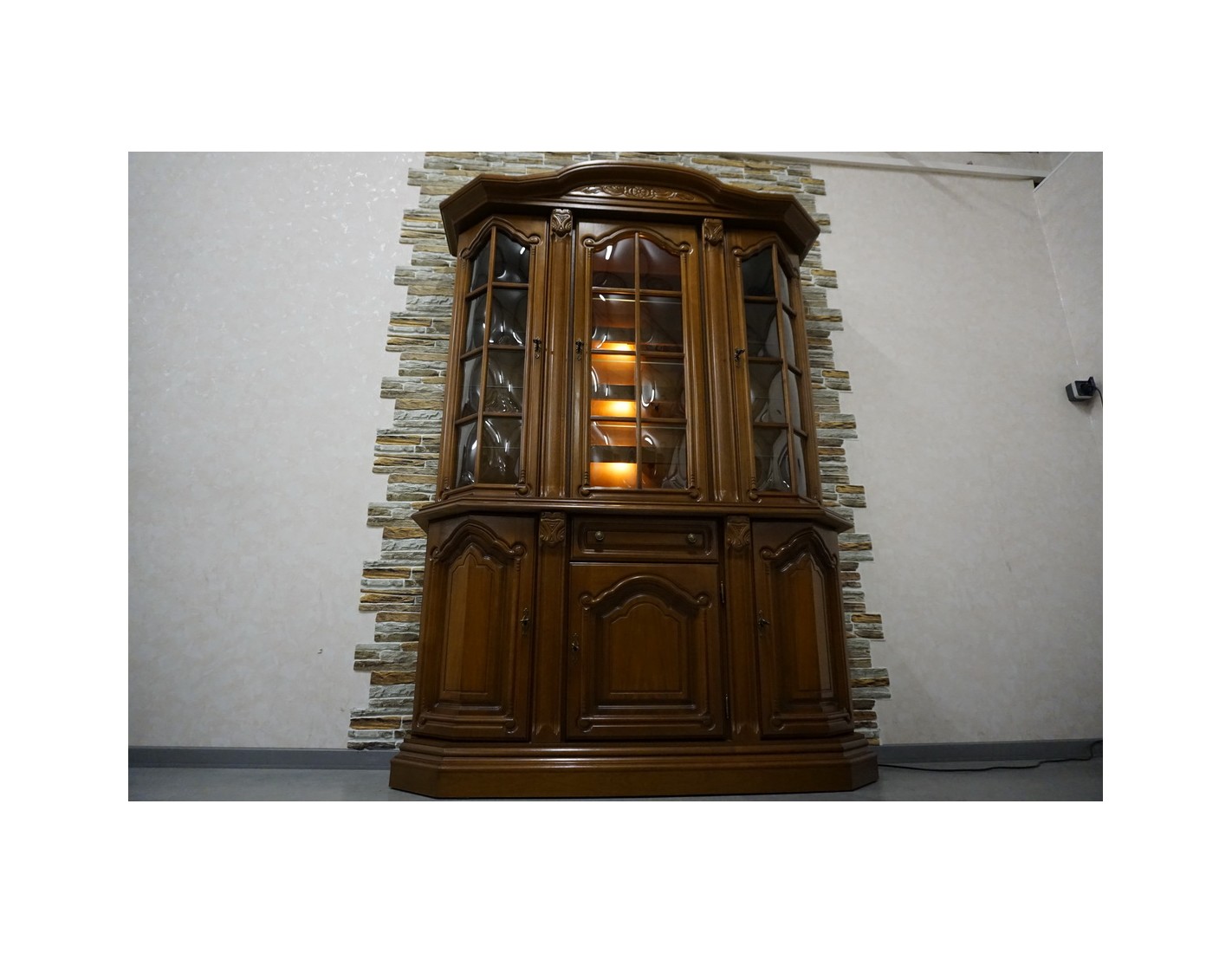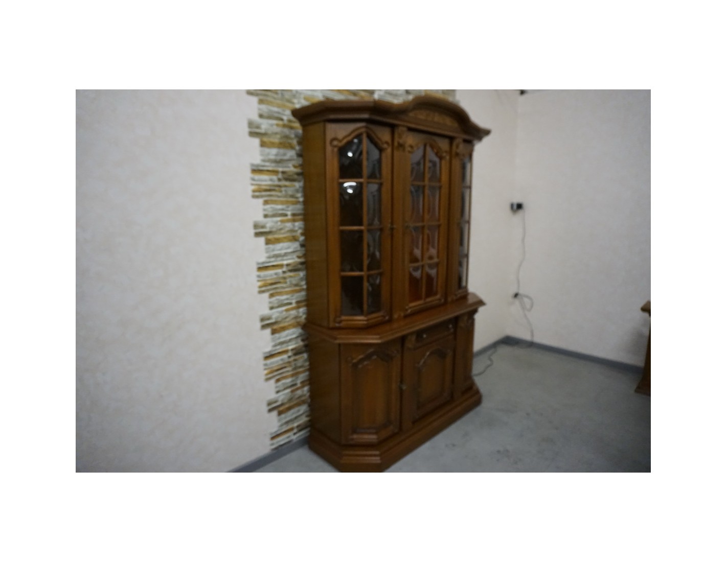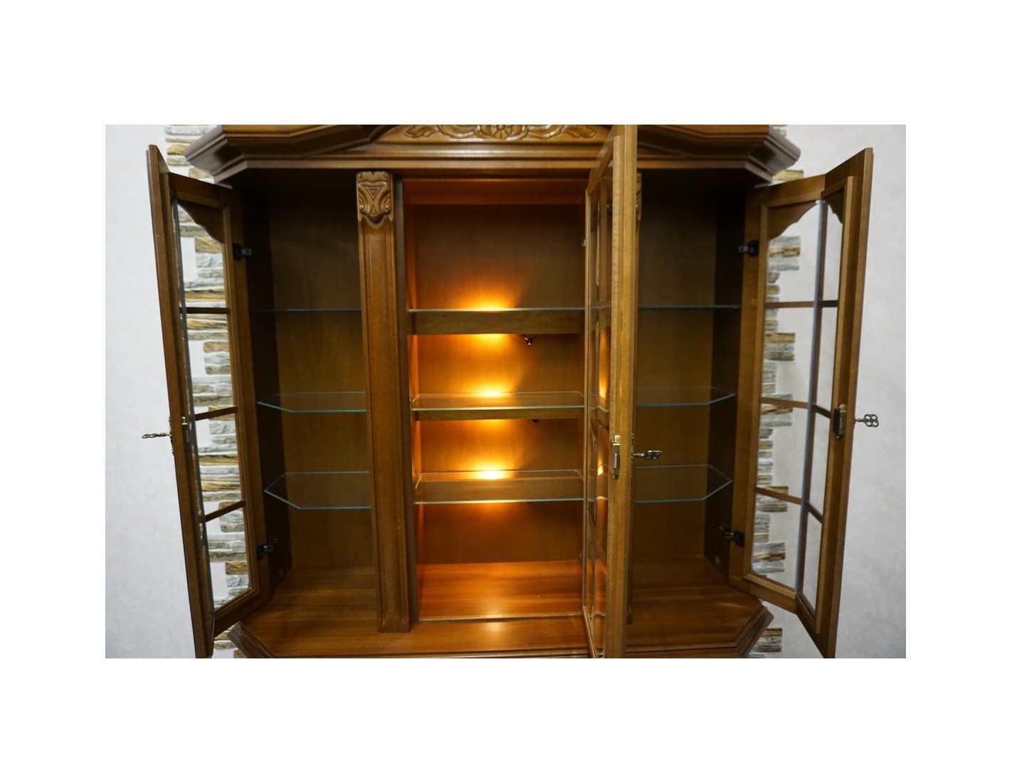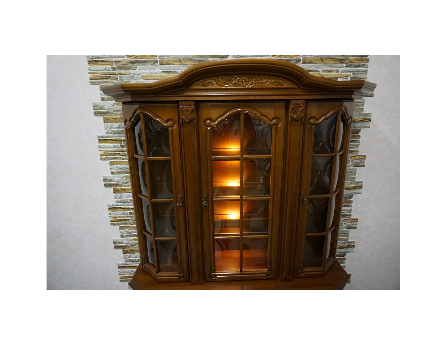 Elegancka witryna z komodą w kolorze orzechowym, która łączy funkcjonalność z klasycznym wyglądem. Podświetlenie subtelnie eksponuje zawartość witryny, tworząc przyjemny klimat we wnętrzu. Mebel idealnie sprawdzi się w salonie, jadalni lub gabinecie.
