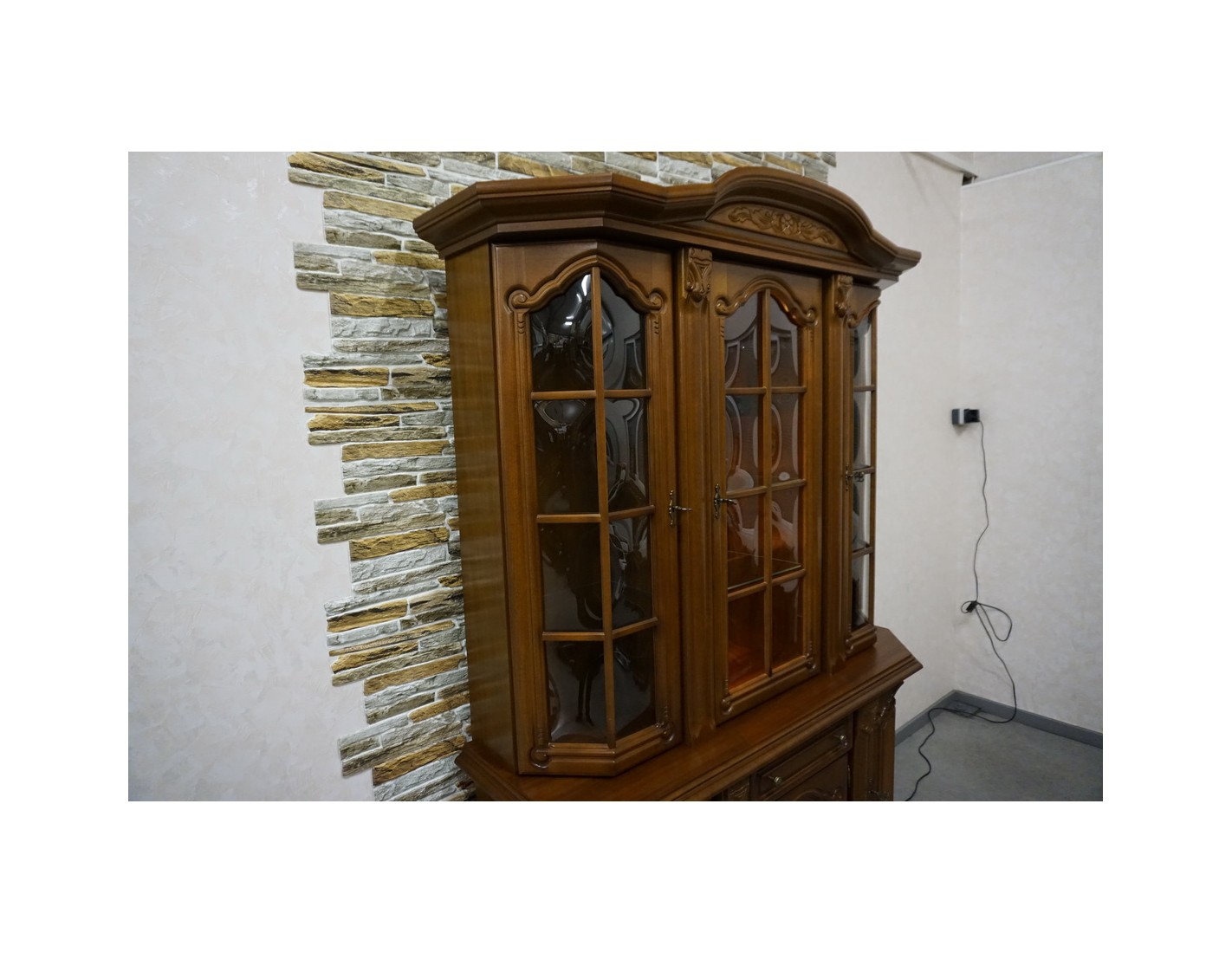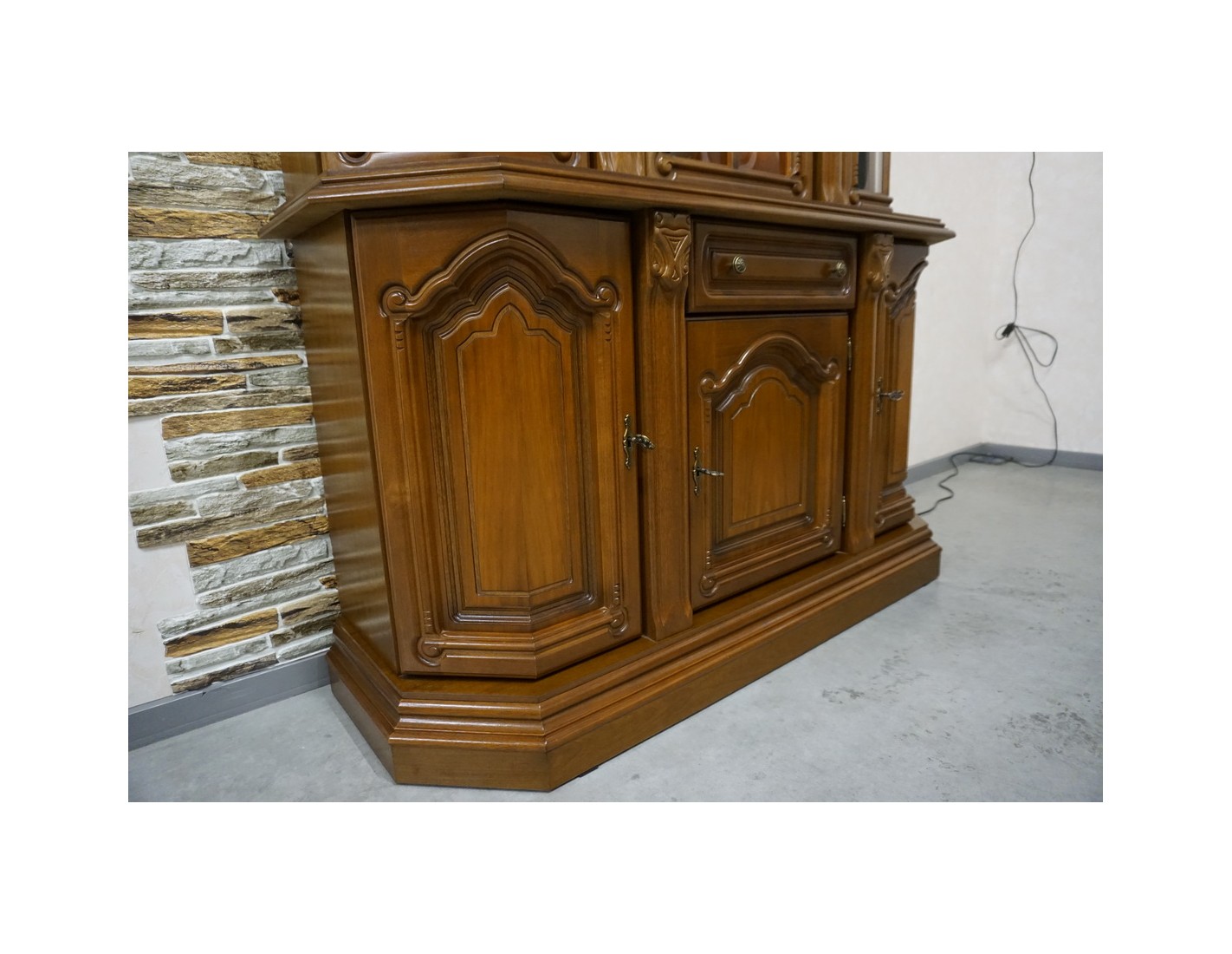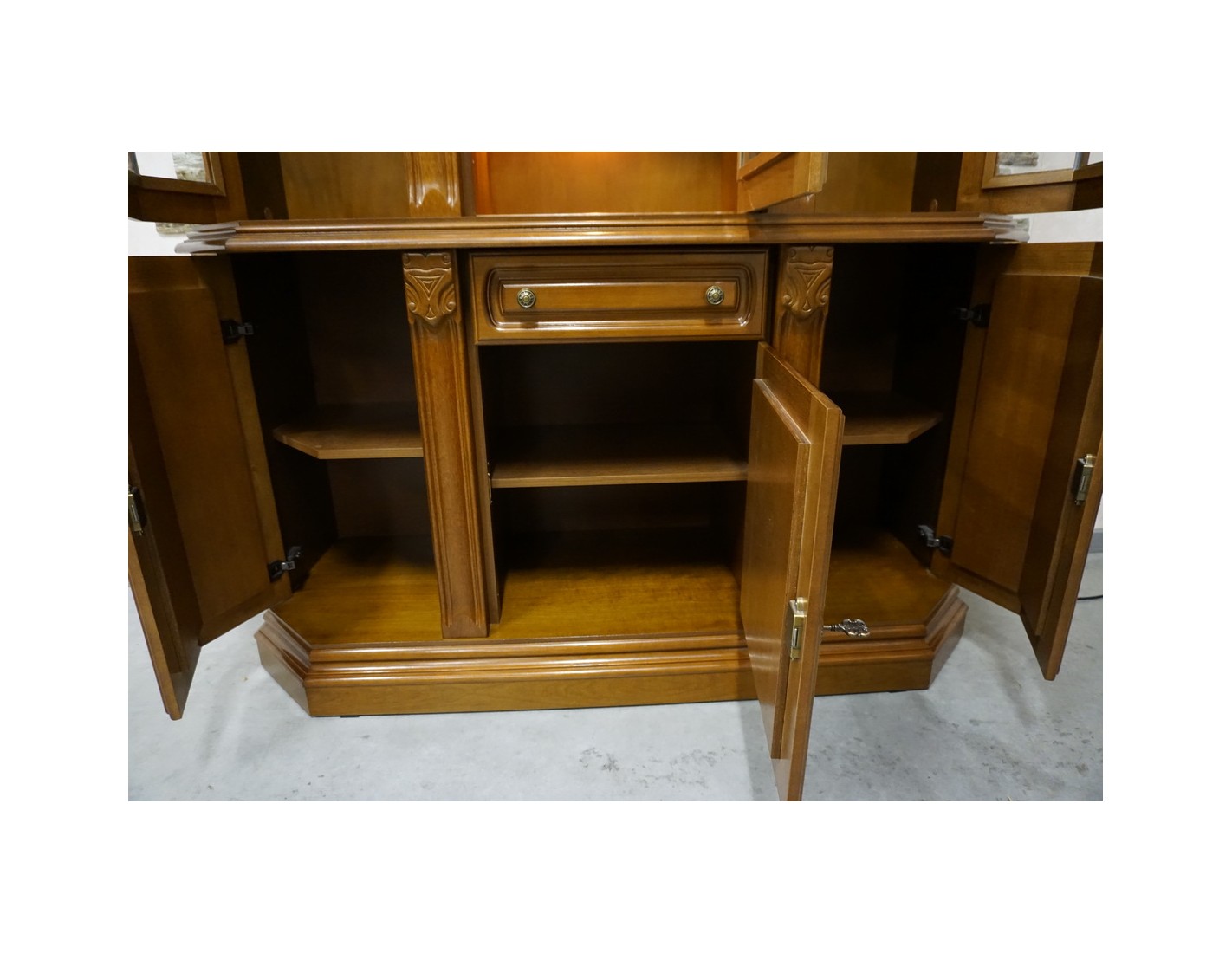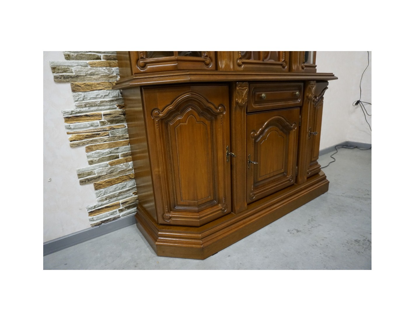 Elegancka witryna z komodą w kolorze orzechowym, która łączy funkcjonalność z klasycznym wyglądem. Podświetlenie subtelnie eksponuje zawartość witryny, tworząc przyjemny klimat we wnętrzu. Mebel idealnie sprawdzi się w salonie, jadalni lub gabinecie.