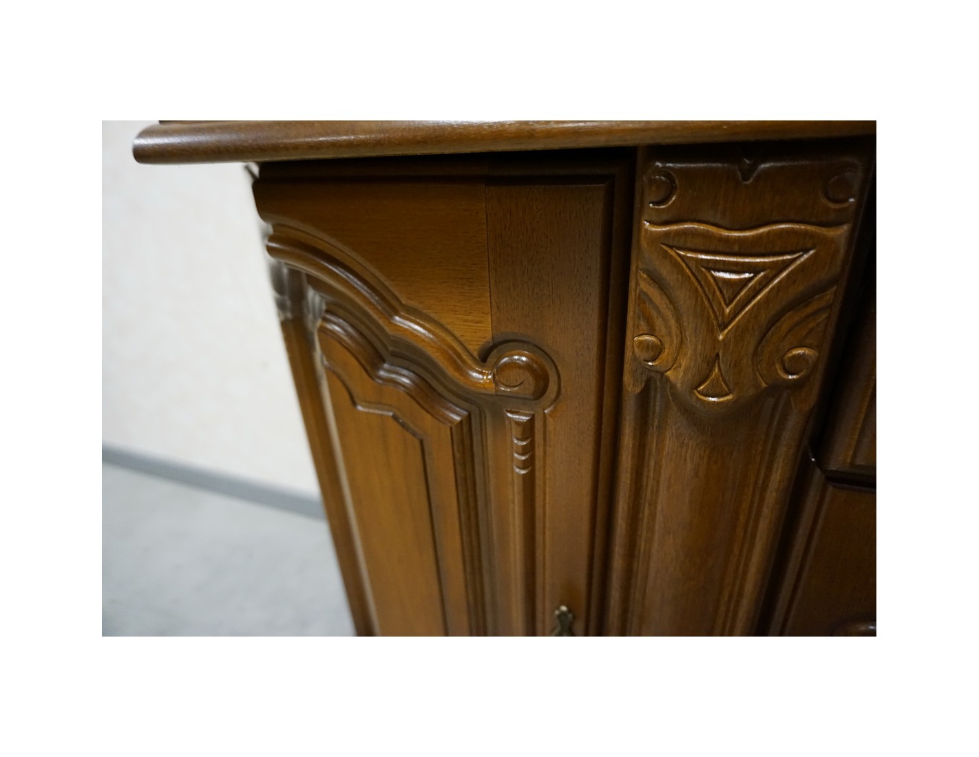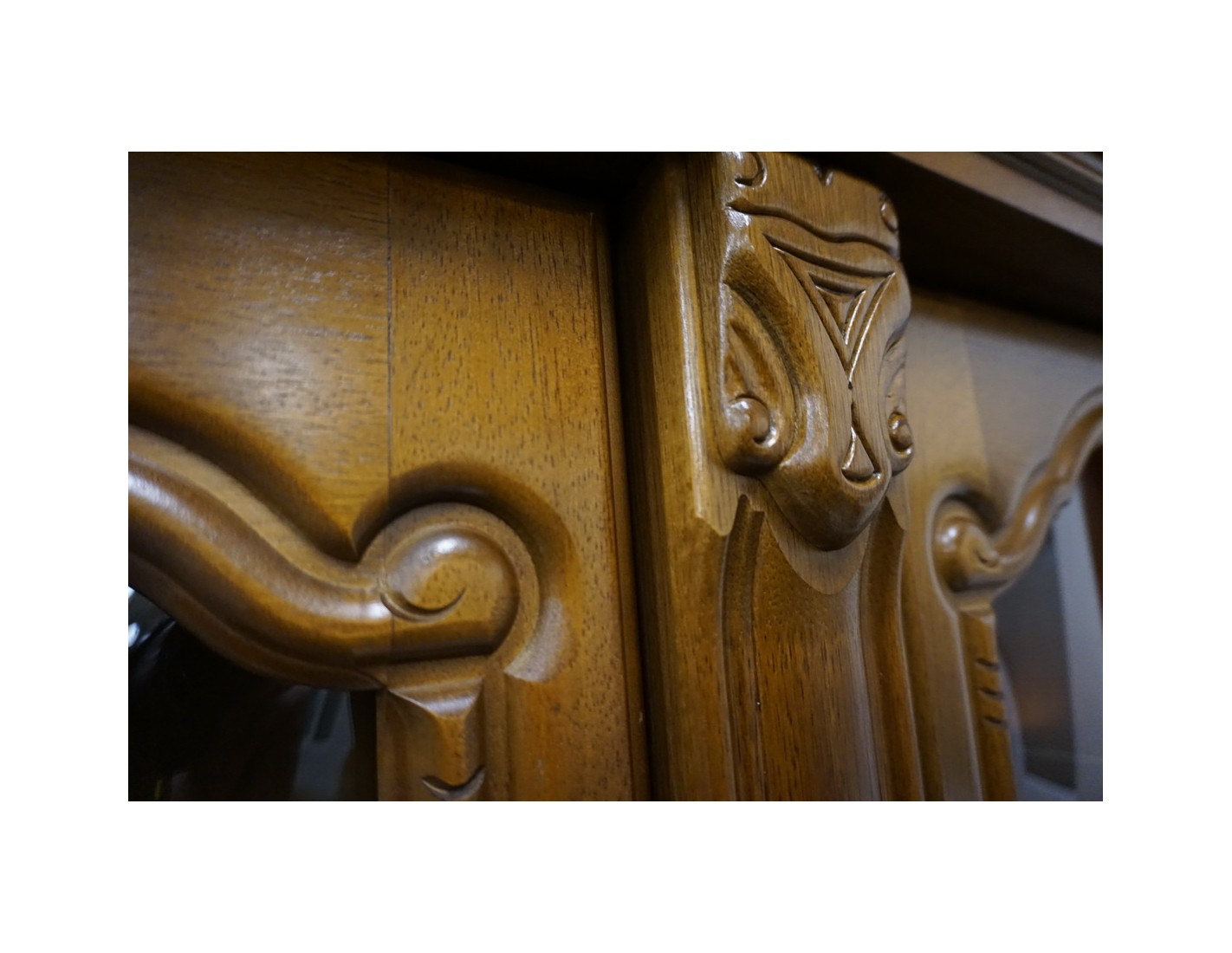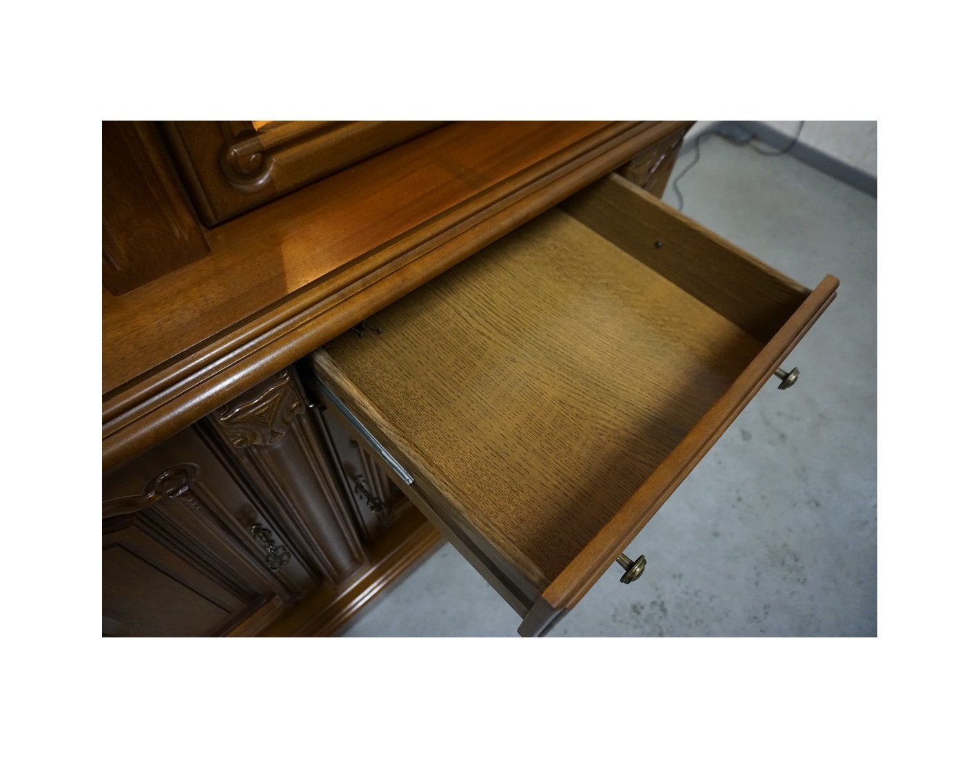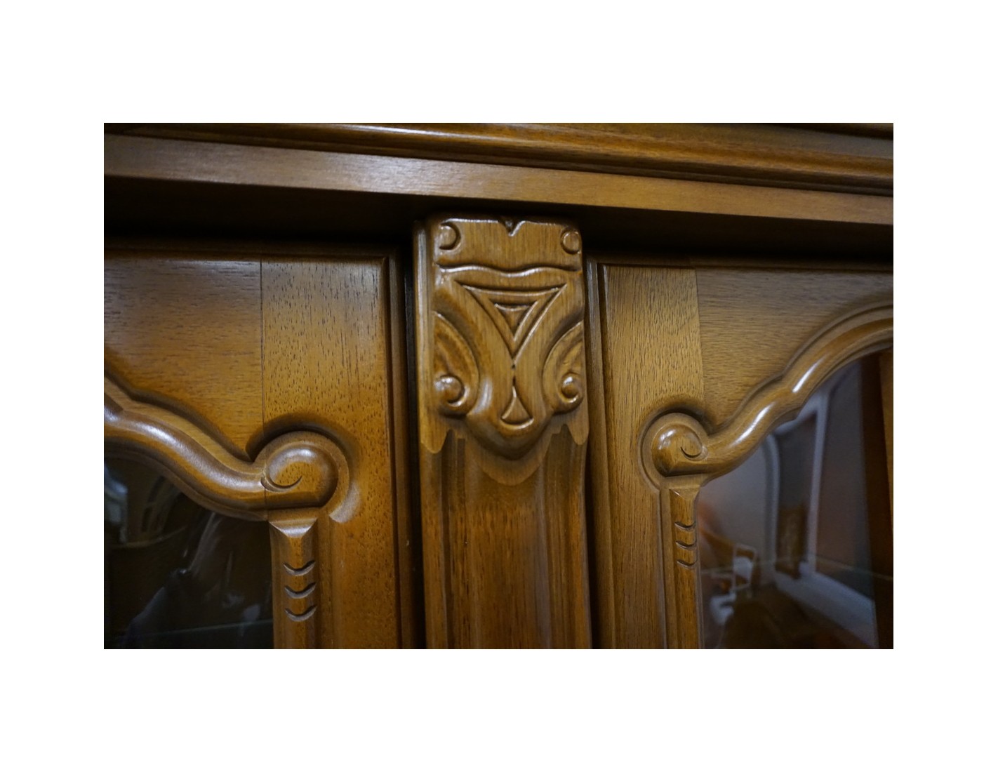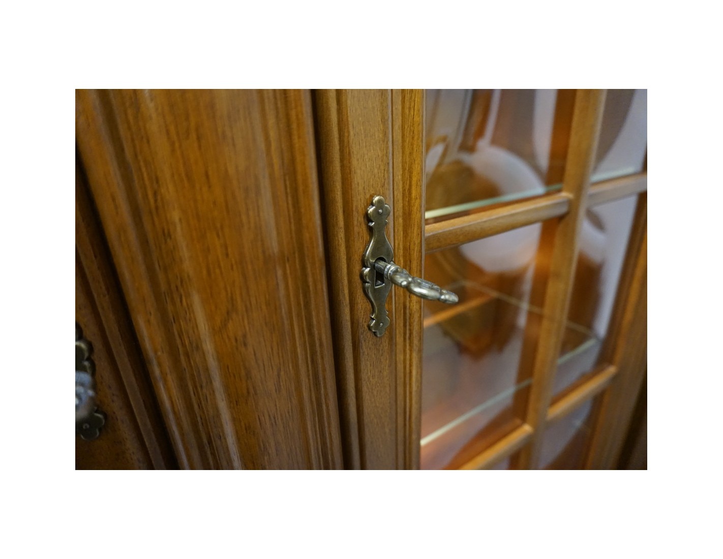 Elegancka witryna z komodą w kolorze orzechowym, która łączy funkcjonalność z klasycznym wyglądem. Podświetlenie subtelnie eksponuje zawartość witryny, tworząc przyjemny klimat we wnętrzu. Mebel idealnie sprawdzi się w salonie, jadalni lub gabinecie.