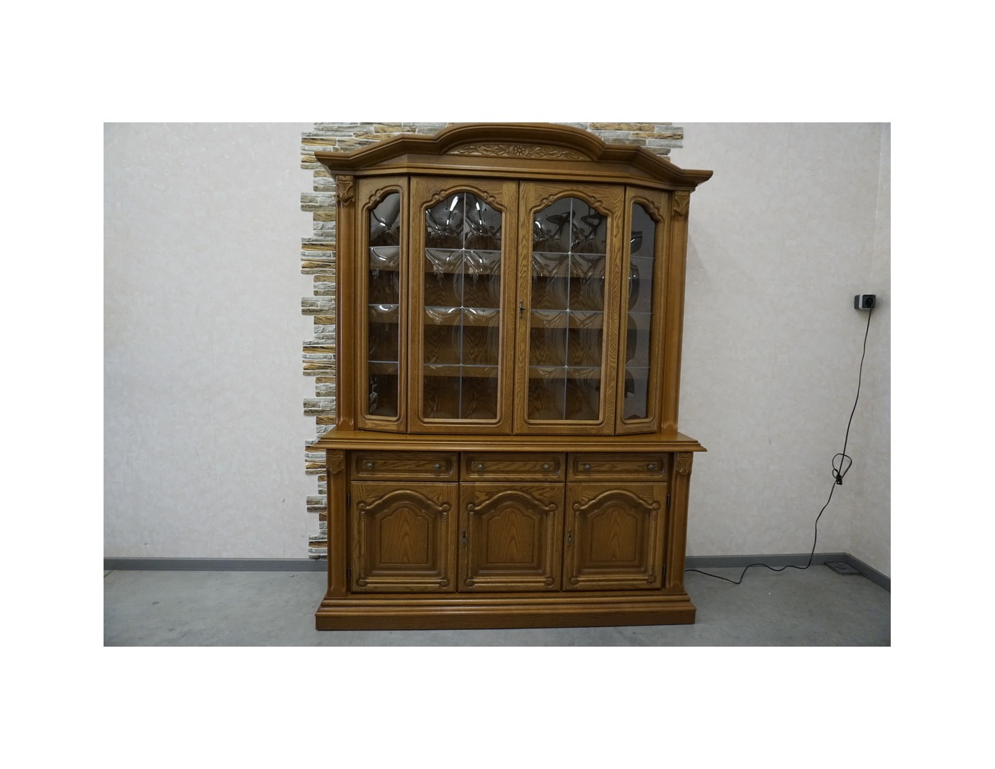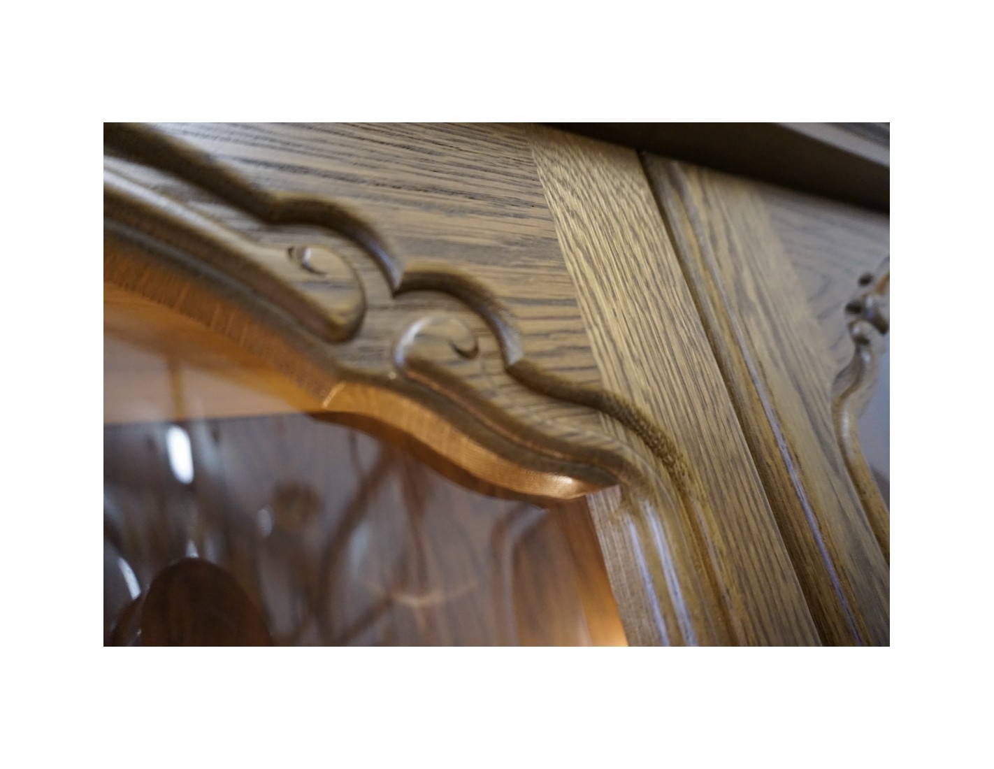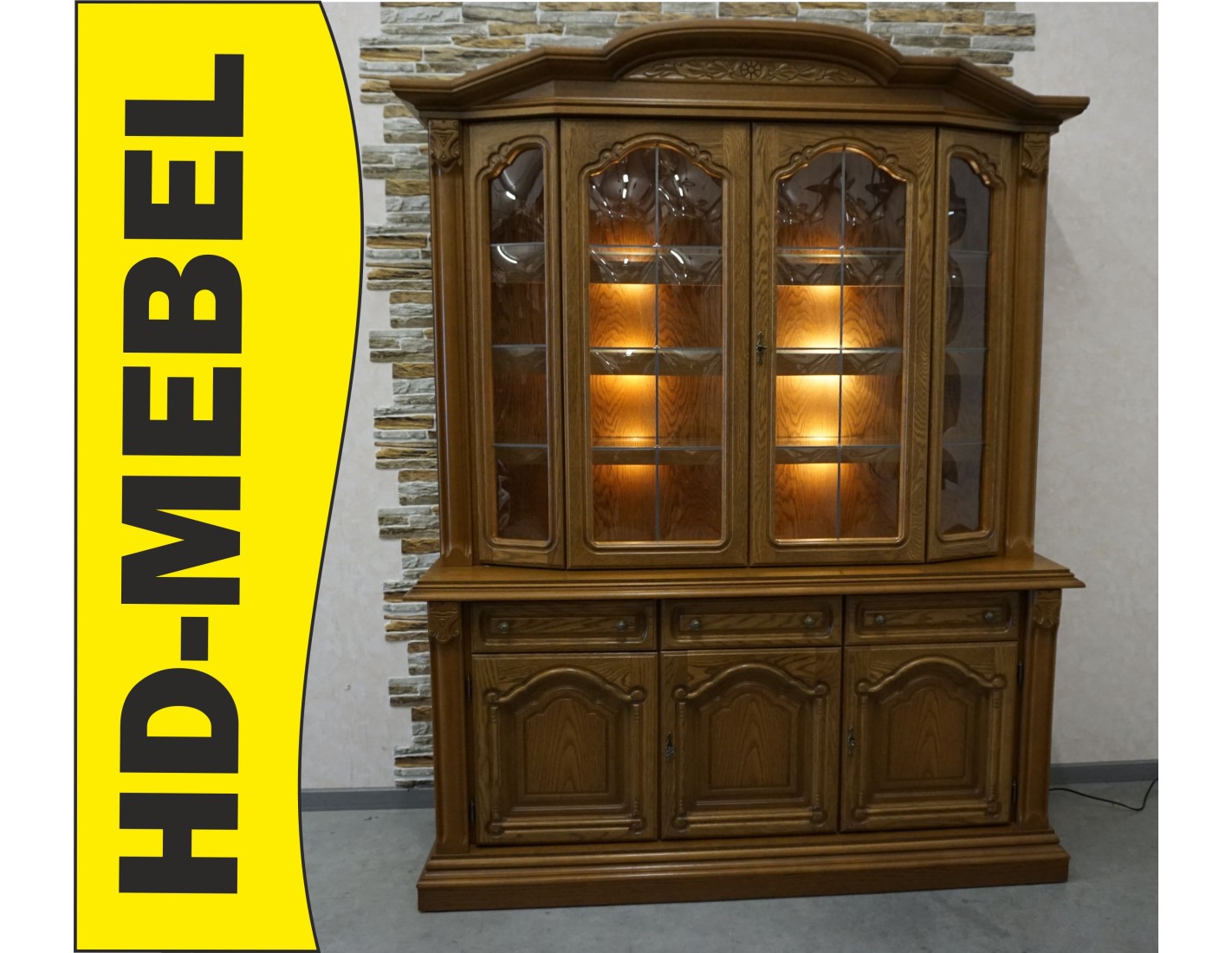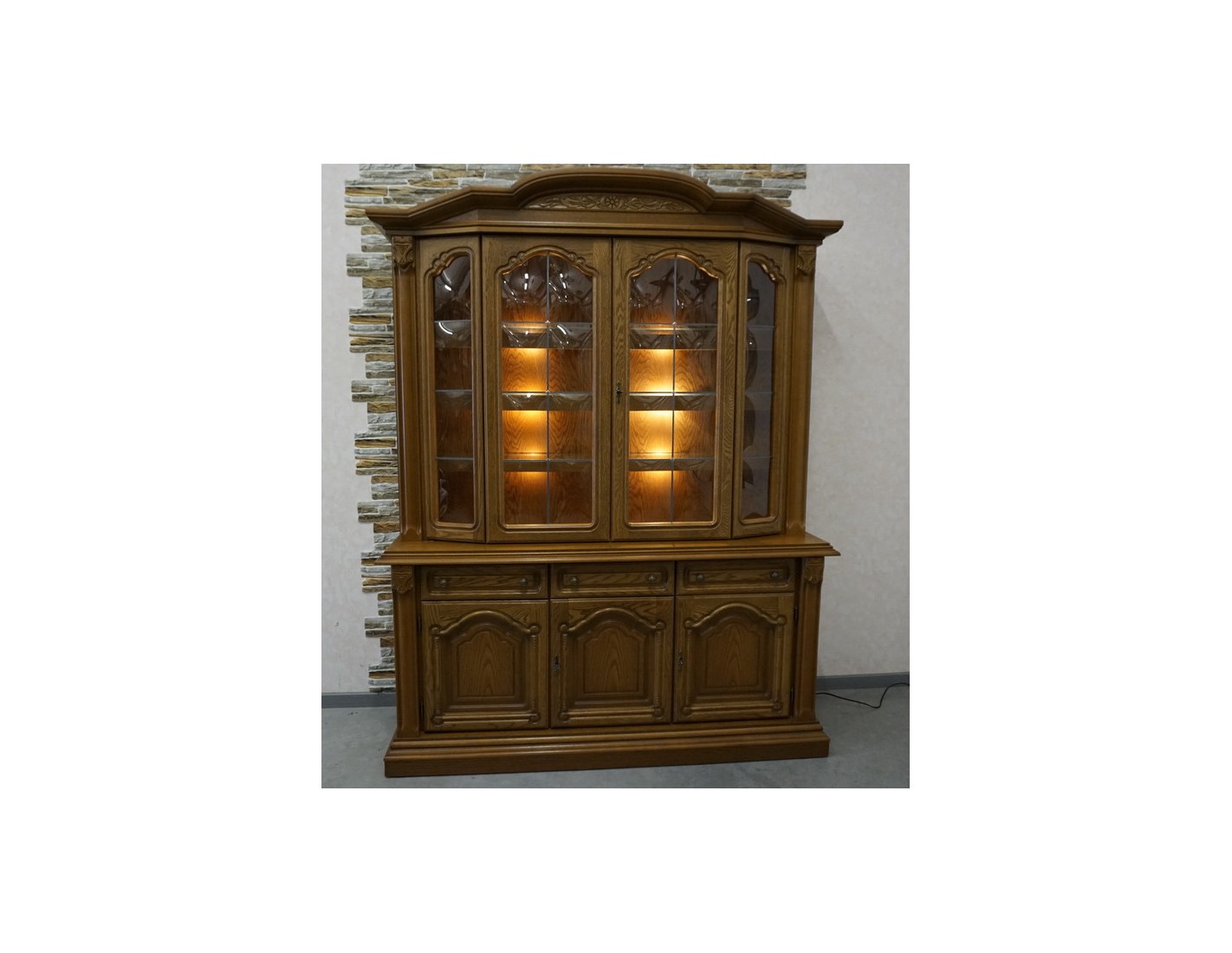 Elegancka i pojemna witryna z komodą wykonana z dębu, idealna do salonu lub jadalni. Mebel łączy funkcję przechowywania z efektowną ekspozycją dzięki wbudowanemu podświetleniu, które podkreśla zawartość witryny i nadaje wnętrzu wyjątkowy klimat.