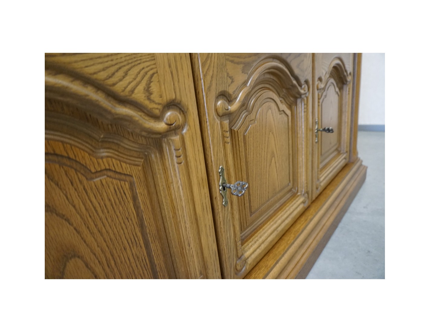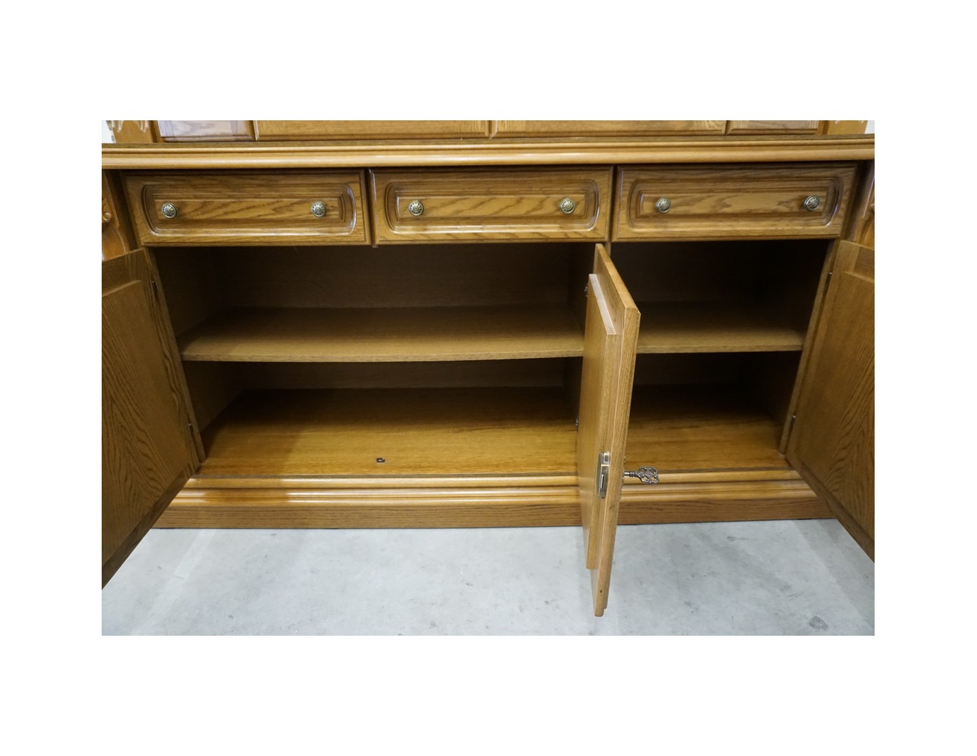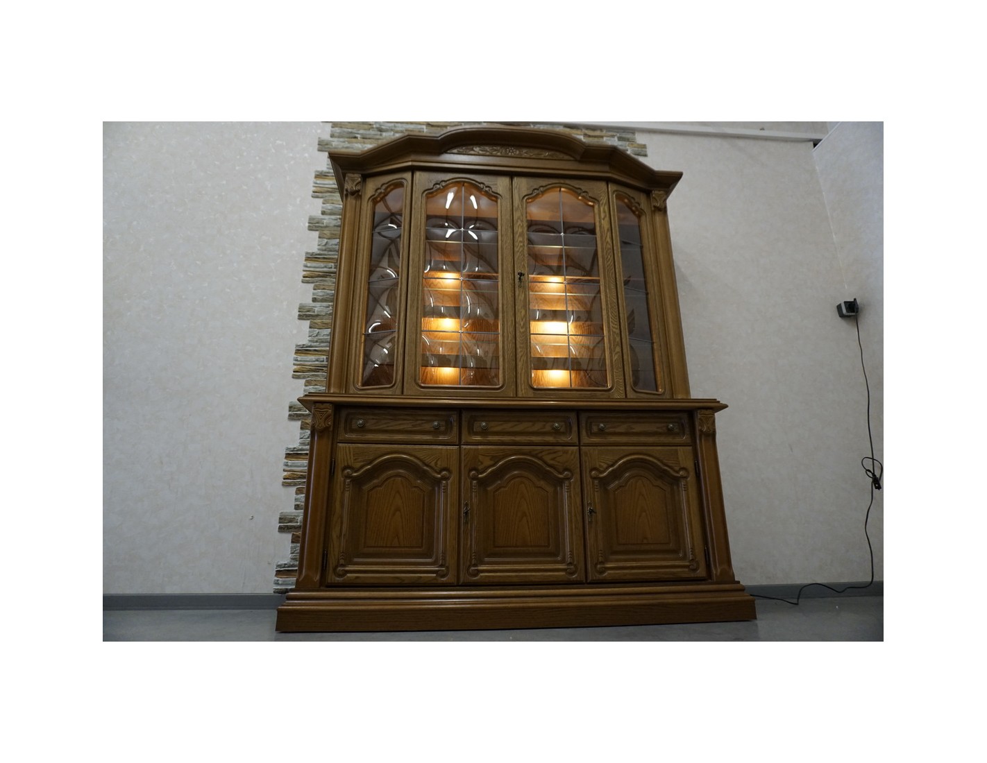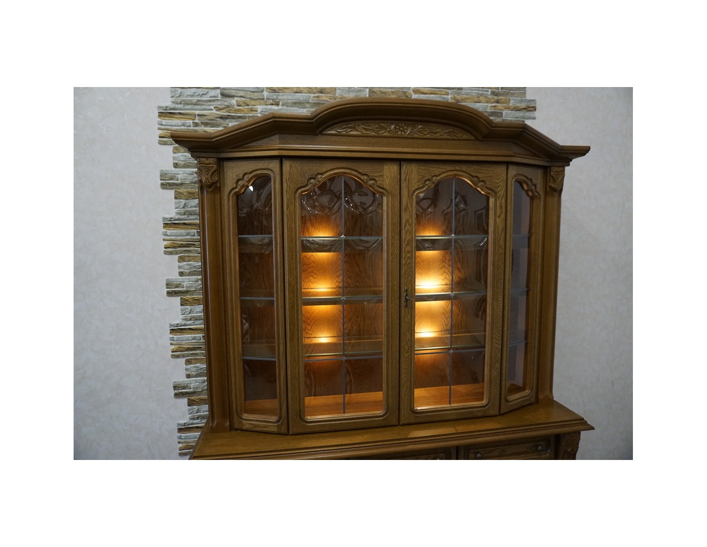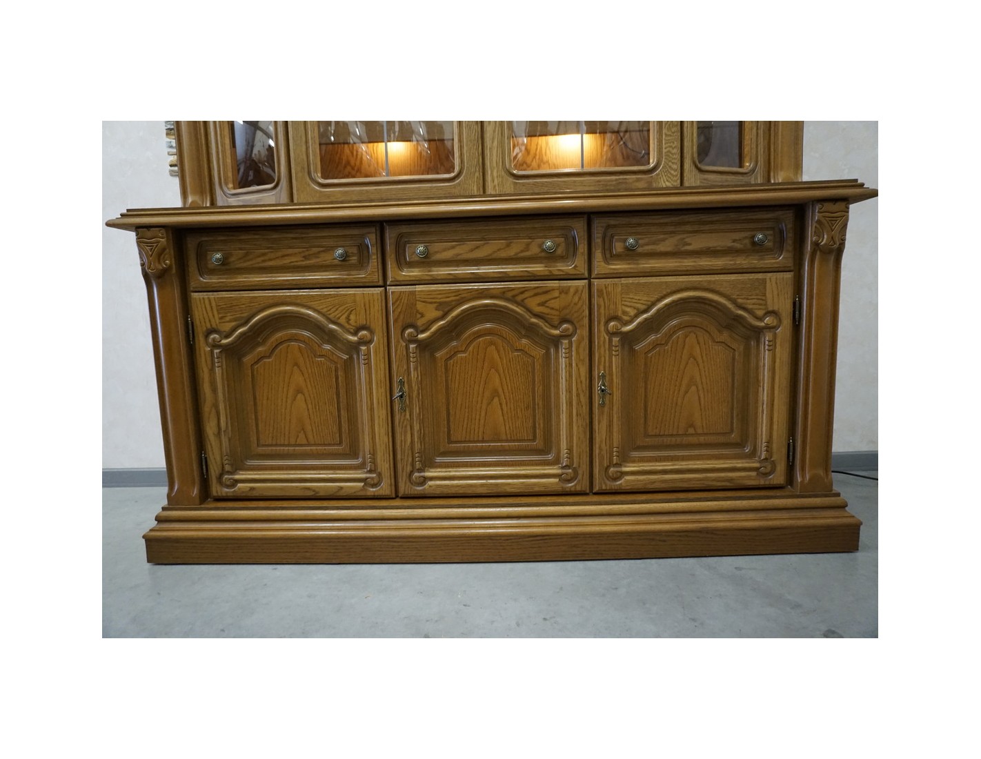 Elegancka i pojemna witryna z komodą wykonana z dębu, idealna do salonu lub jadalni. Mebel łączy funkcję przechowywania z efektowną ekspozycją dzięki wbudowanemu podświetleniu, które podkreśla zawartość witryny i nadaje wnętrzu wyjątkowy klimat.