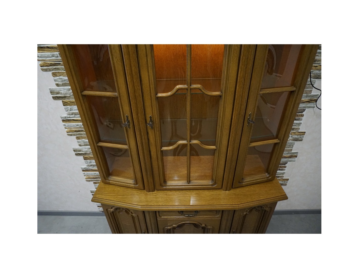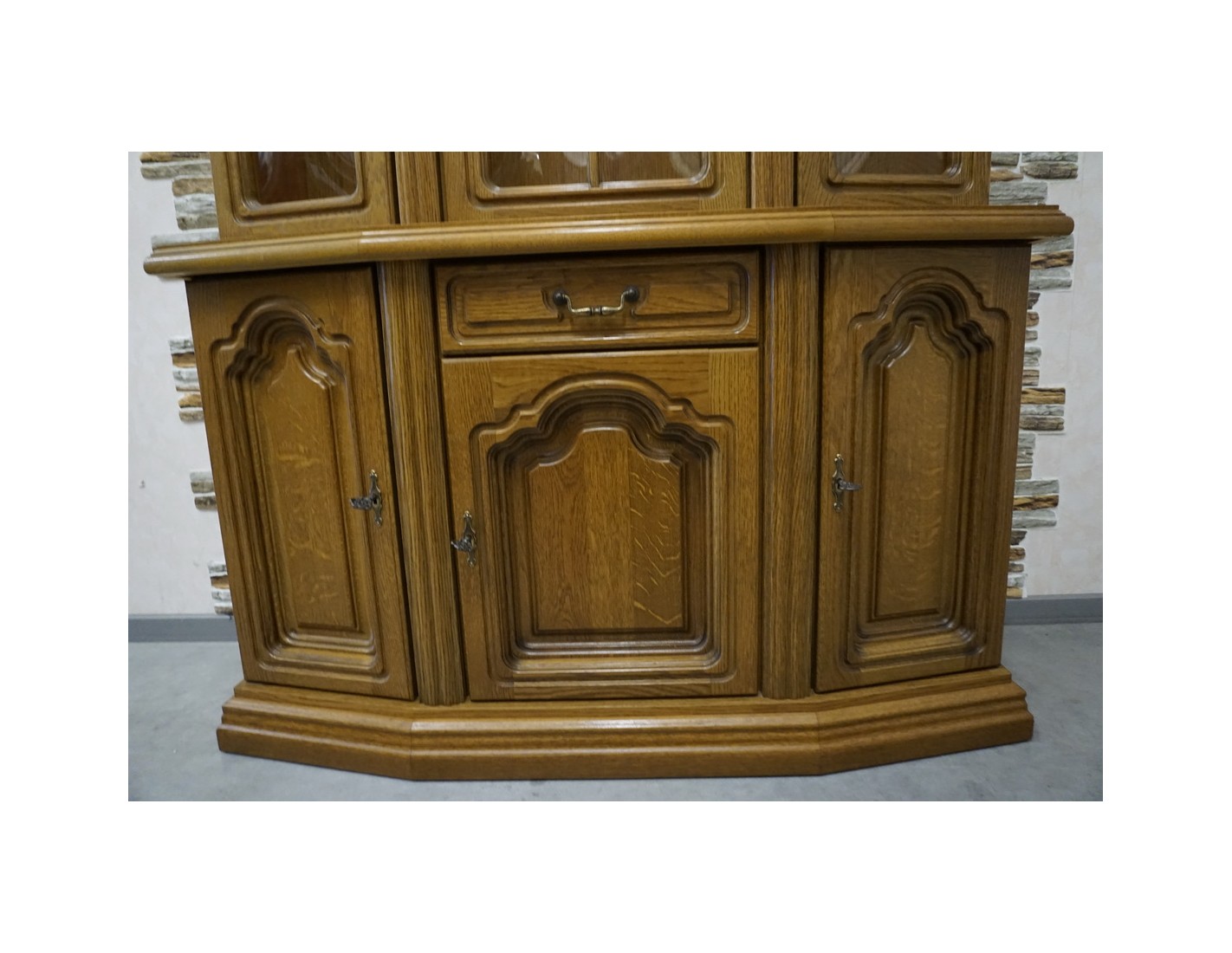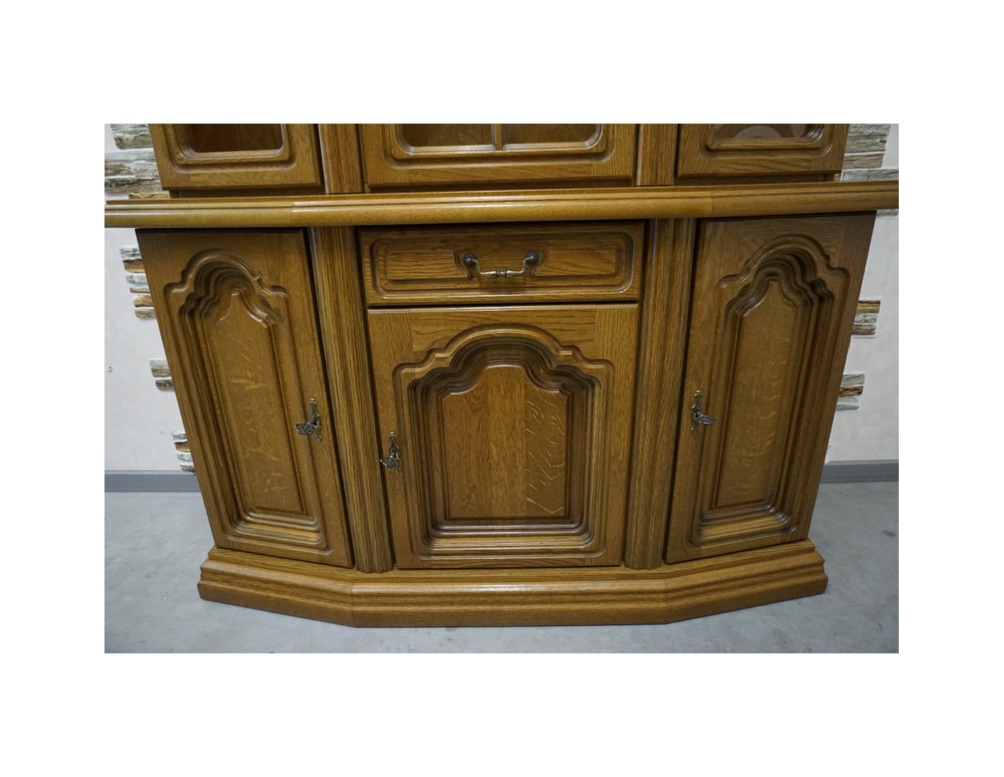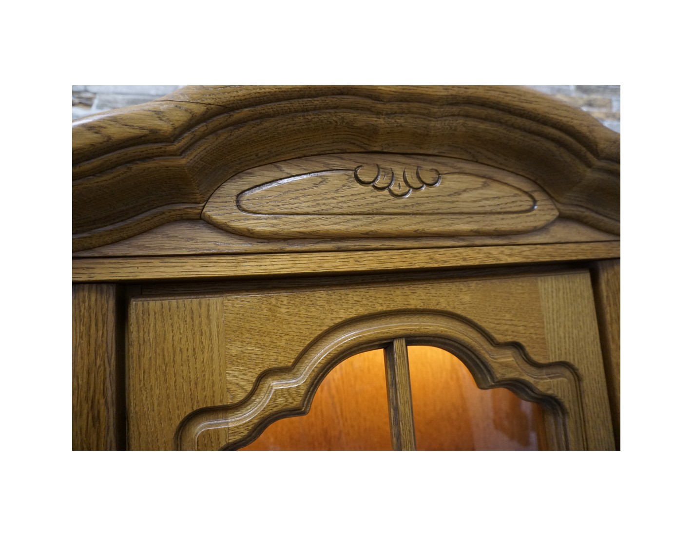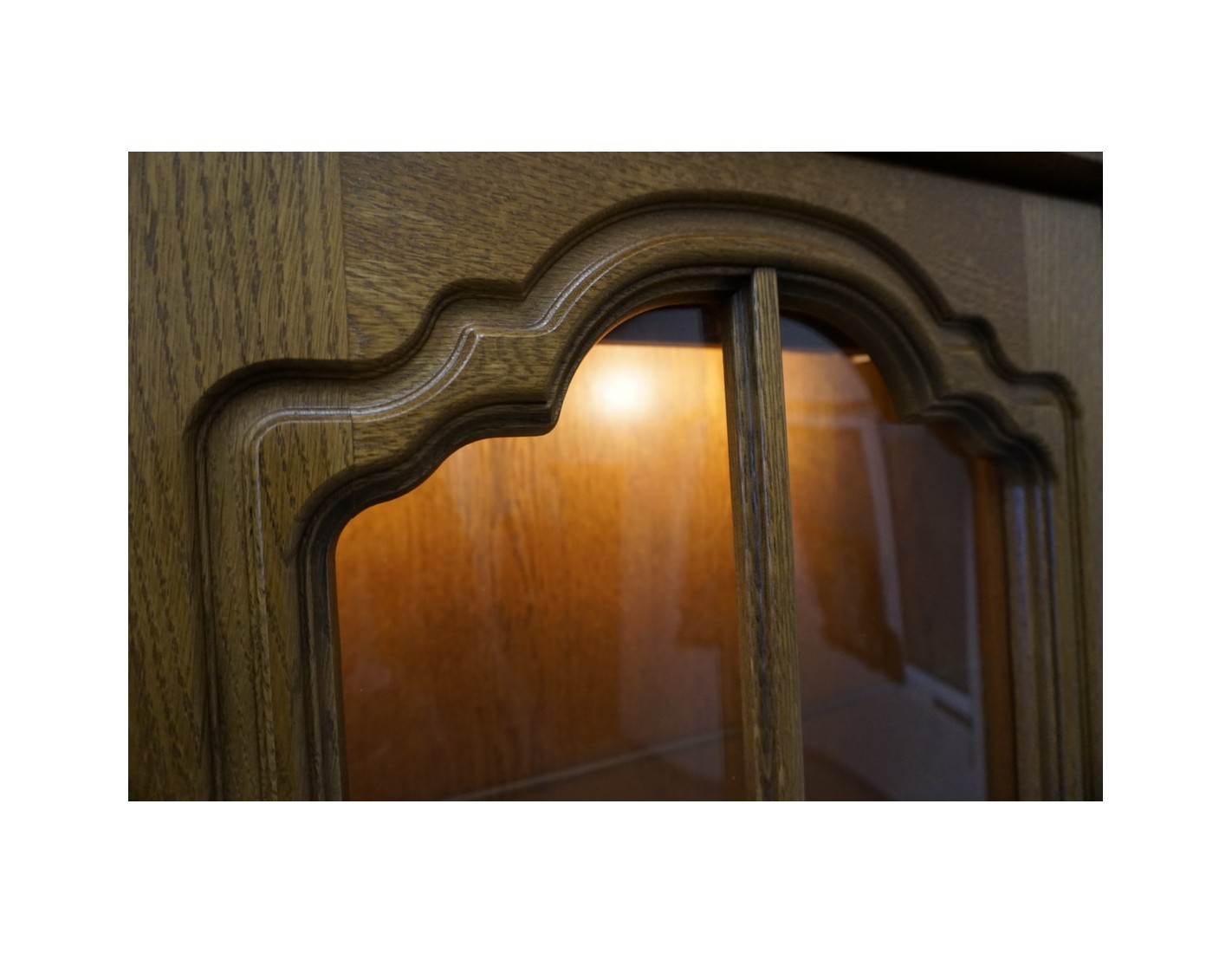 Elegancka witryna z komodą wykonana z drewna dębowego, łącząca klasyczny styl z praktycznymi rozwiązaniami. Mebel doskonale sprawdzi się w salonie, jadalni lub gabinecie, oferując zarówno miejsce do przechowywania, jak i efektowną ekspozycję dekoracji.