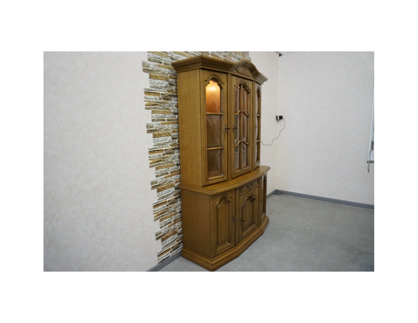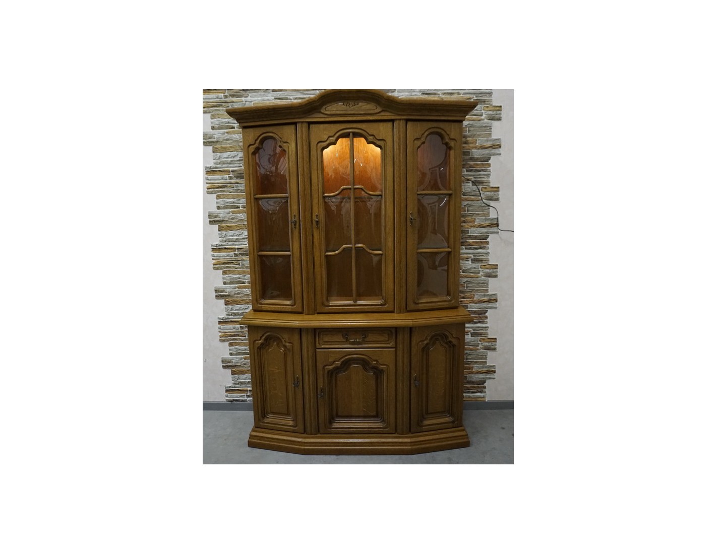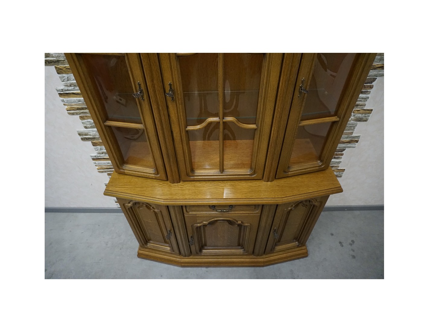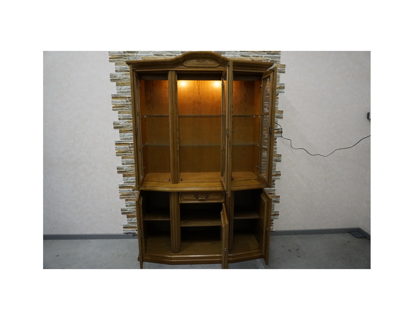 Elegancka witryna z komodą wykonana z drewna dębowego, łącząca klasyczny styl z praktycznymi rozwiązaniami. Mebel doskonale sprawdzi się w salonie, jadalni lub gabinecie, oferując zarówno miejsce do przechowywania, jak i efektowną ekspozycję dekoracji.