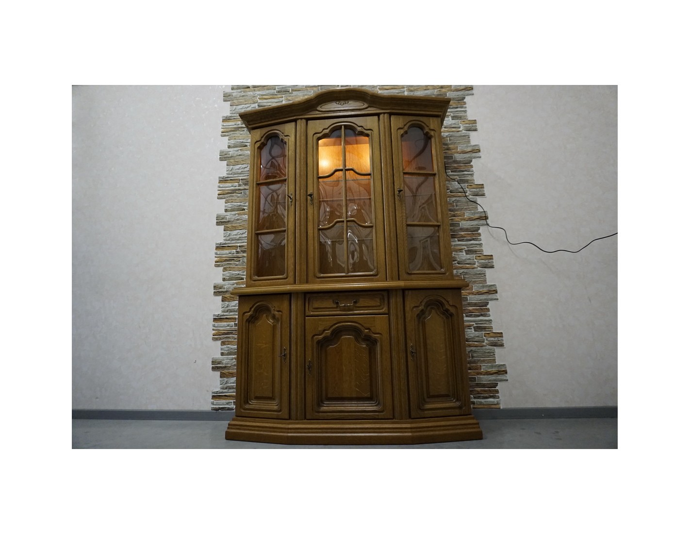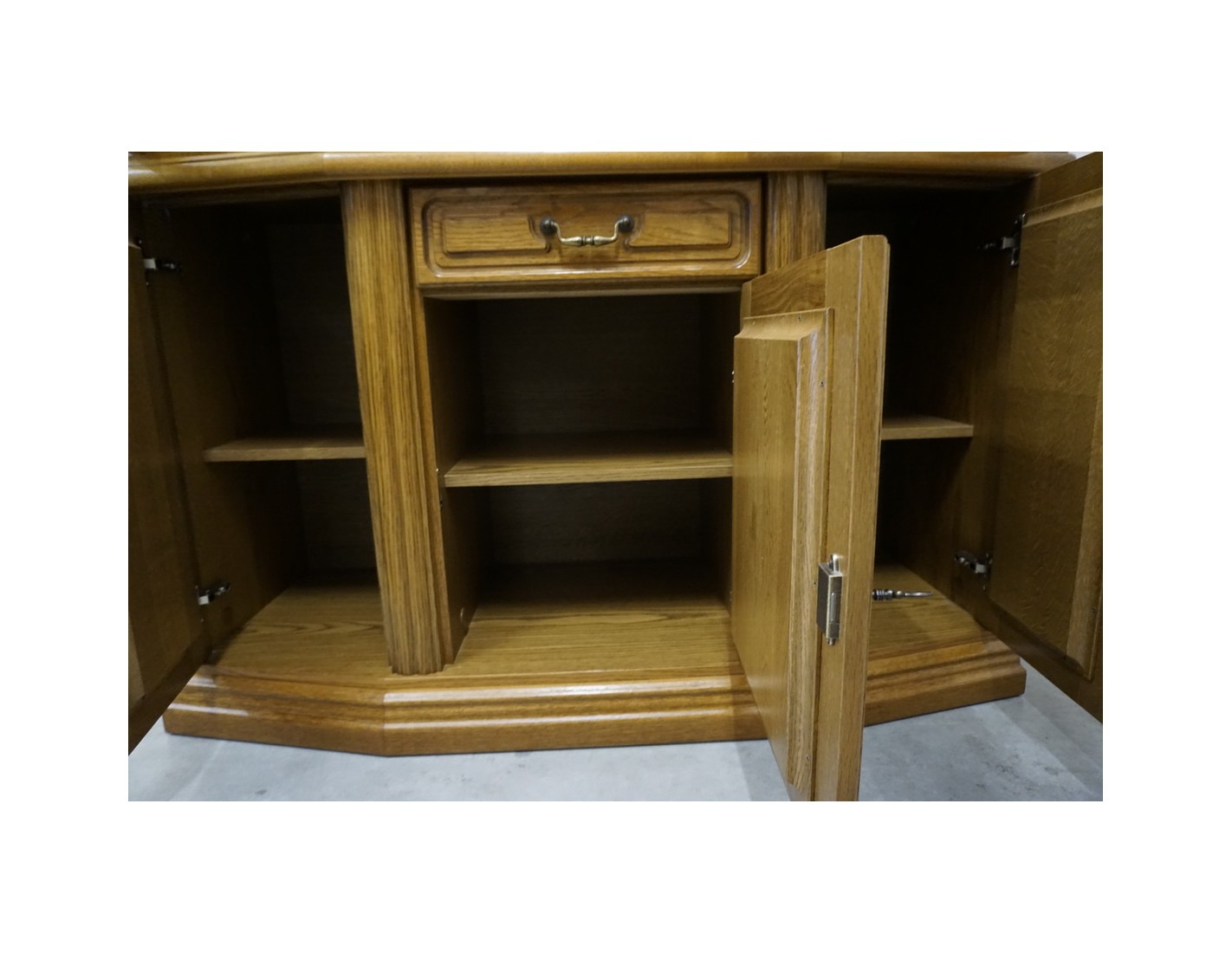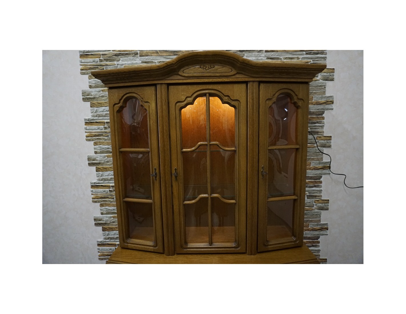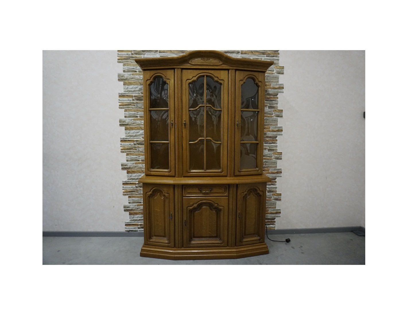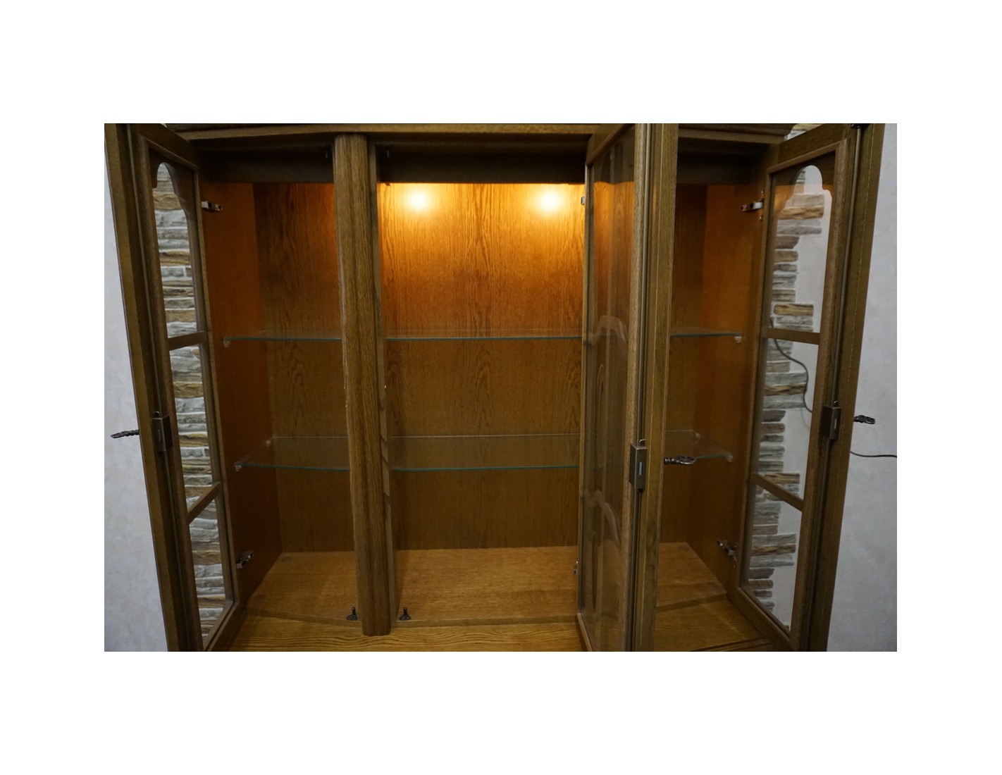 Elegancka witryna z komodą wykonana z drewna dębowego, łącząca klasyczny styl z praktycznymi rozwiązaniami. Mebel doskonale sprawdzi się w salonie, jadalni lub gabinecie, oferując zarówno miejsce do przechowywania, jak i efektowną ekspozycję dekoracji.