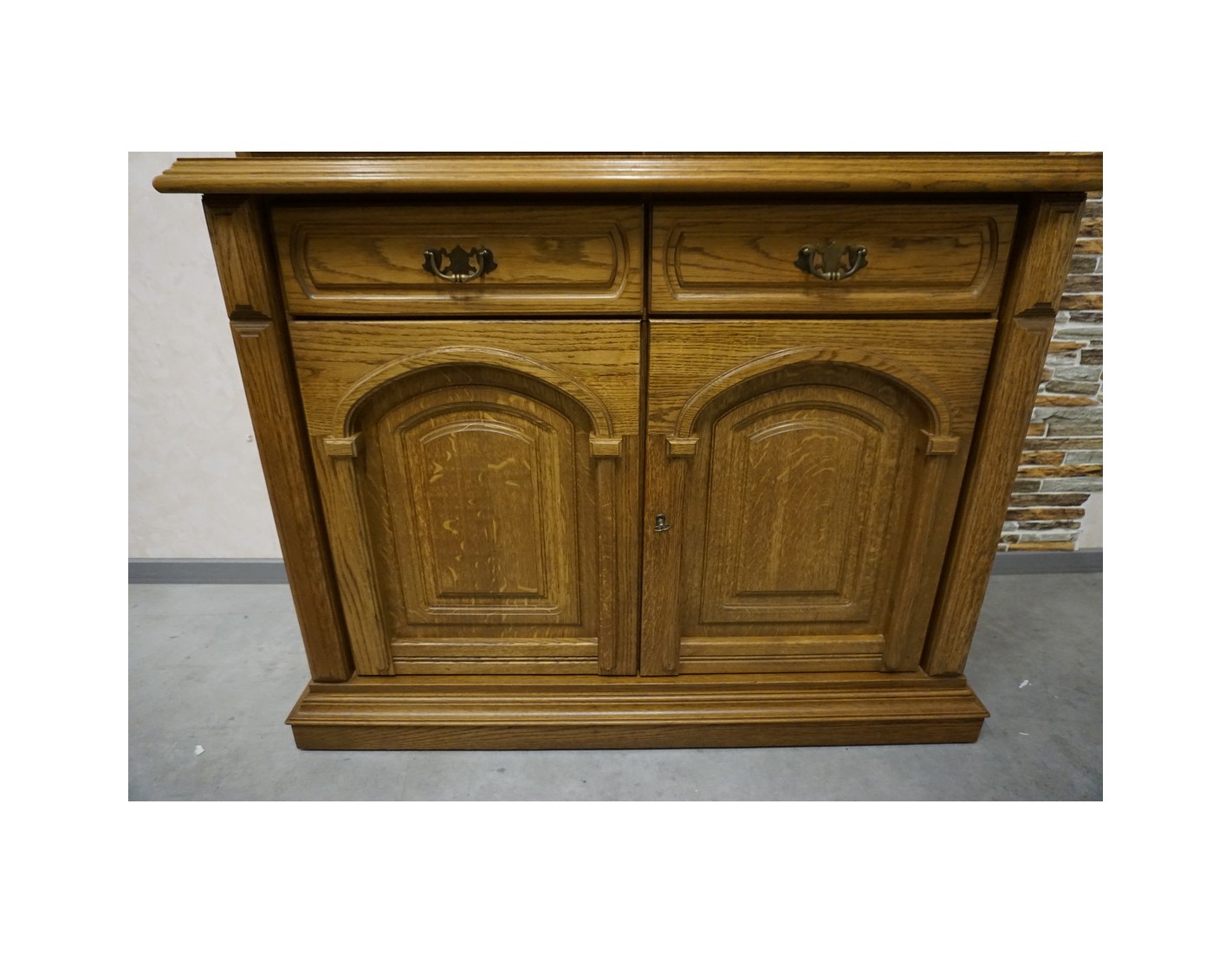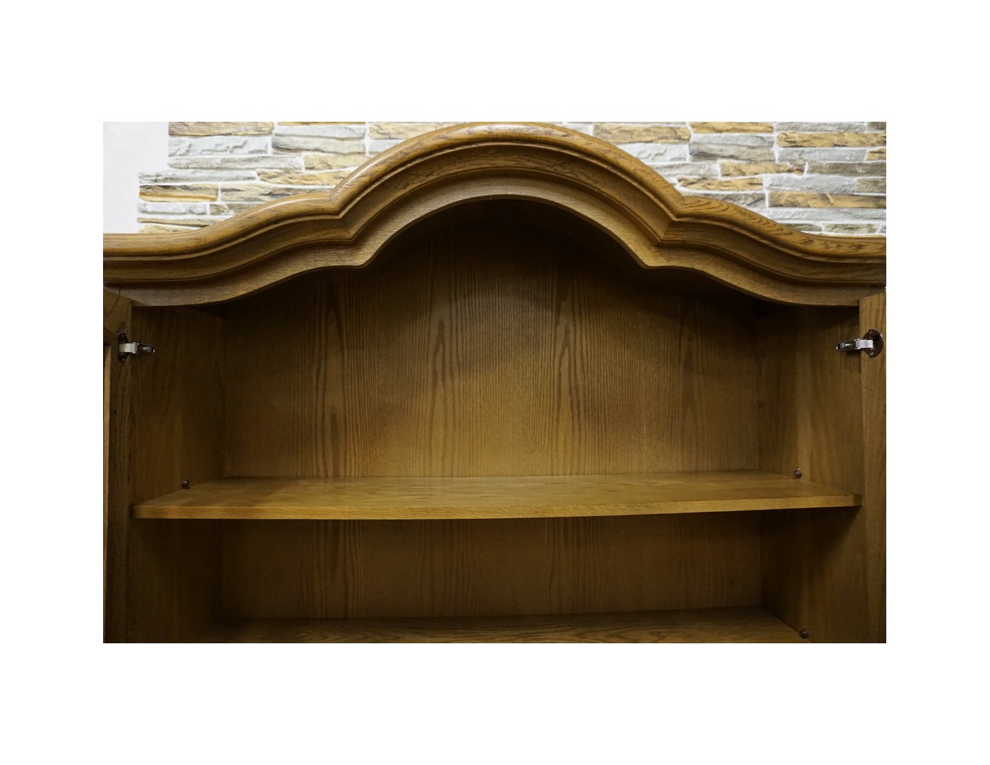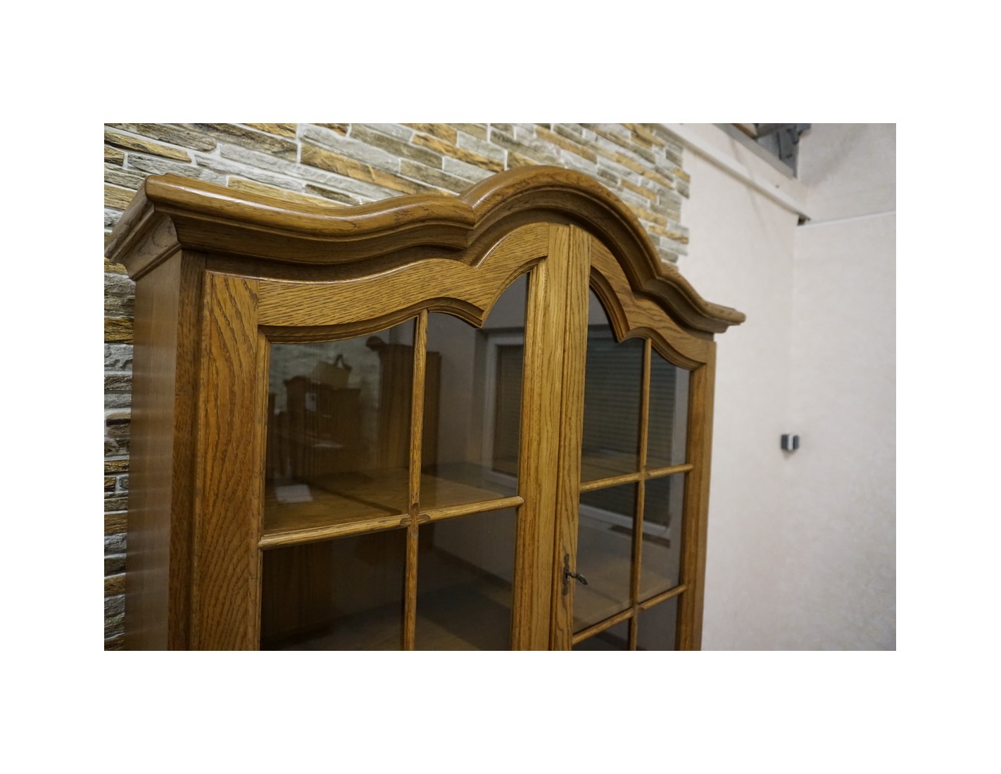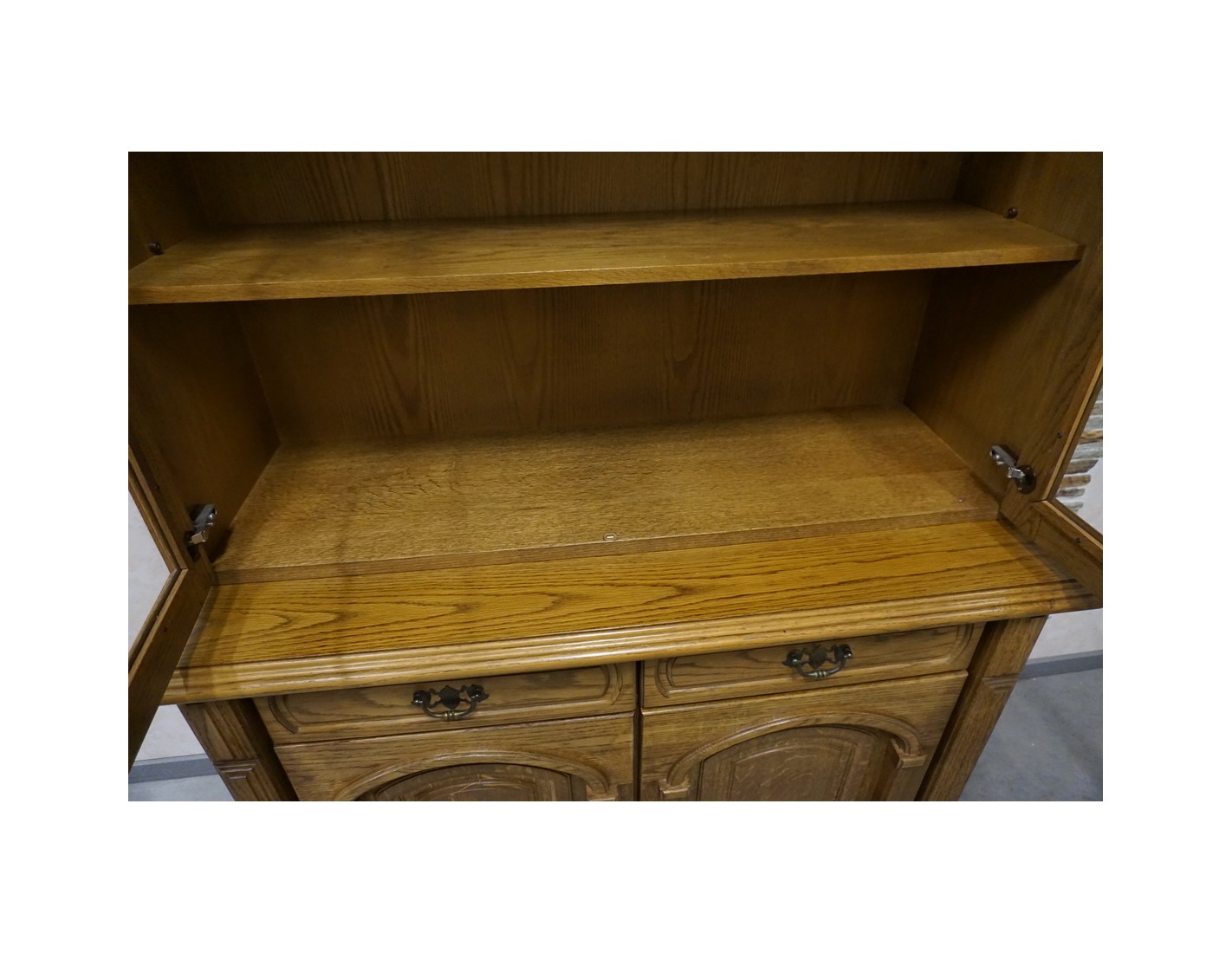 - dębowa witryna z komodą w ciemnym wybarwieniu