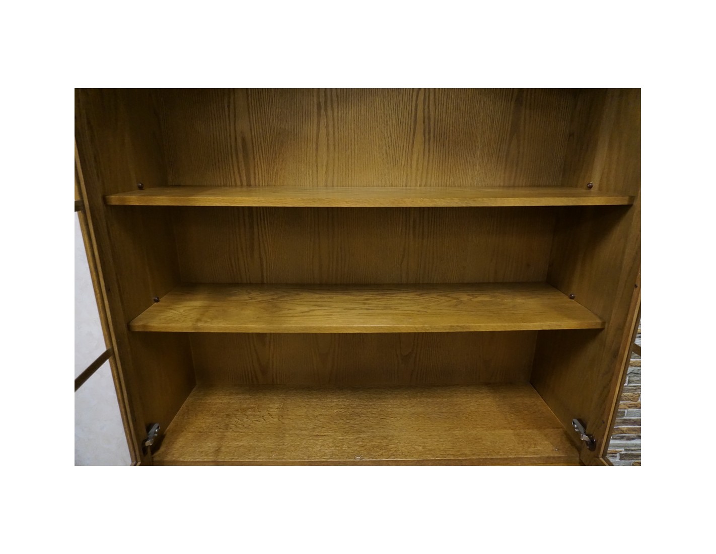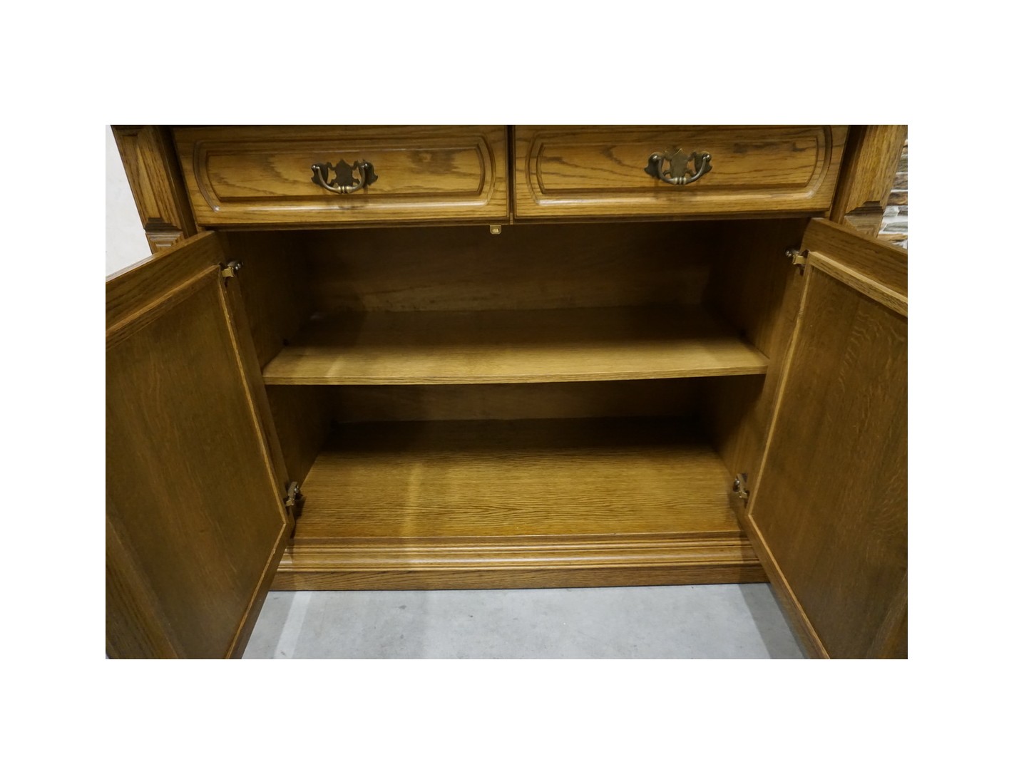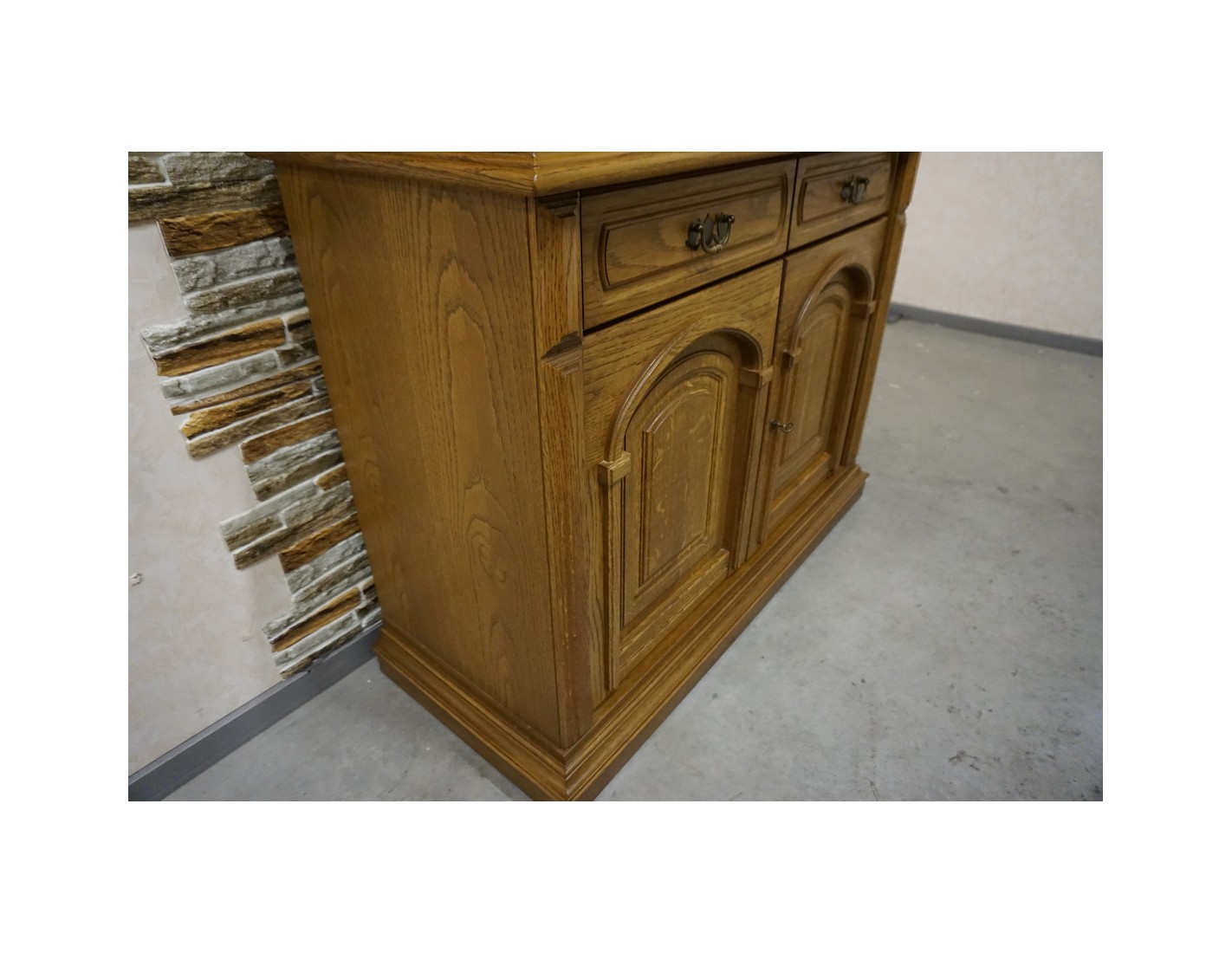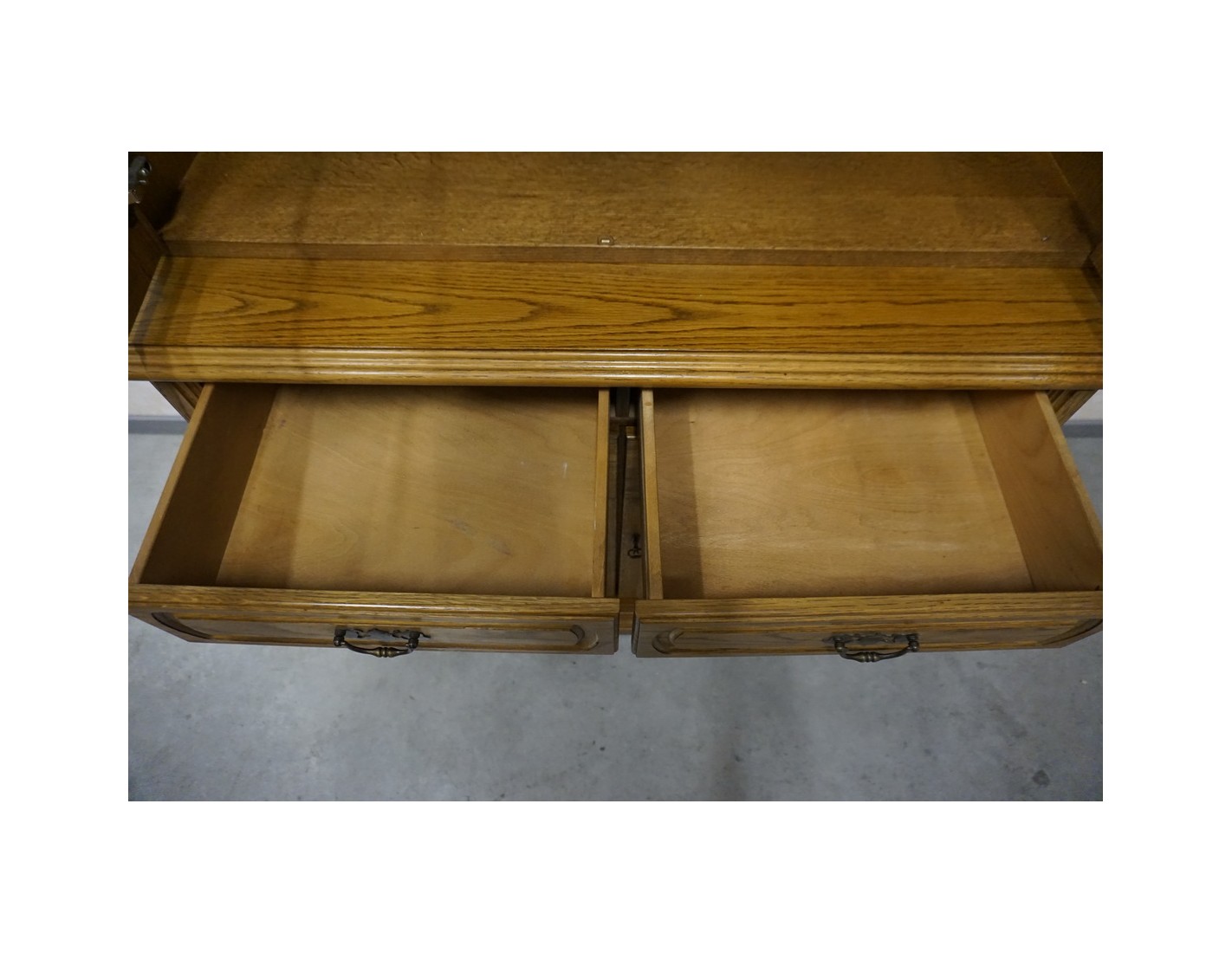 - dębowa witryna z komodą w ciemnym wybarwieniu
