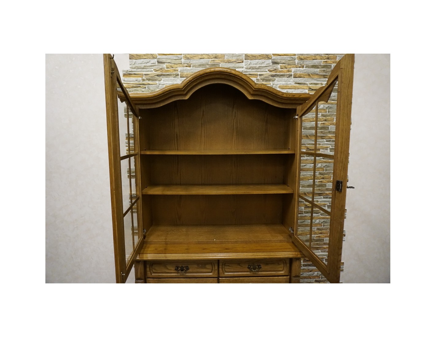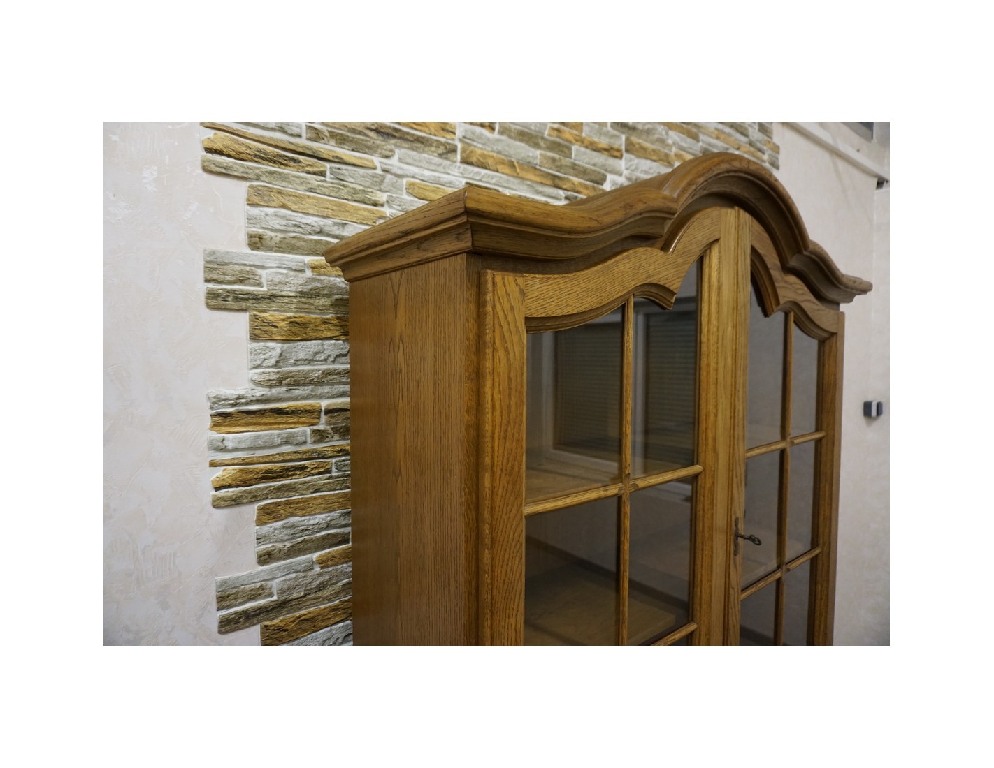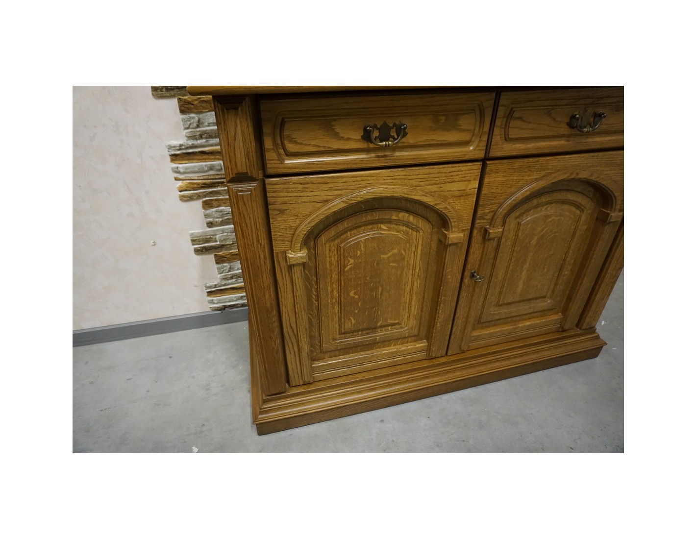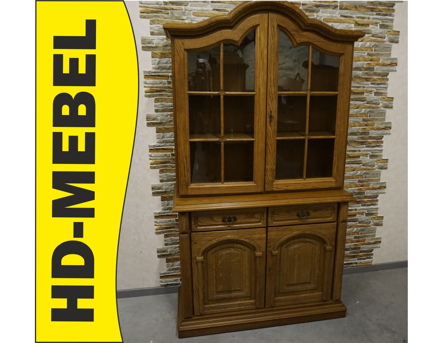 - dębowa witryna z komodą w ciemnym wybarwieniu