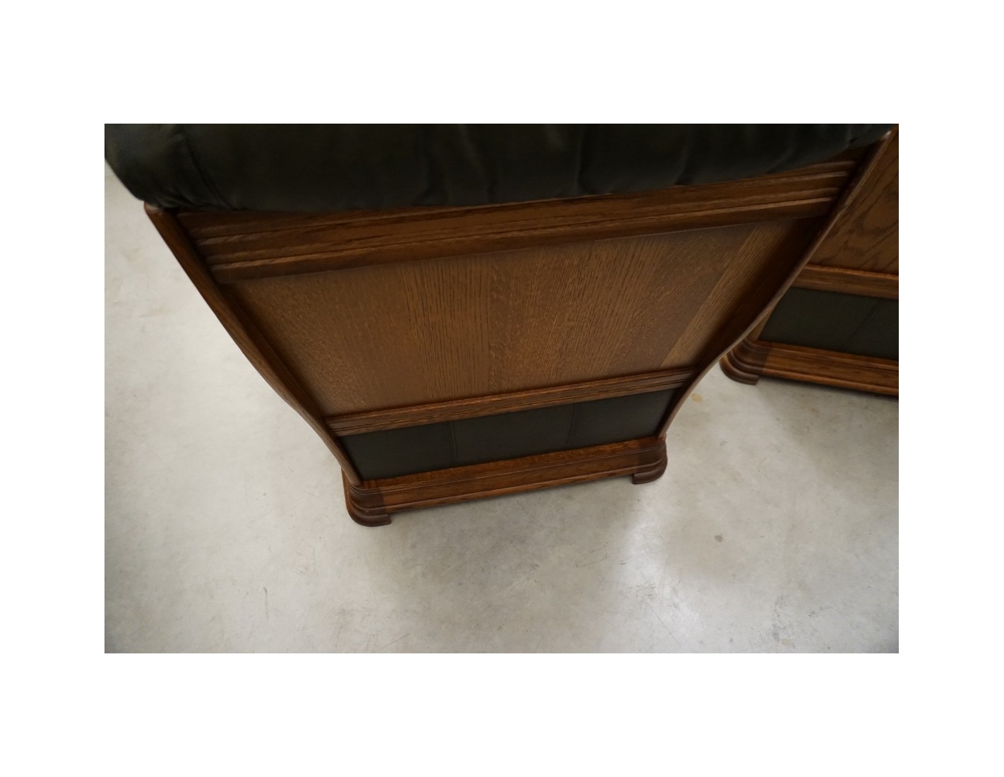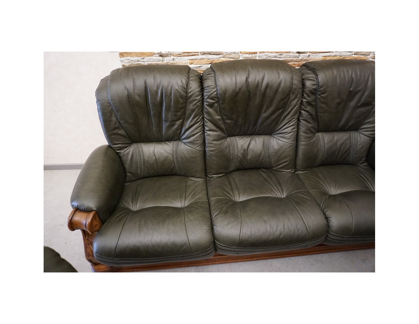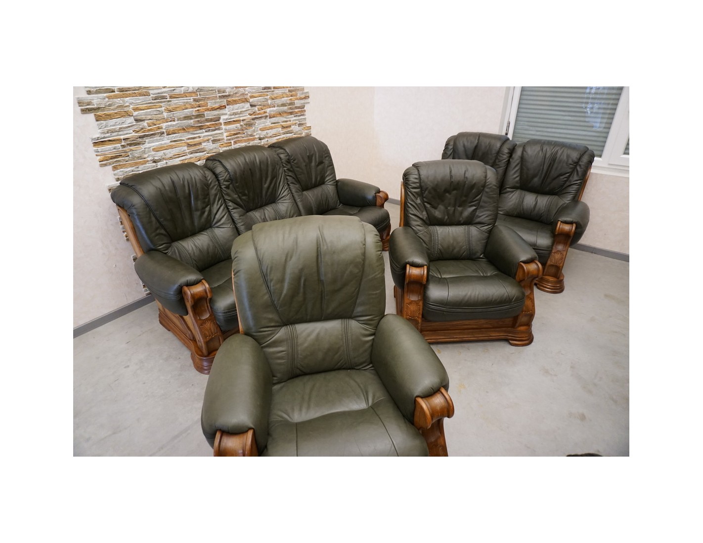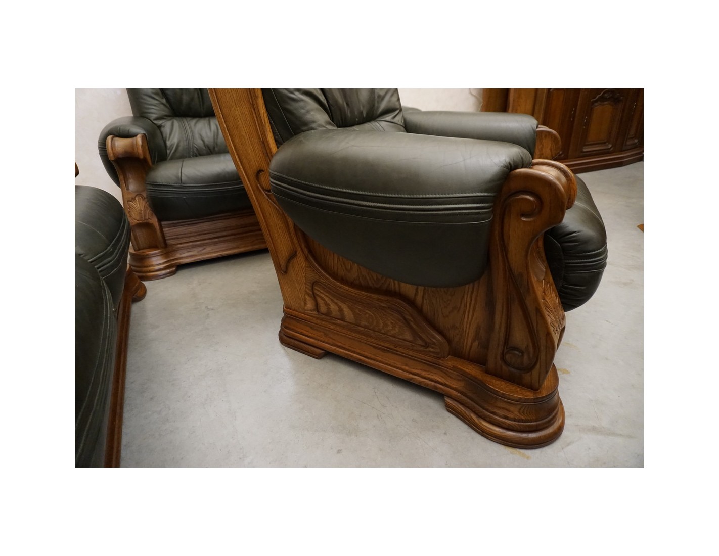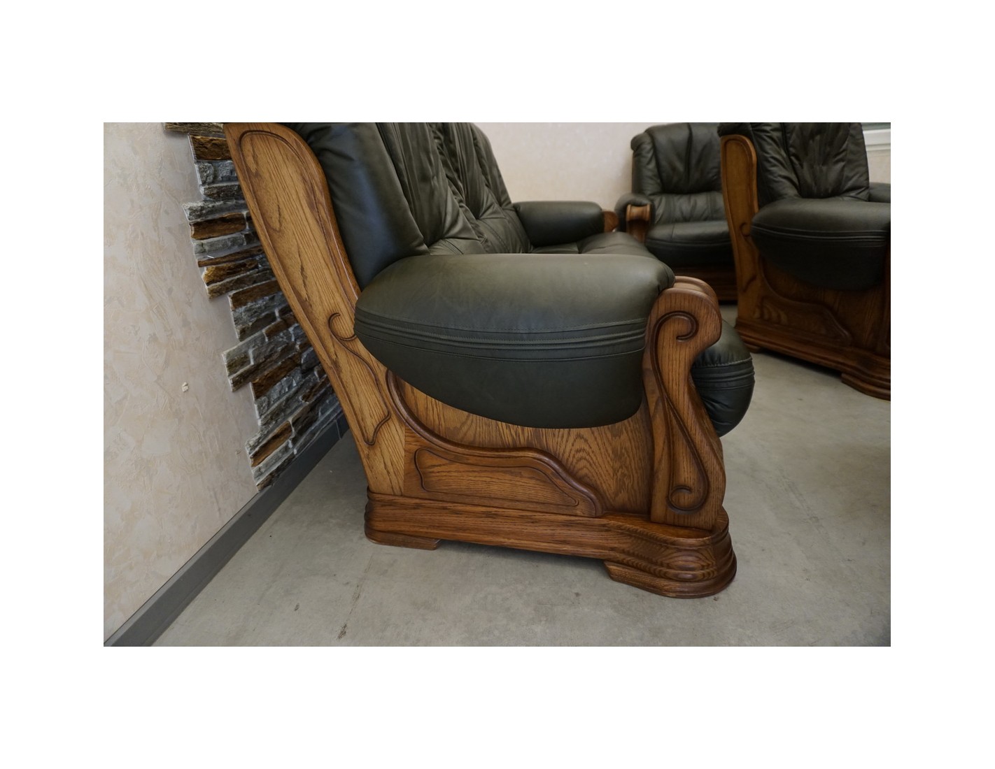 Kompletny zestaw wypoczynkowy na solidnym stelażu dębowym, obejmujący sofę 3-osobową, sofę 2-osobową oraz dwa fotele. Tapicerka wykonana z naturalnej skóry w klasycznym odcieniu brązu. Jeden z foteli jest lekko jaśniejszy, co nadaje zestawowi unikalnego charakteru.