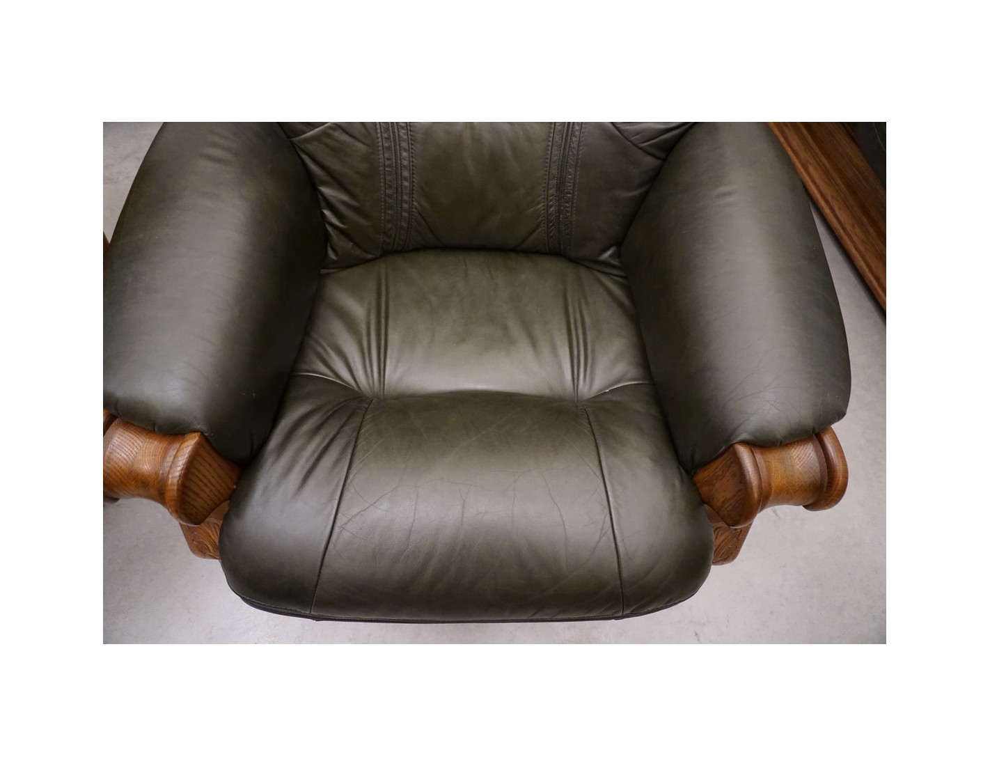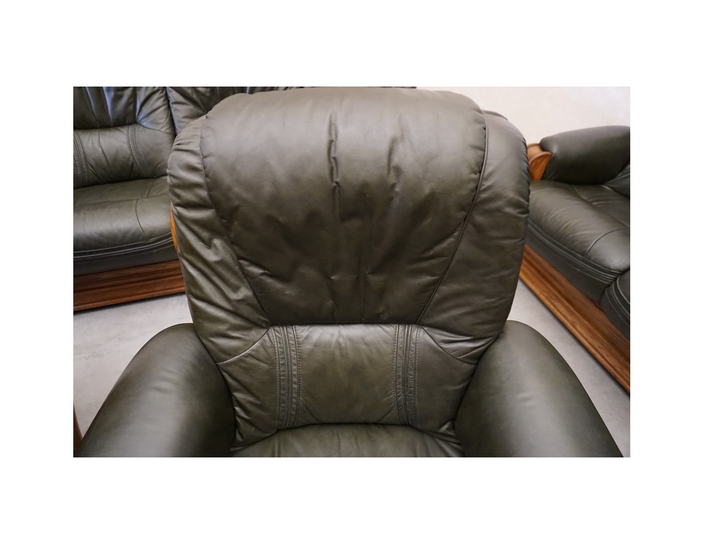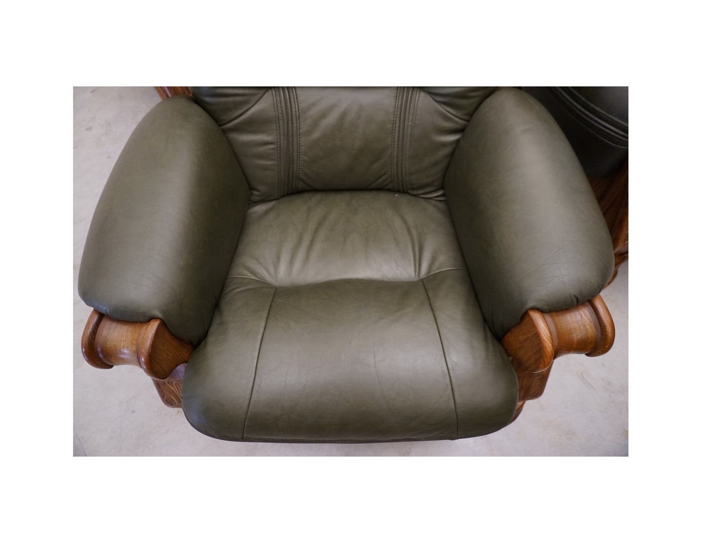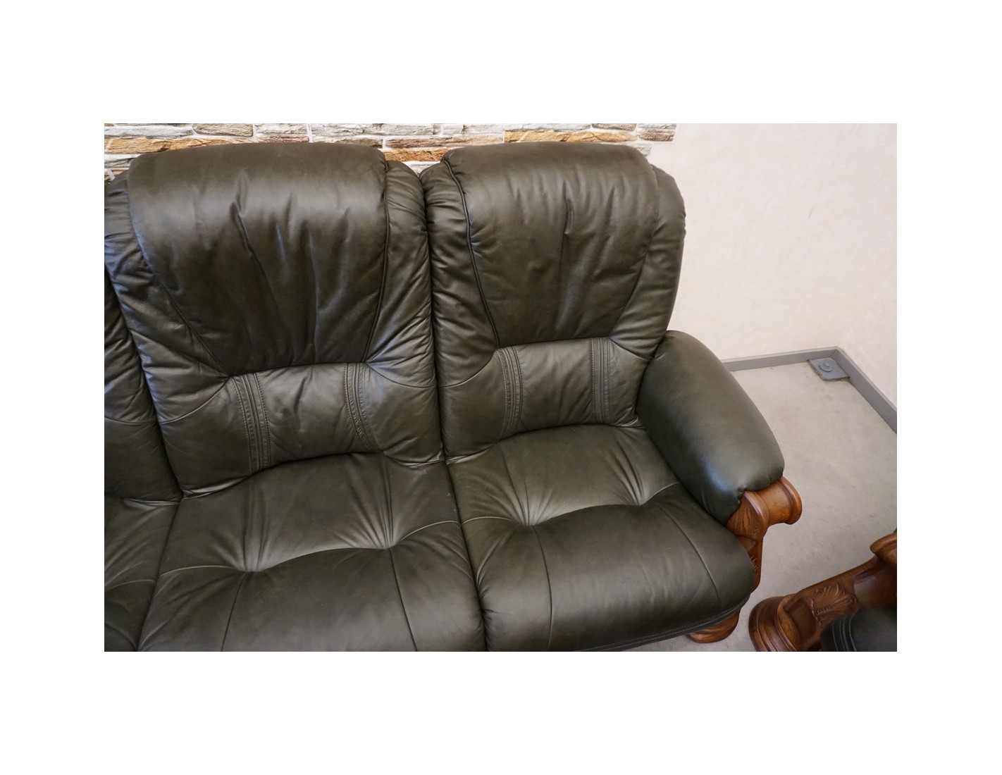 Kompletny zestaw wypoczynkowy na solidnym stelażu dębowym, obejmujący sofę 3-osobową, sofę 2-osobową oraz dwa fotele. Tapicerka wykonana z naturalnej skóry w klasycznym odcieniu brązu. Jeden z foteli jest lekko jaśniejszy, co nadaje zestawowi unikalnego charakteru.