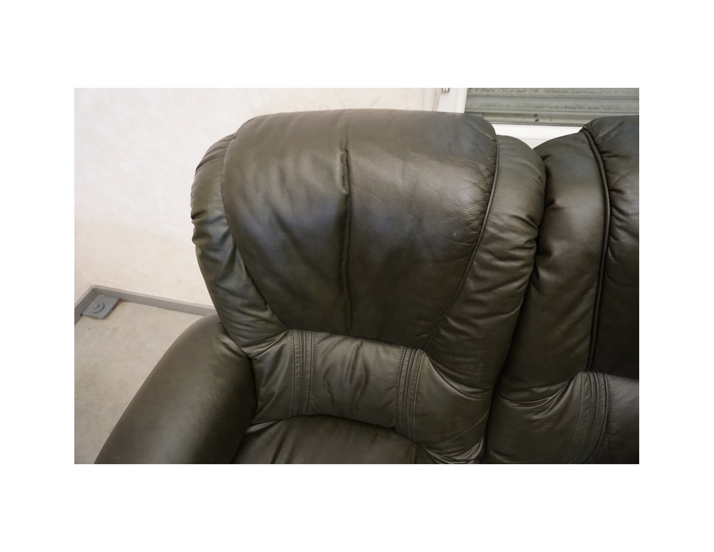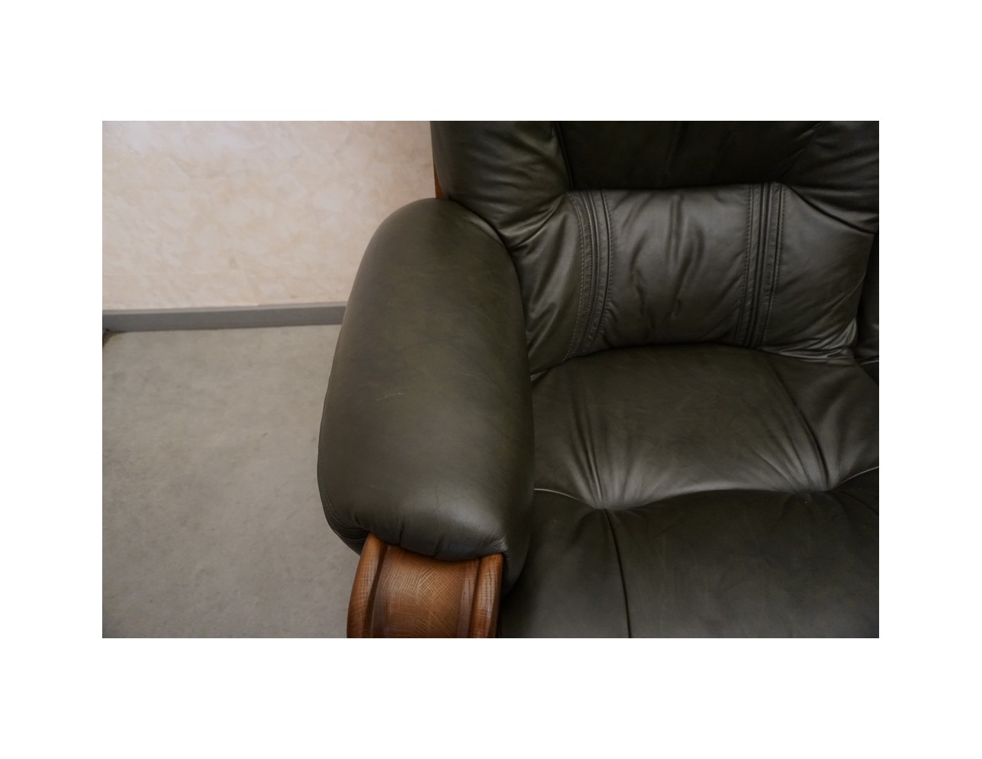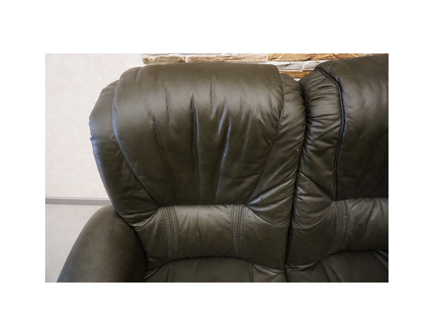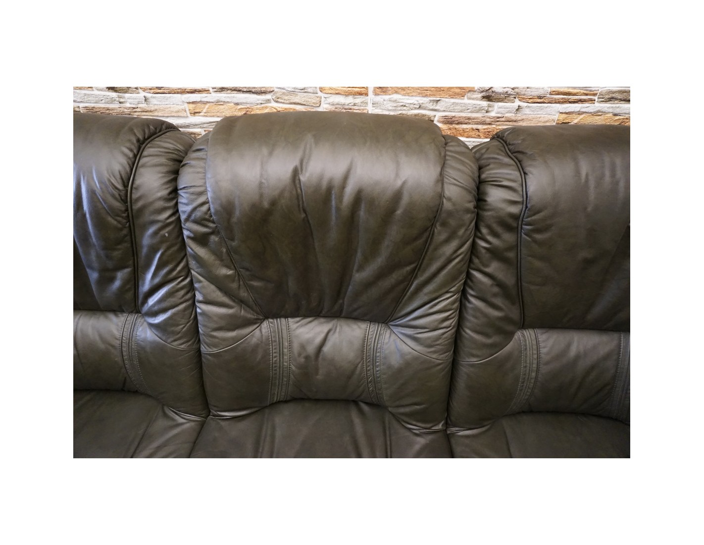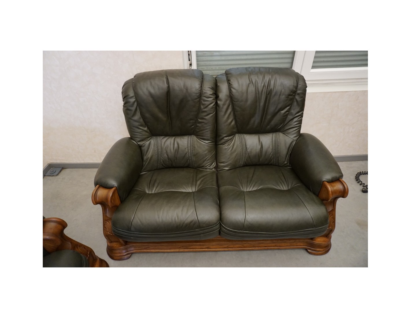 Kompletny zestaw wypoczynkowy na solidnym stelażu dębowym, obejmujący sofę 3-osobową, sofę 2-osobową oraz dwa fotele. Tapicerka wykonana z naturalnej skóry w klasycznym odcieniu brązu. Jeden z foteli jest lekko jaśniejszy, co nadaje zestawowi unikalnego charakteru.