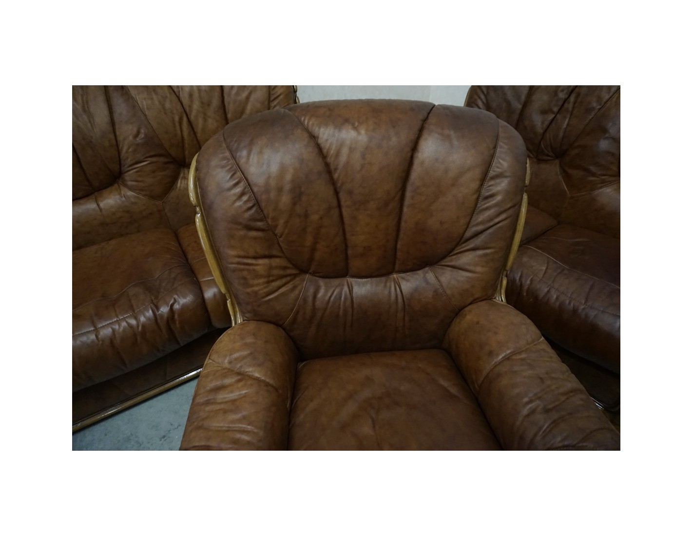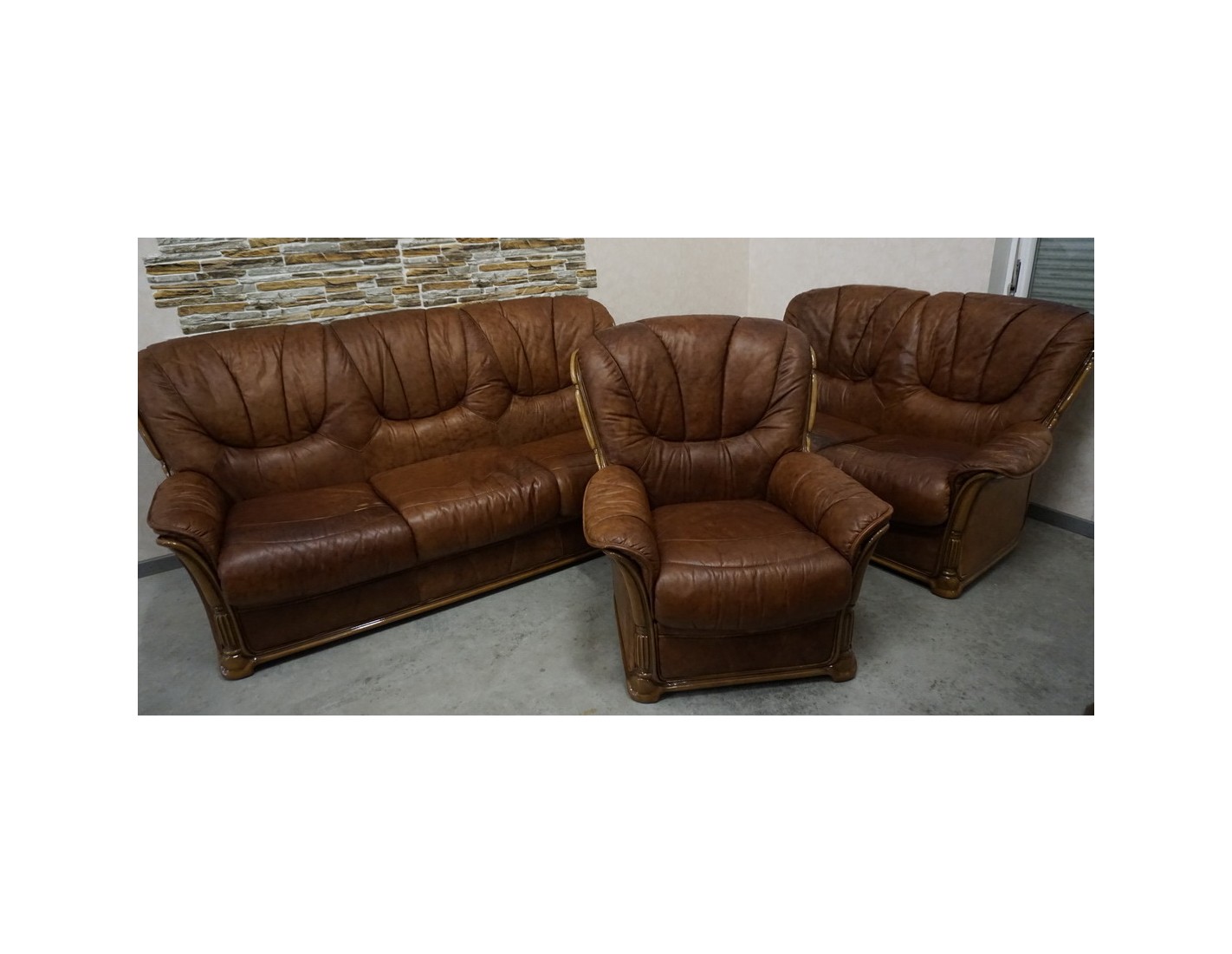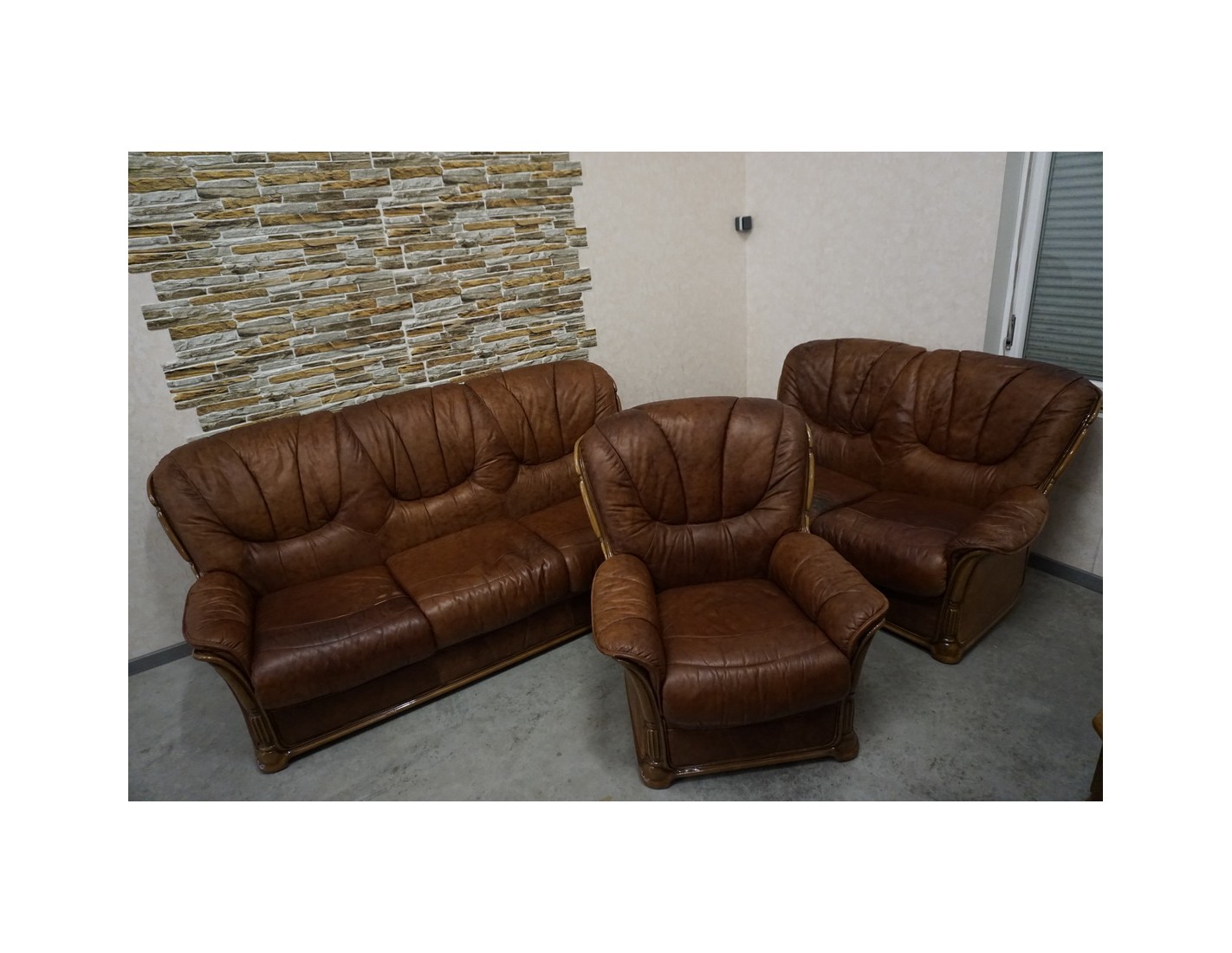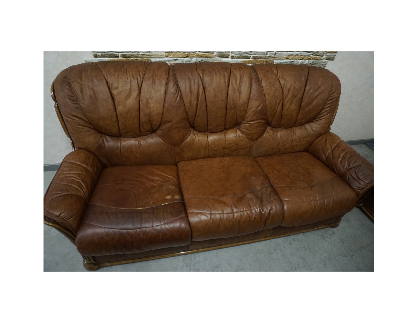 Klasyczny zestaw wypoczynkowy wykonany ze skóry naturalnej w układzie 3+2+1. Komplet składa się z sofy trzyosobowej, sofy dwuosobowej oraz fotela. Mebel przeznaczony jest do renowacji, co daje możliwość odświeżenia i dopasowania go do własnej aranżacji wnętrza.