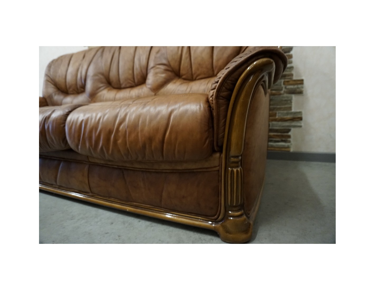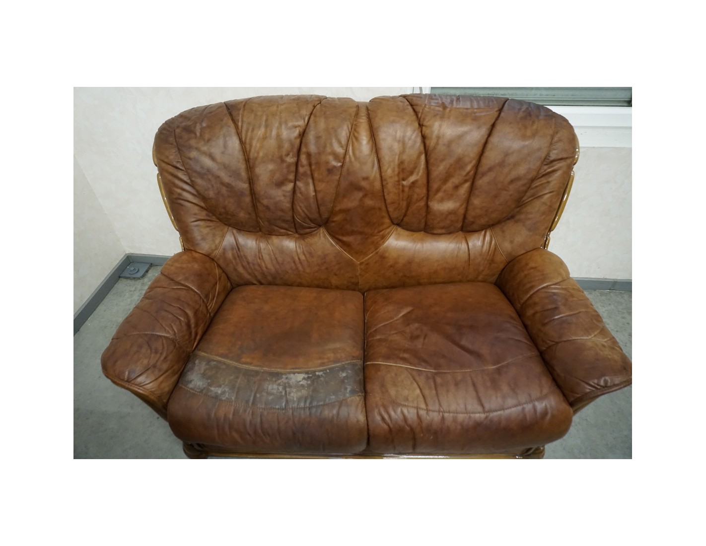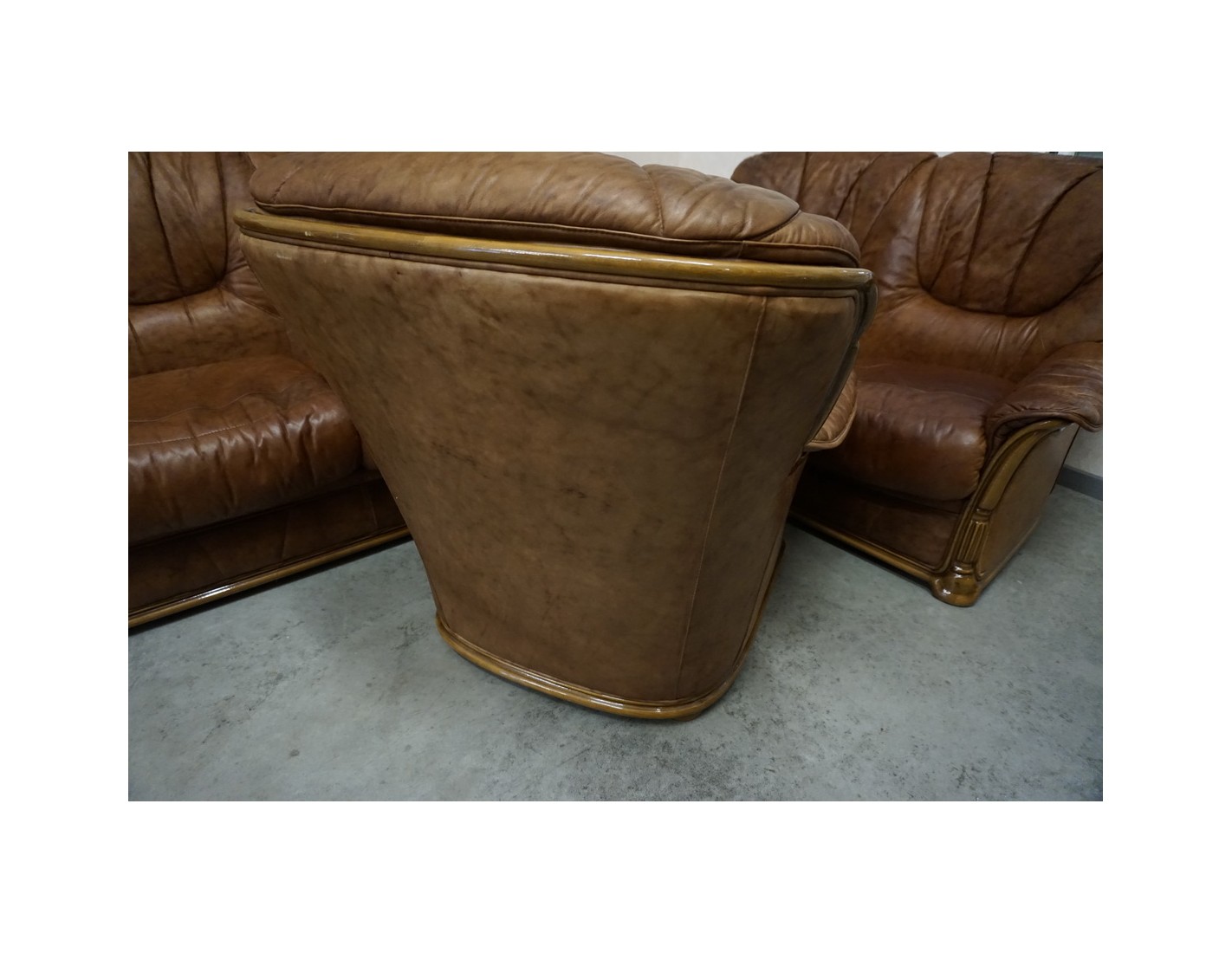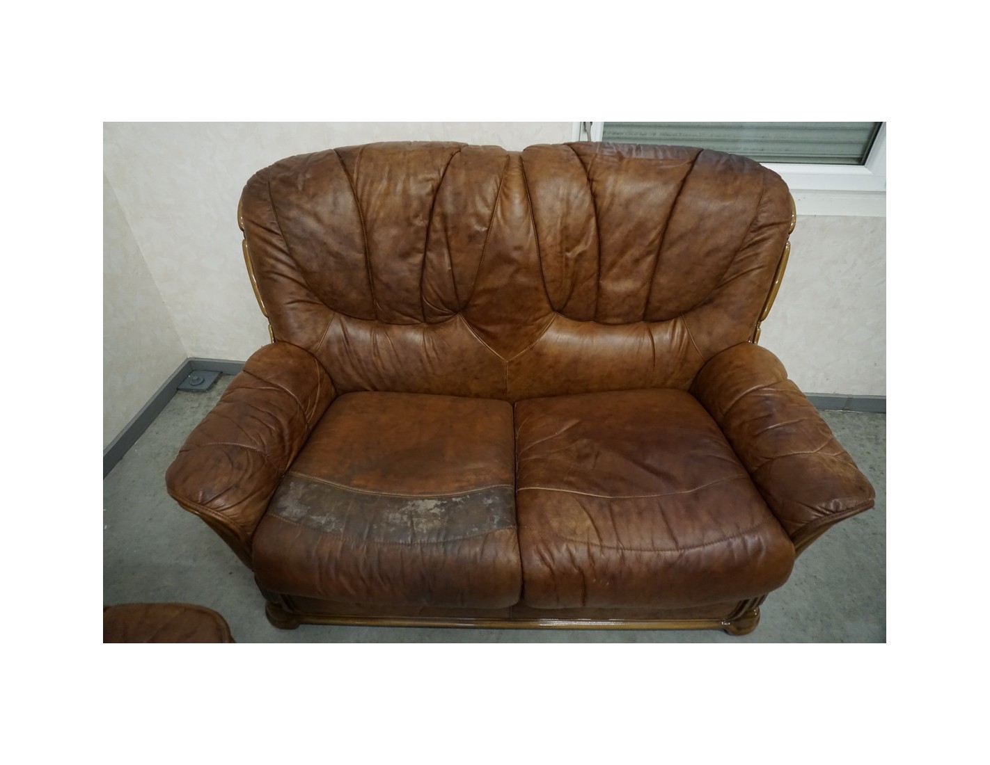 Klasyczny zestaw wypoczynkowy wykonany ze skóry naturalnej w układzie 3+2+1. Komplet składa się z sofy trzyosobowej, sofy dwuosobowej oraz fotela. Mebel przeznaczony jest do renowacji, co daje możliwość odświeżenia i dopasowania go do własnej aranżacji wnętrza.