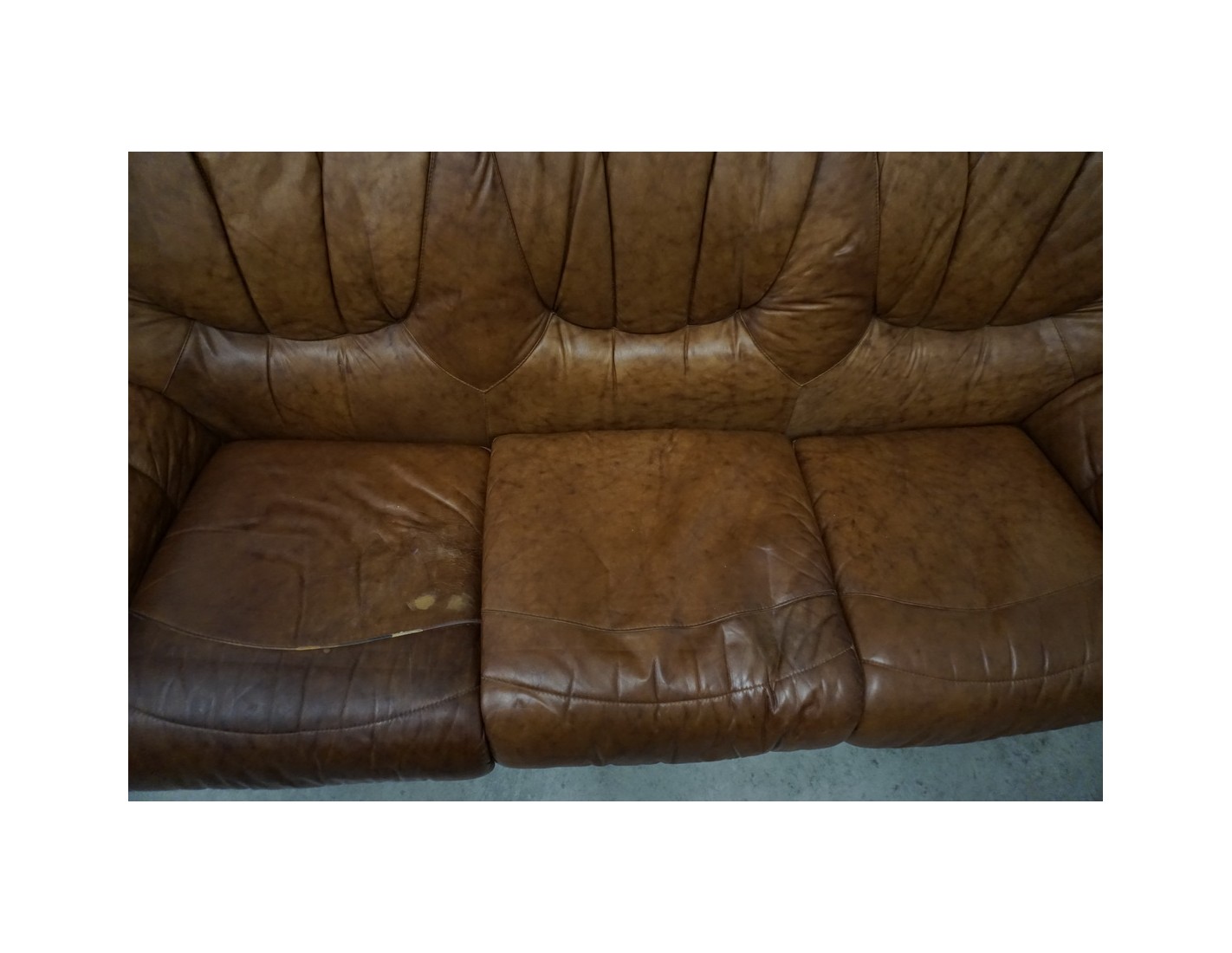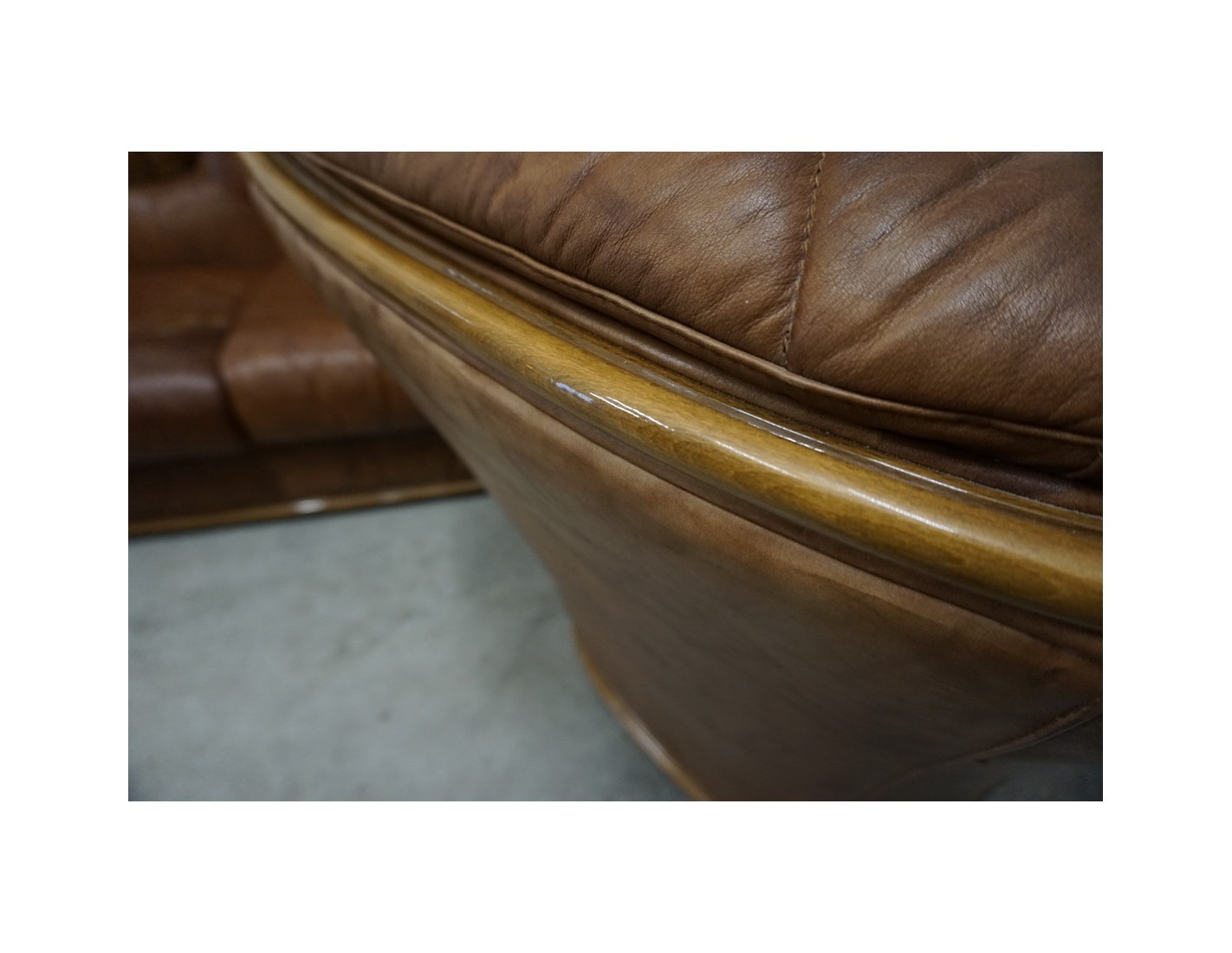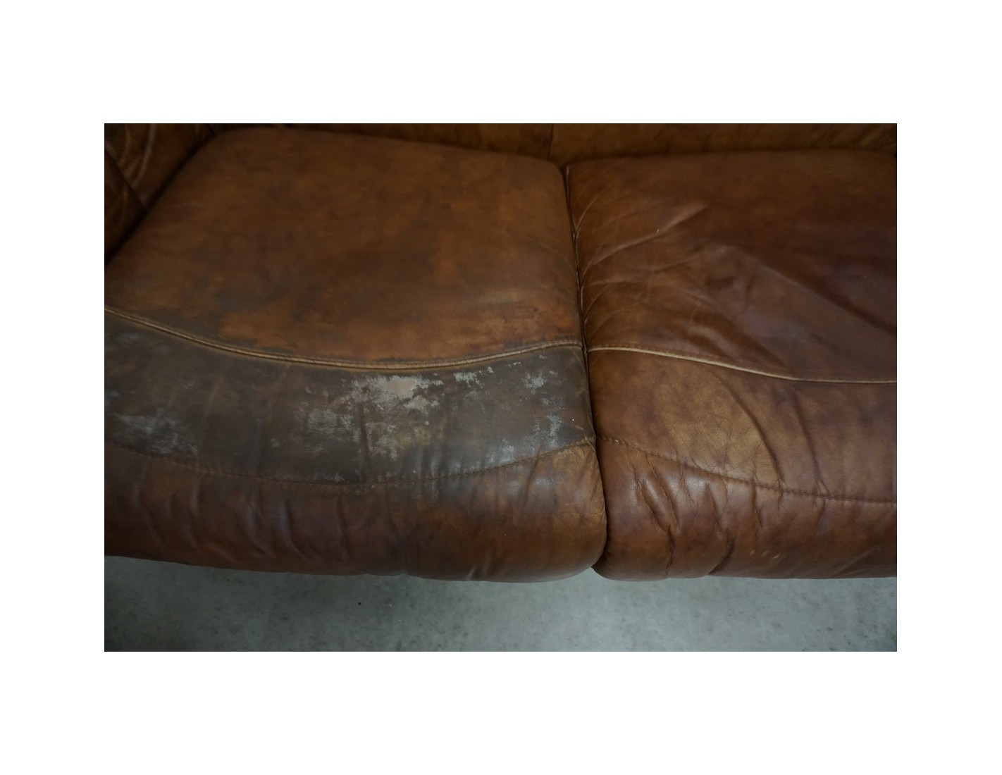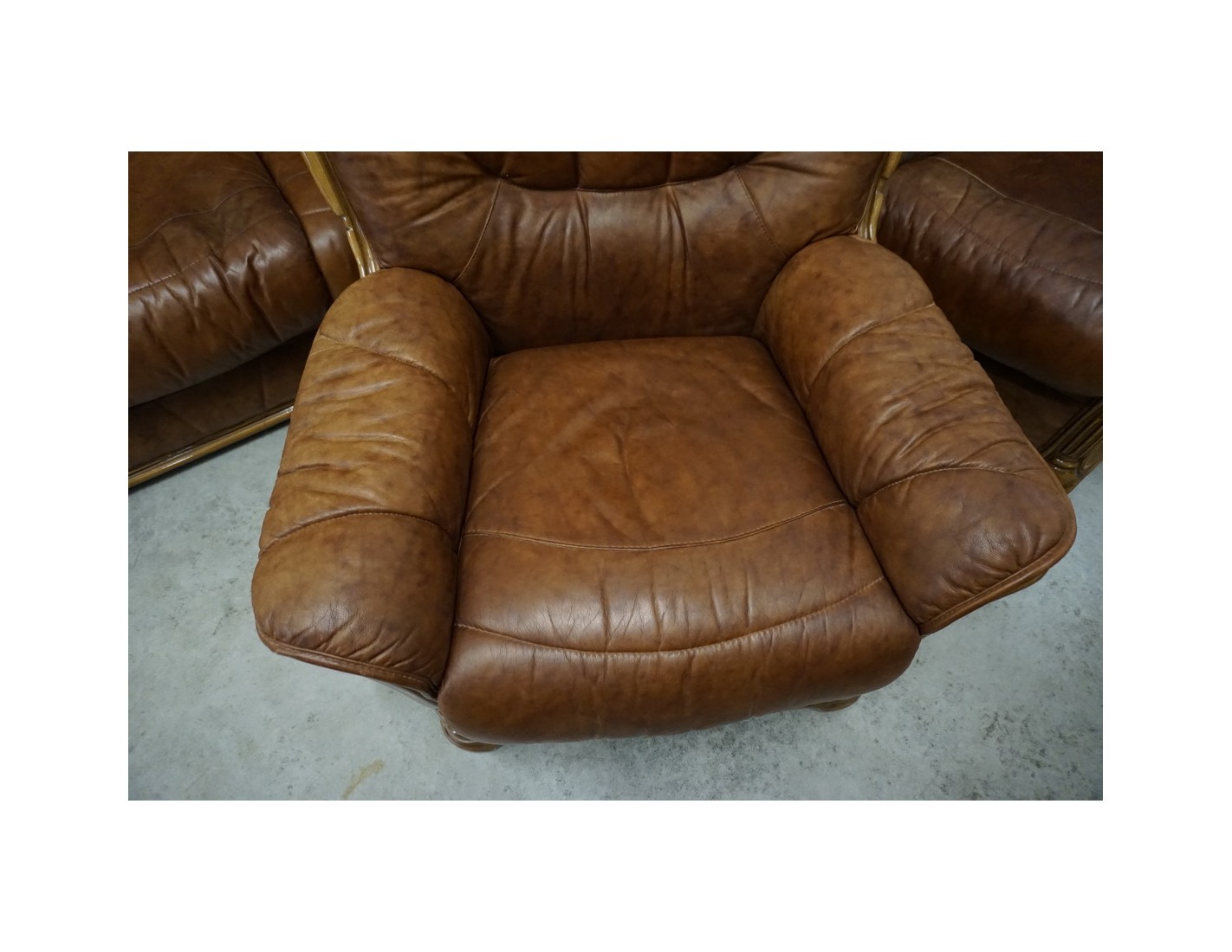 Klasyczny zestaw wypoczynkowy wykonany ze skóry naturalnej w układzie 3+2+1. Komplet składa się z sofy trzyosobowej, sofy dwuosobowej oraz fotela. Mebel przeznaczony jest do renowacji, co daje możliwość odświeżenia i dopasowania go do własnej aranżacji wnętrza.