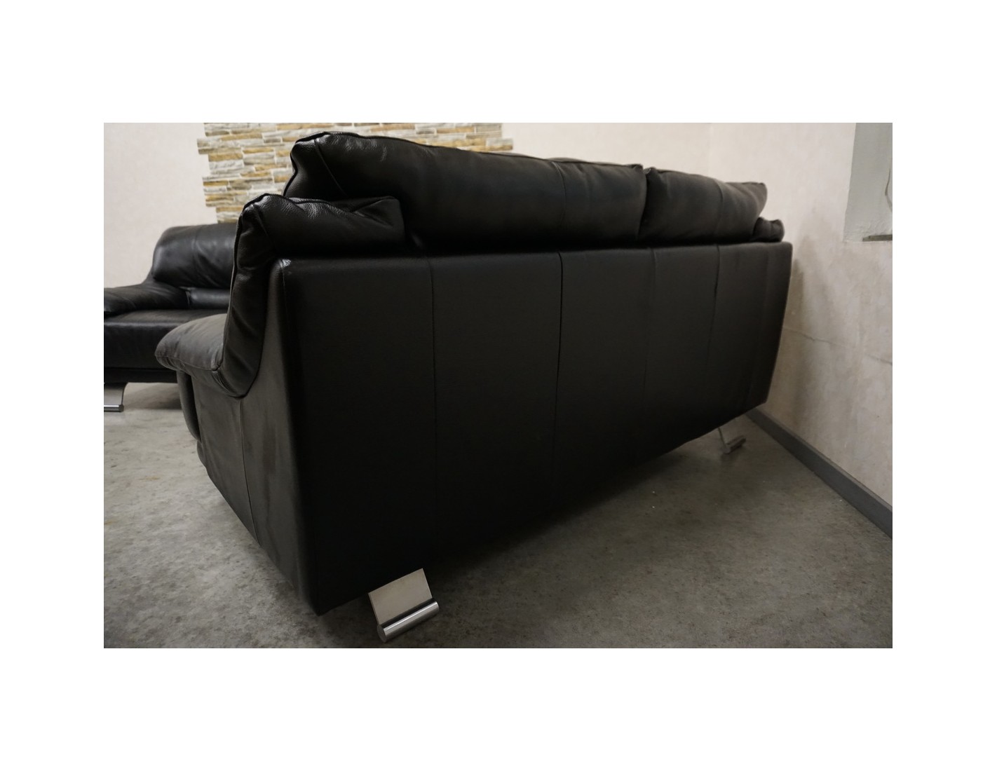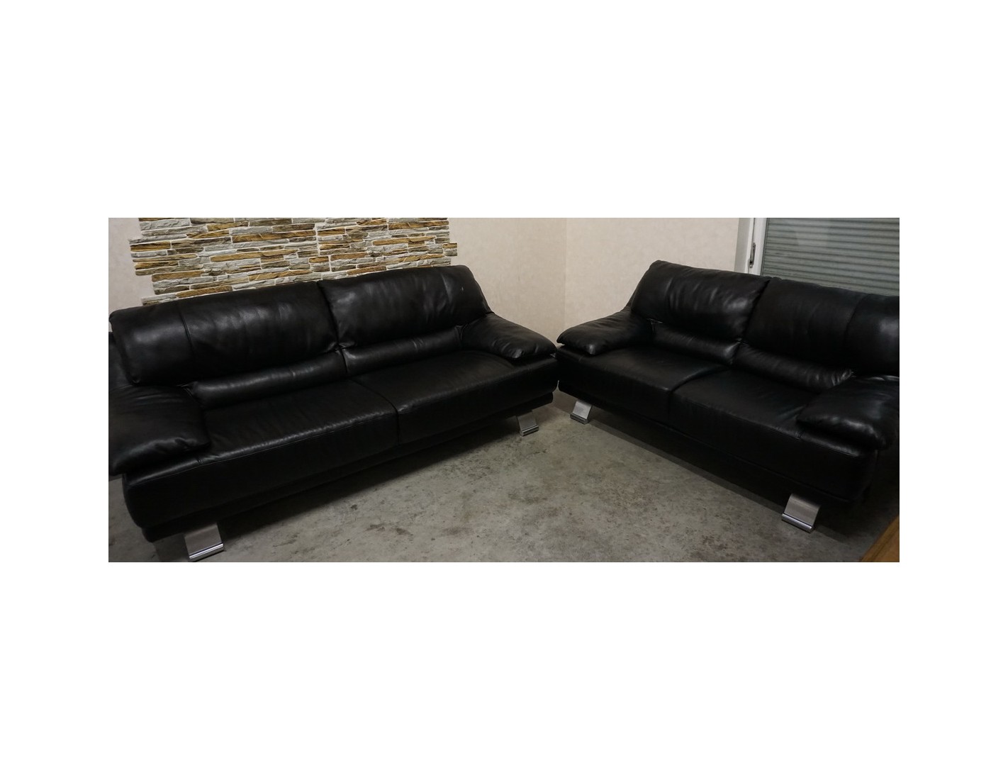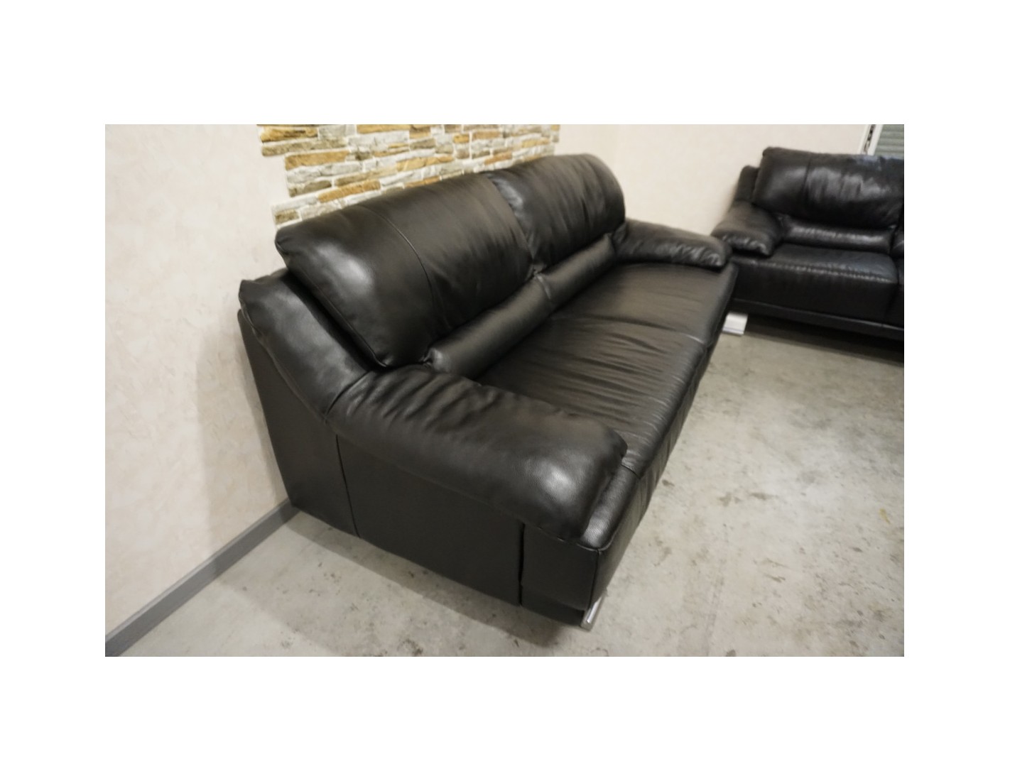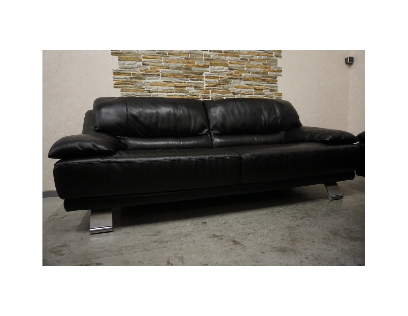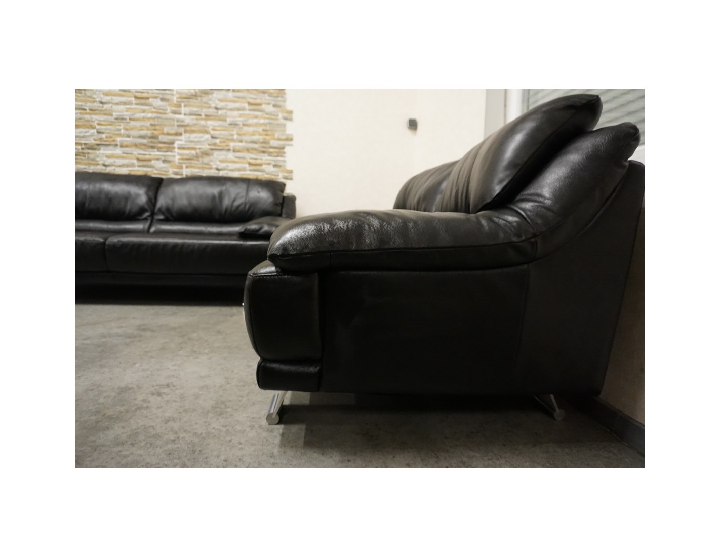 Elegancki zestaw wypoczynkowy wykonany ze skóry naturalnej w kolorze czarnym w układzie 3+2. Klasyczna forma oraz ponadczasowa kolorystyka sprawiają, że komplet doskonale pasuje zarówno do nowoczesnych, jak i bardziej tradycyjnych wnętrz.