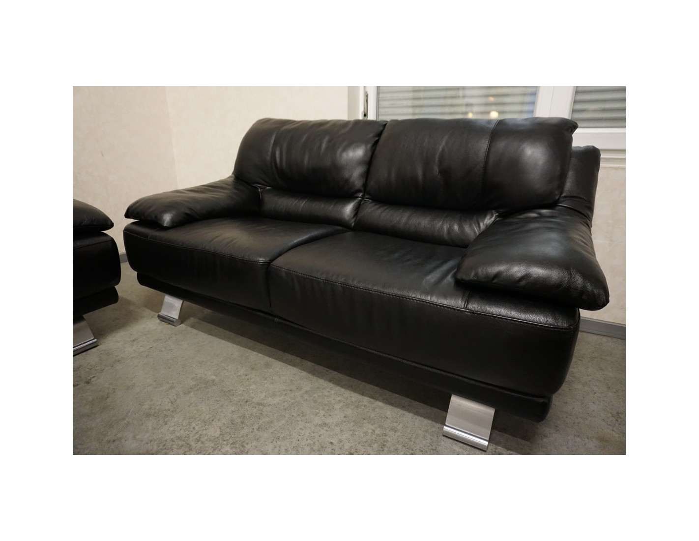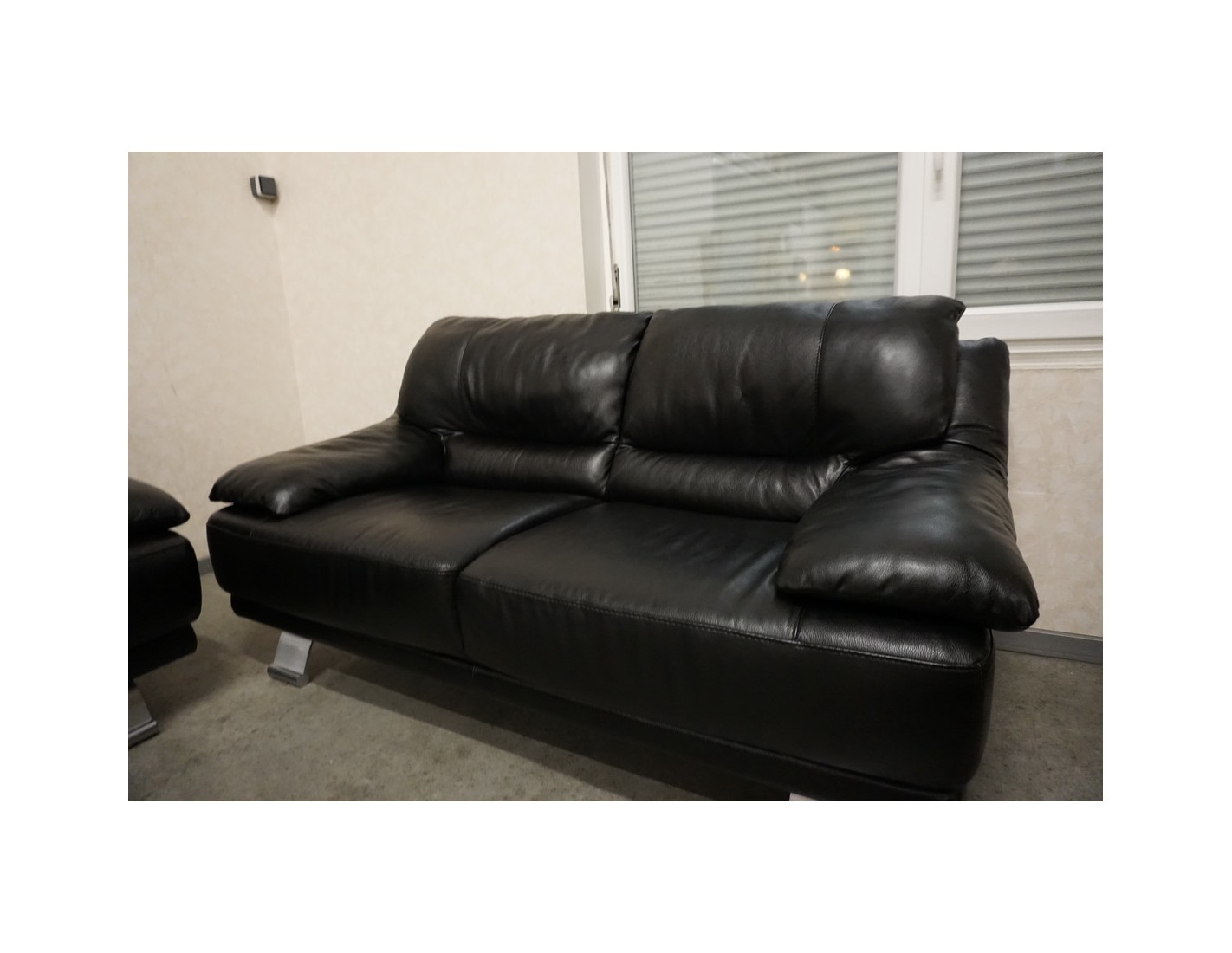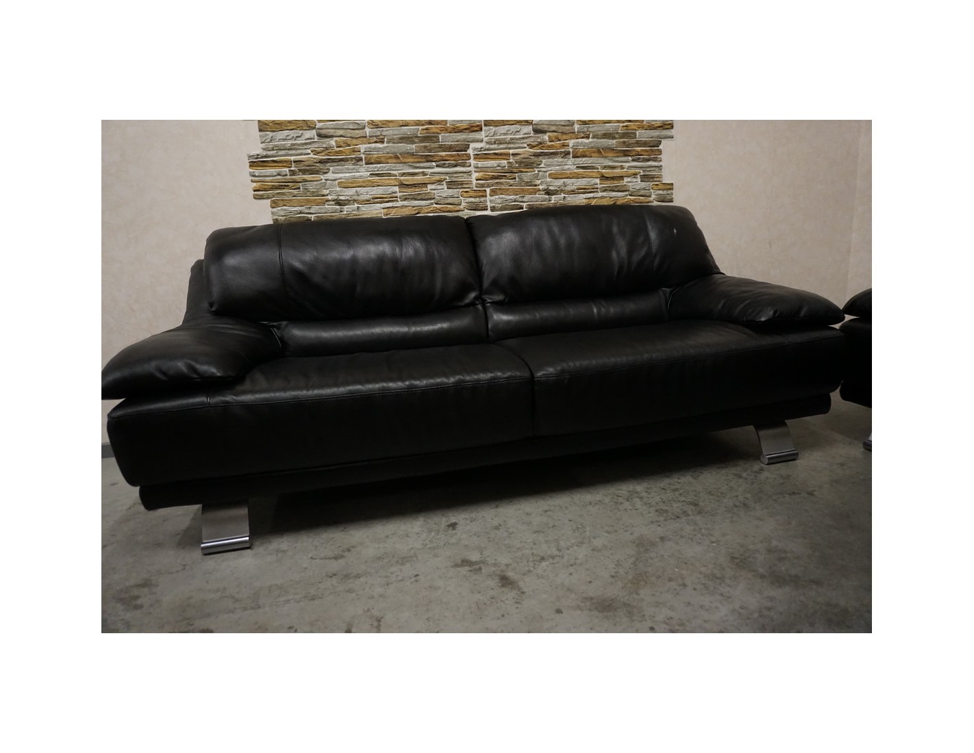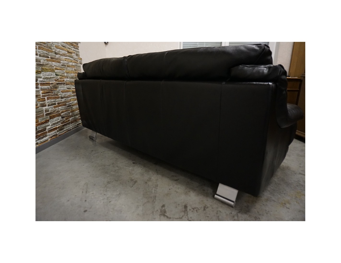Elegancki zestaw wypoczynkowy wykonany ze skóry naturalnej w kolorze czarnym w układzie 3+2. Klasyczna forma oraz ponadczasowa kolorystyka sprawiają, że komplet doskonale pasuje zarówno do nowoczesnych, jak i bardziej tradycyjnych wnętrz.