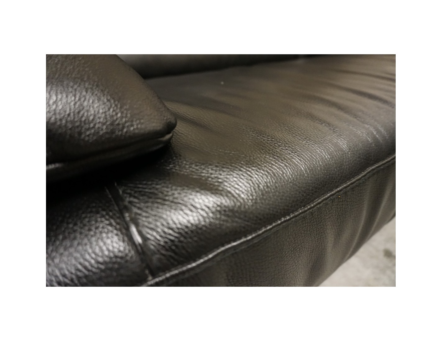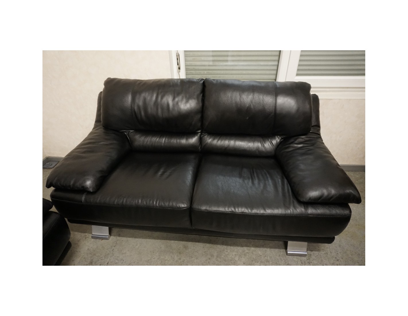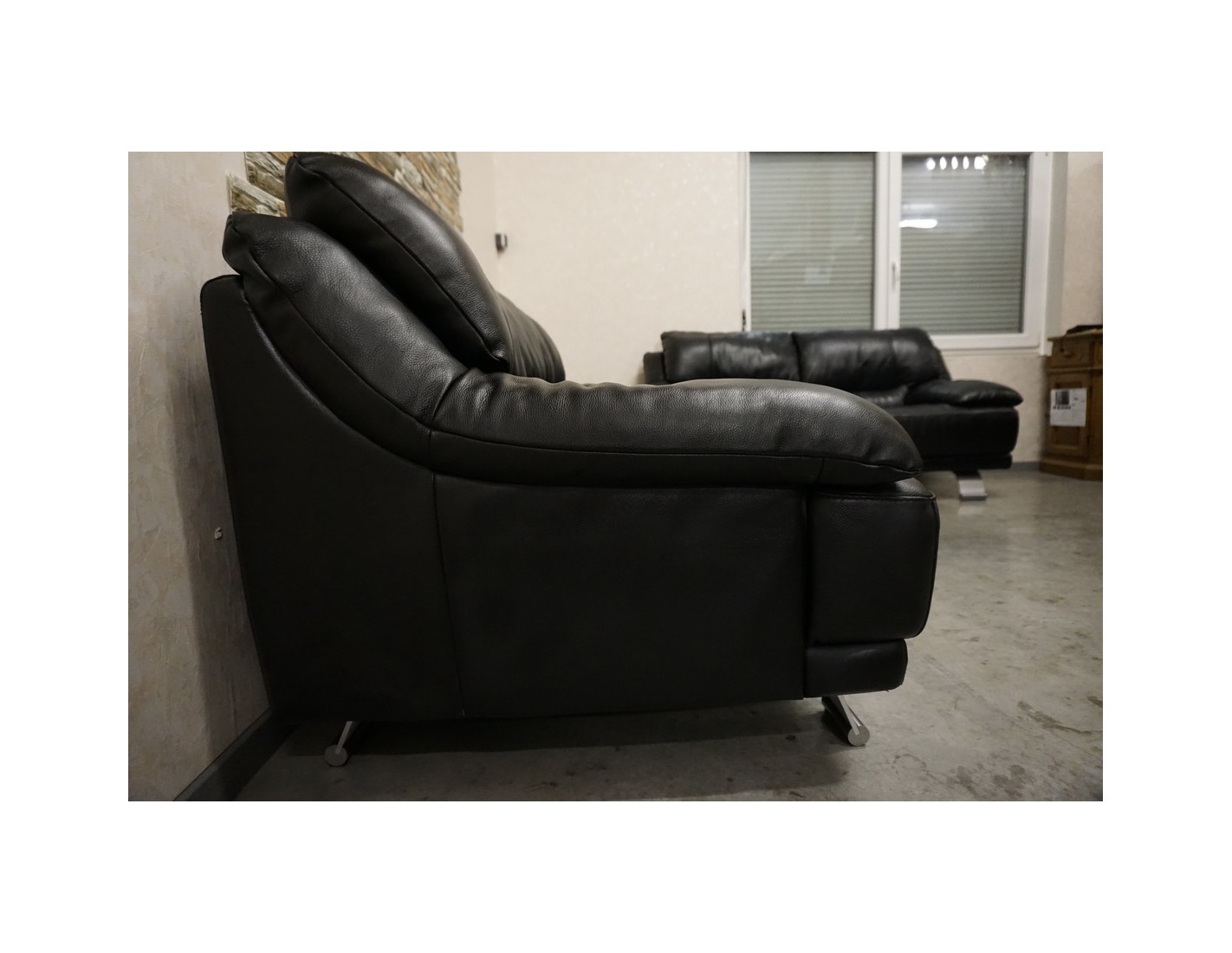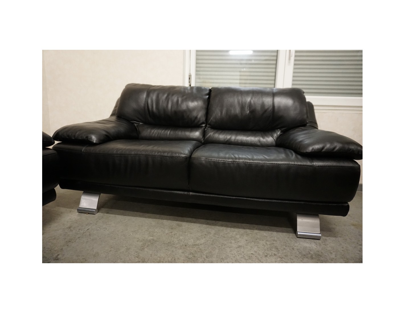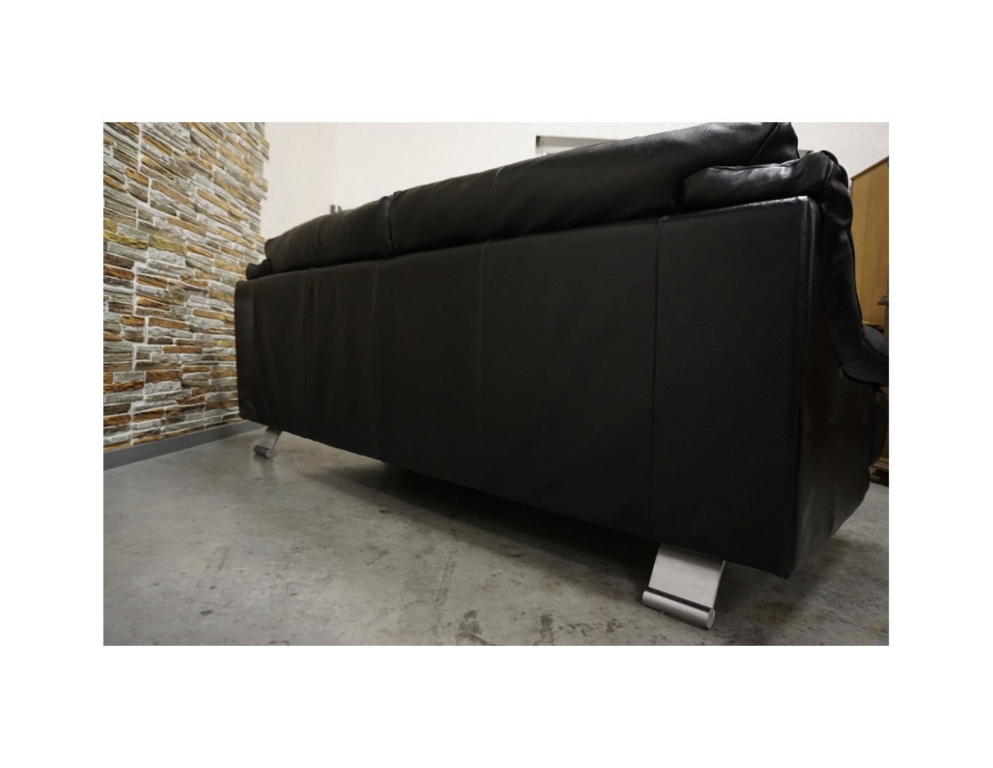 Elegancki zestaw wypoczynkowy wykonany ze skóry naturalnej w kolorze czarnym w układzie 3+2. Klasyczna forma oraz ponadczasowa kolorystyka sprawiają, że komplet doskonale pasuje zarówno do nowoczesnych, jak i bardziej tradycyjnych wnętrz.
