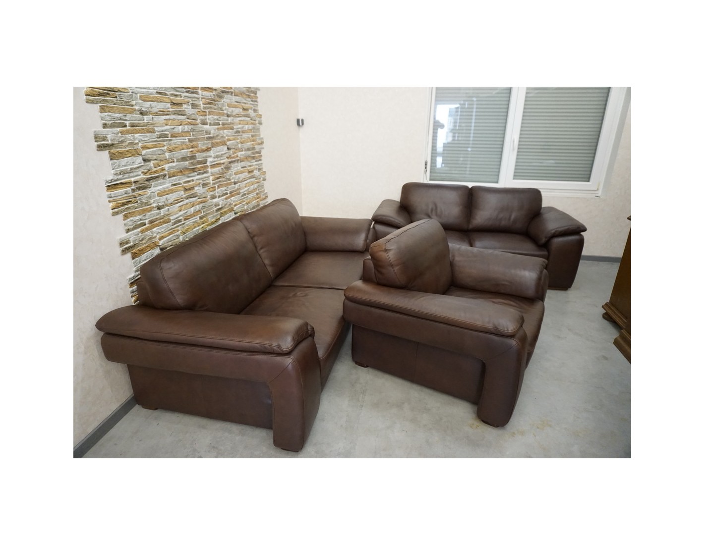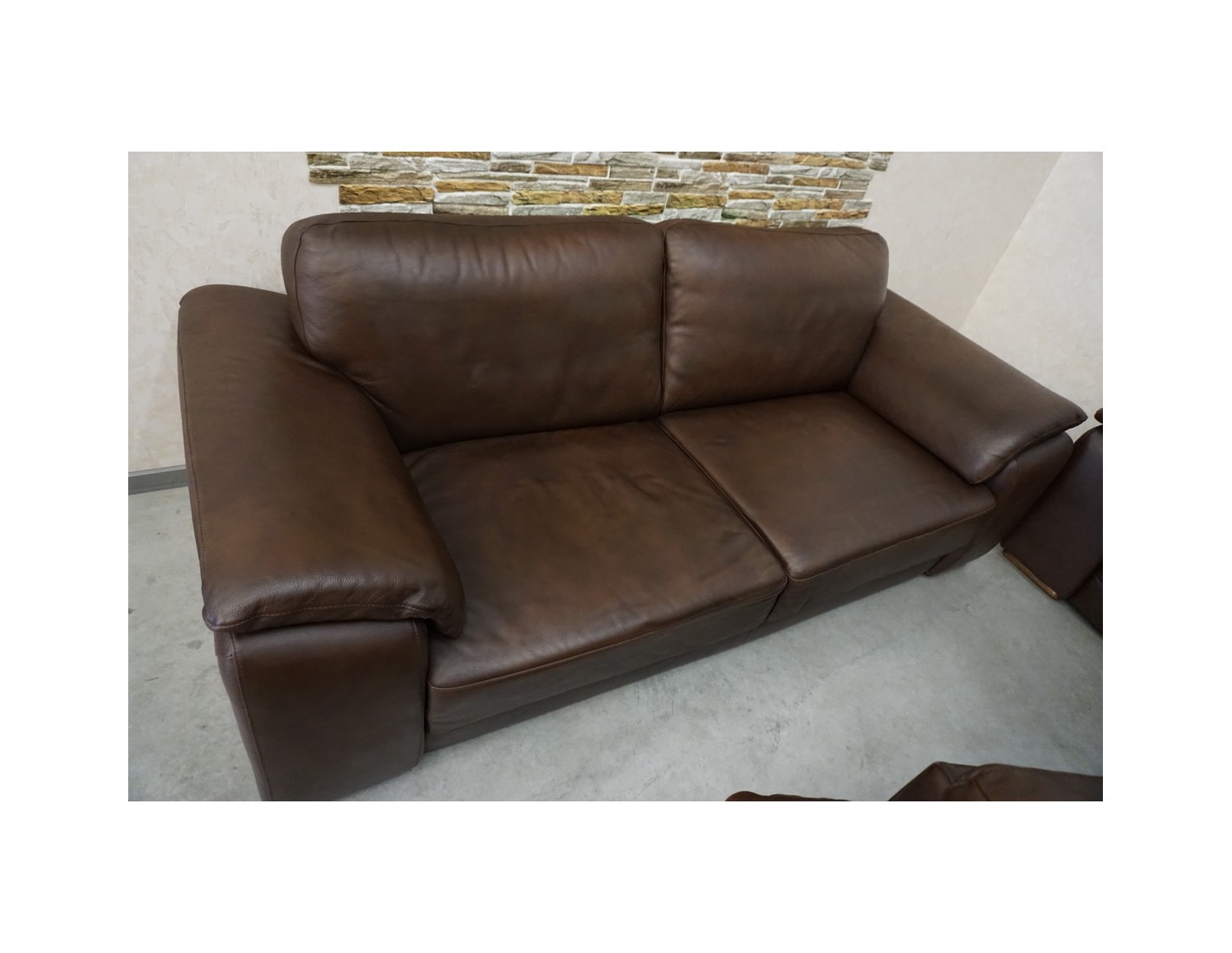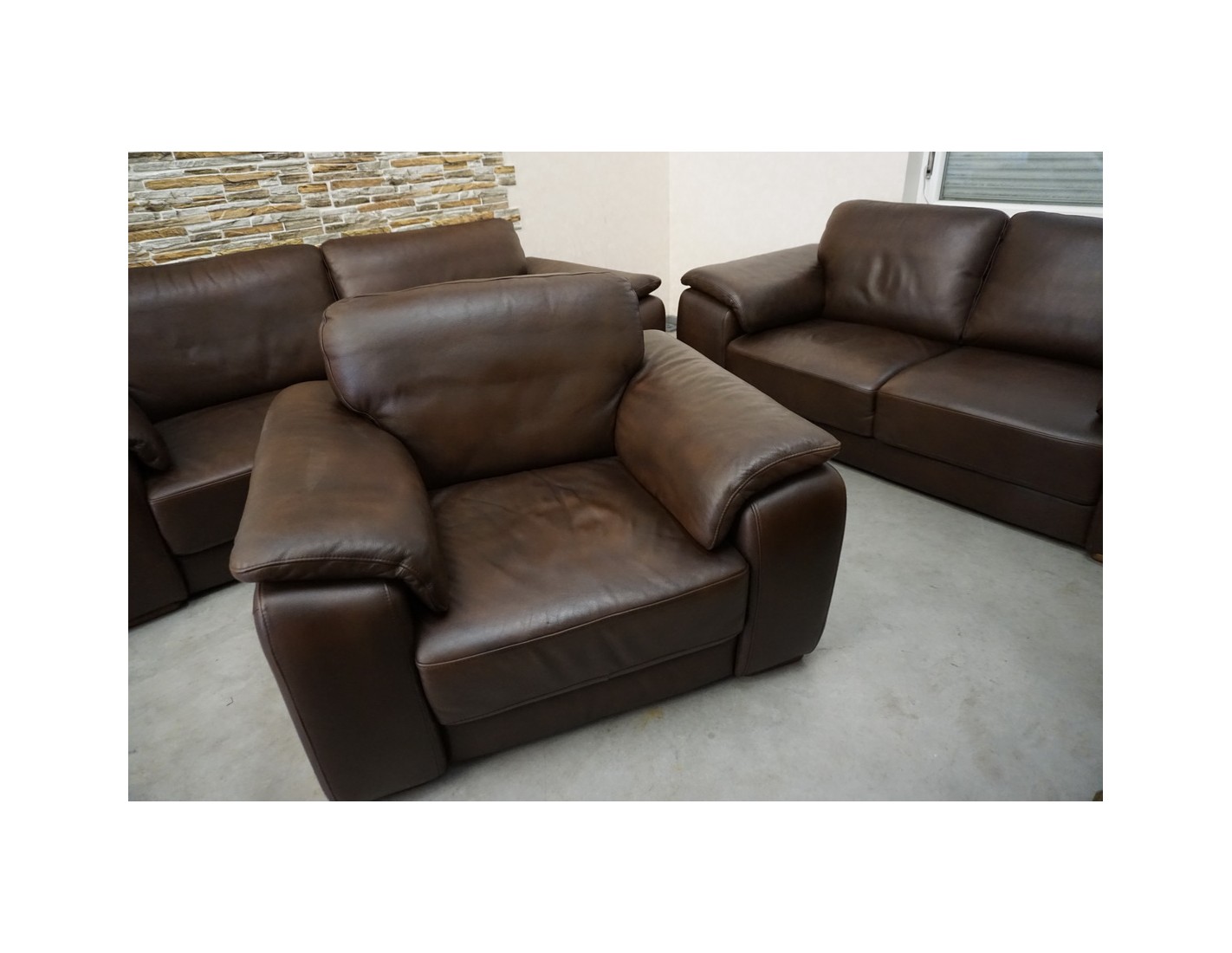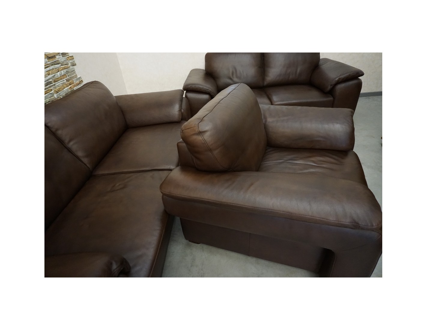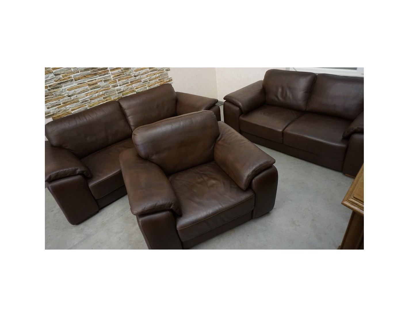 Elegancki zestaw wypoczynkowy wykonany ze skóry naturalnej w brązowym, cieniowanym wybarwieniu. Komplet w układzie 3+2+1 składa się z sofy trzyosobowej, sofy dwuosobowej oraz wygodnego fotela, tworząc komfortową przestrzeń do wypoczynku w salonie.