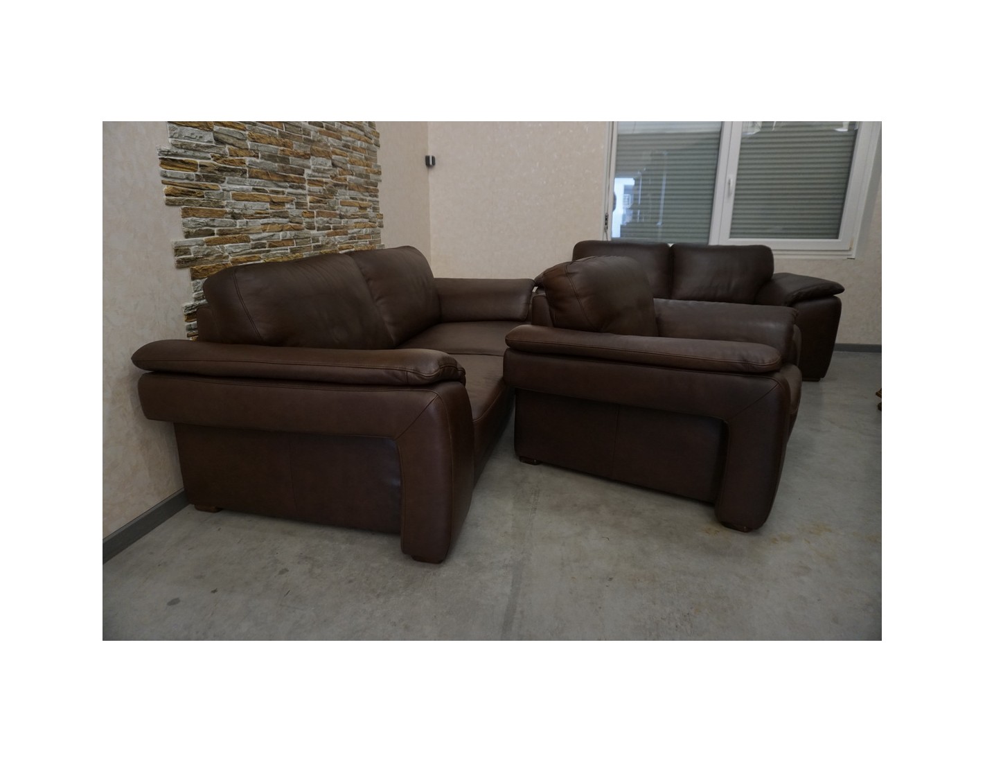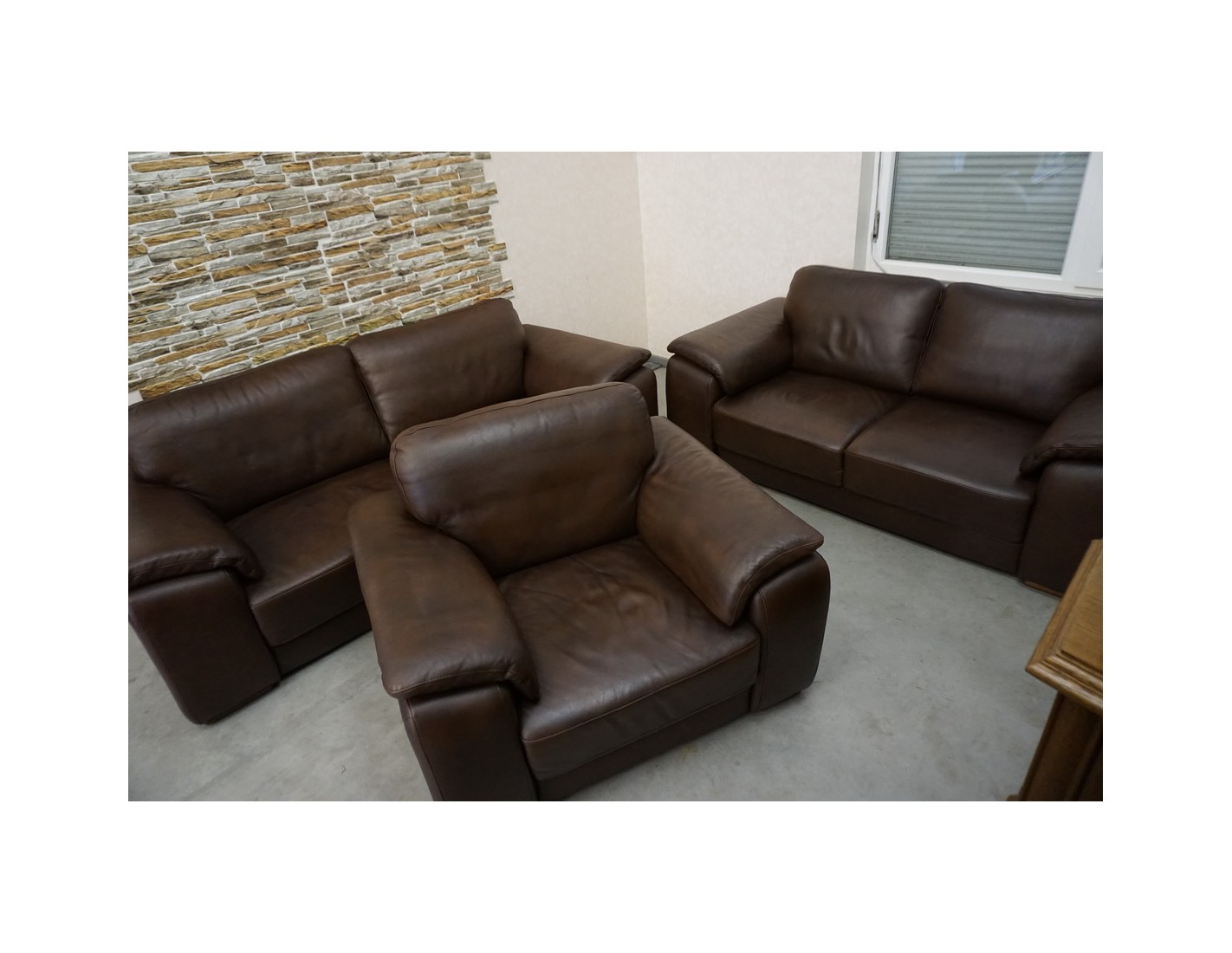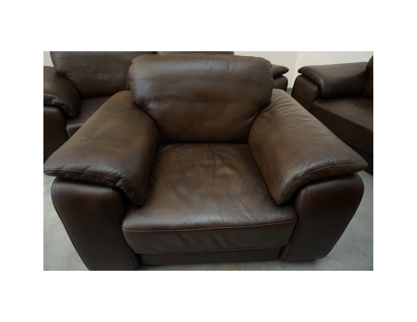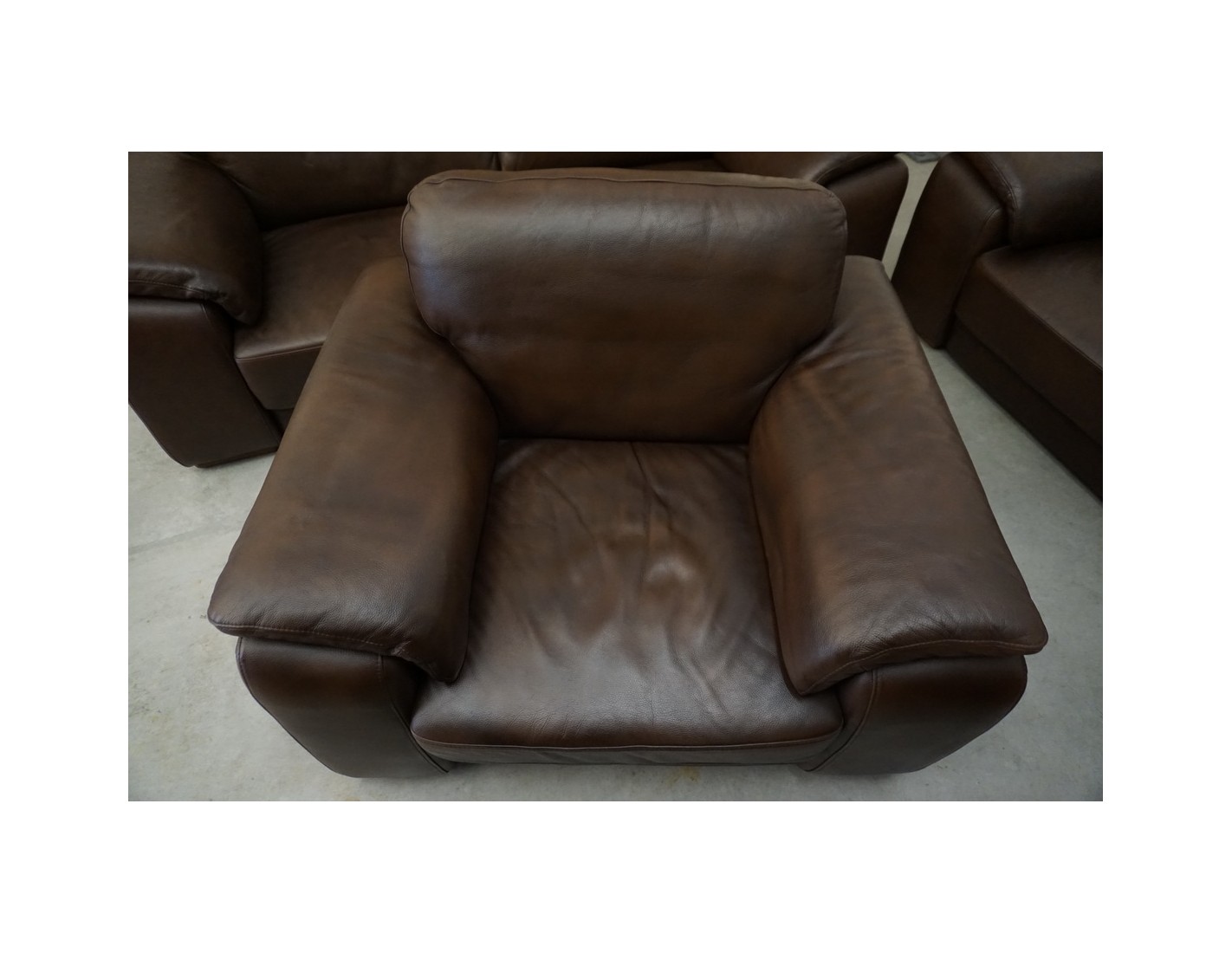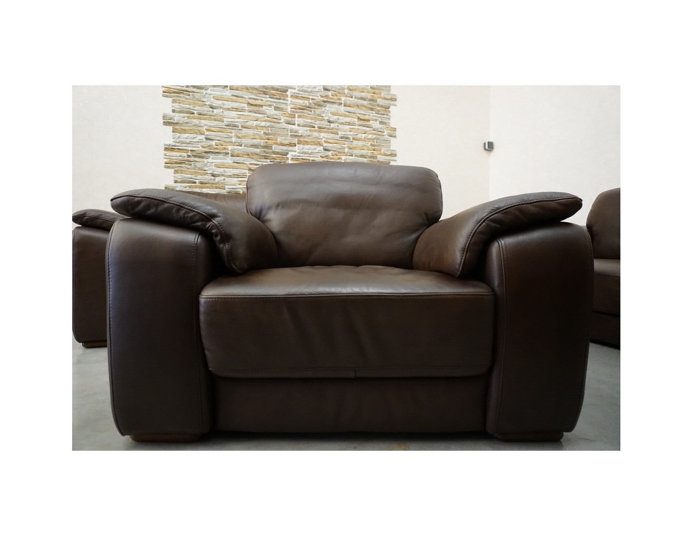 Elegancki zestaw wypoczynkowy wykonany ze skóry naturalnej w brązowym, cieniowanym wybarwieniu. Komplet w układzie 3+2+1 składa się z sofy trzyosobowej, sofy dwuosobowej oraz wygodnego fotela, tworząc komfortową przestrzeń do wypoczynku w salonie.